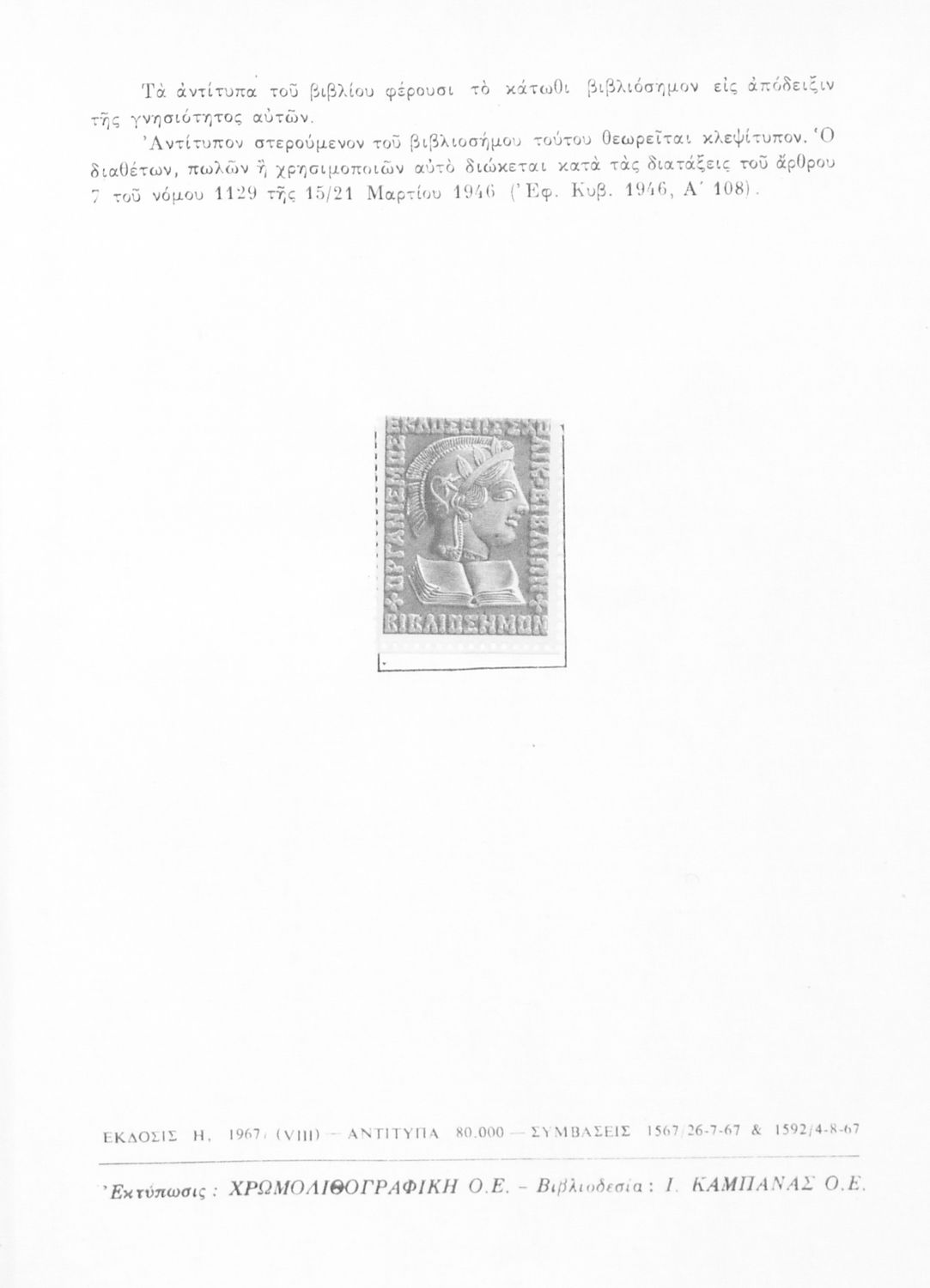 Εκδότης: Οργανισμός Εκδόσεως Διδακτικών Βιβλίων Έτος έκδοσης: 1967 Τόπος έκδοσης: Αθήνα Έκδοση: 8η Υπουργική απόφαση / Σύμβαση: 1567/ 26-7-1967, 1592/ 4-8-1967 Έτος έγκρισης: 1967 |