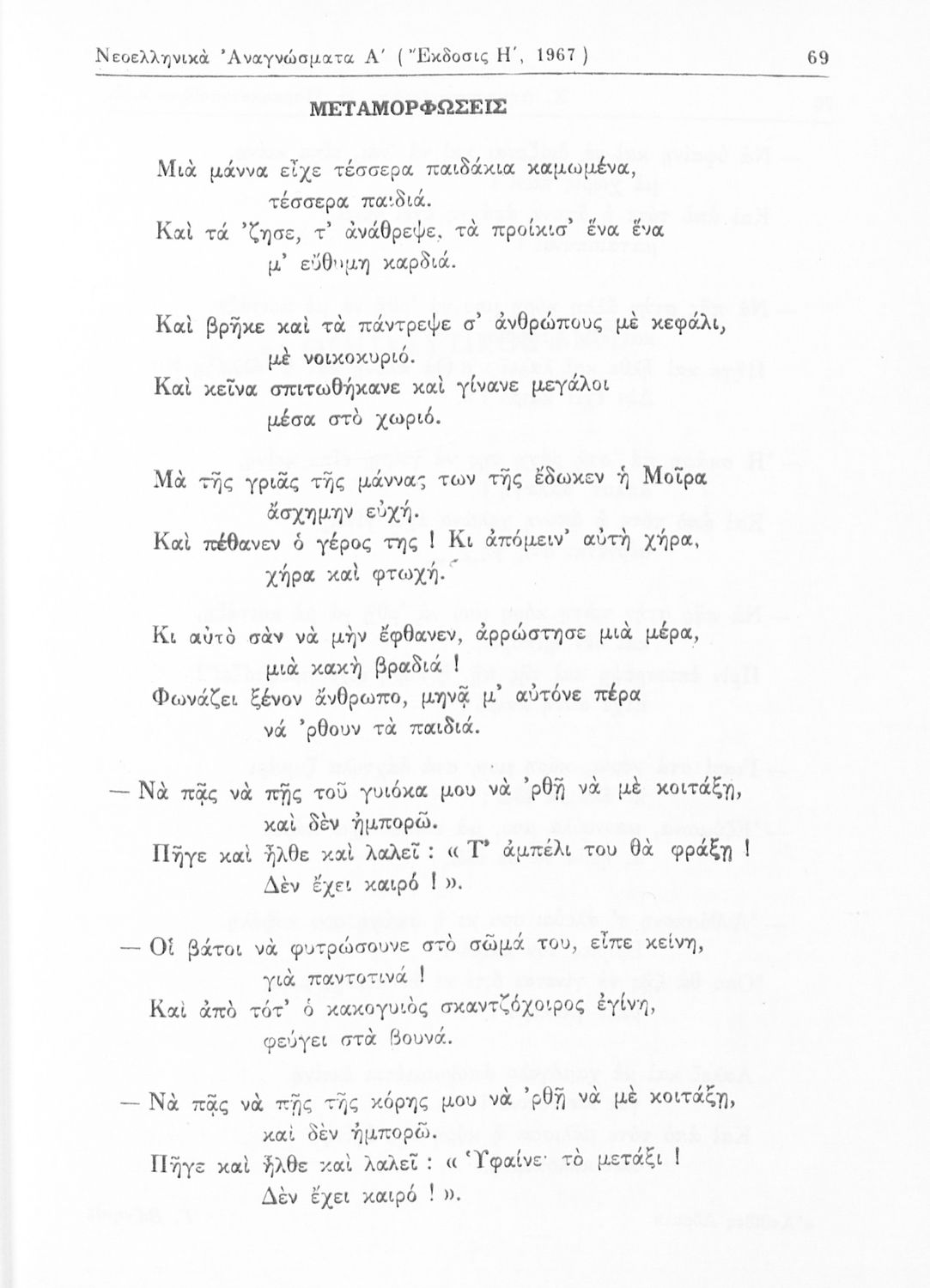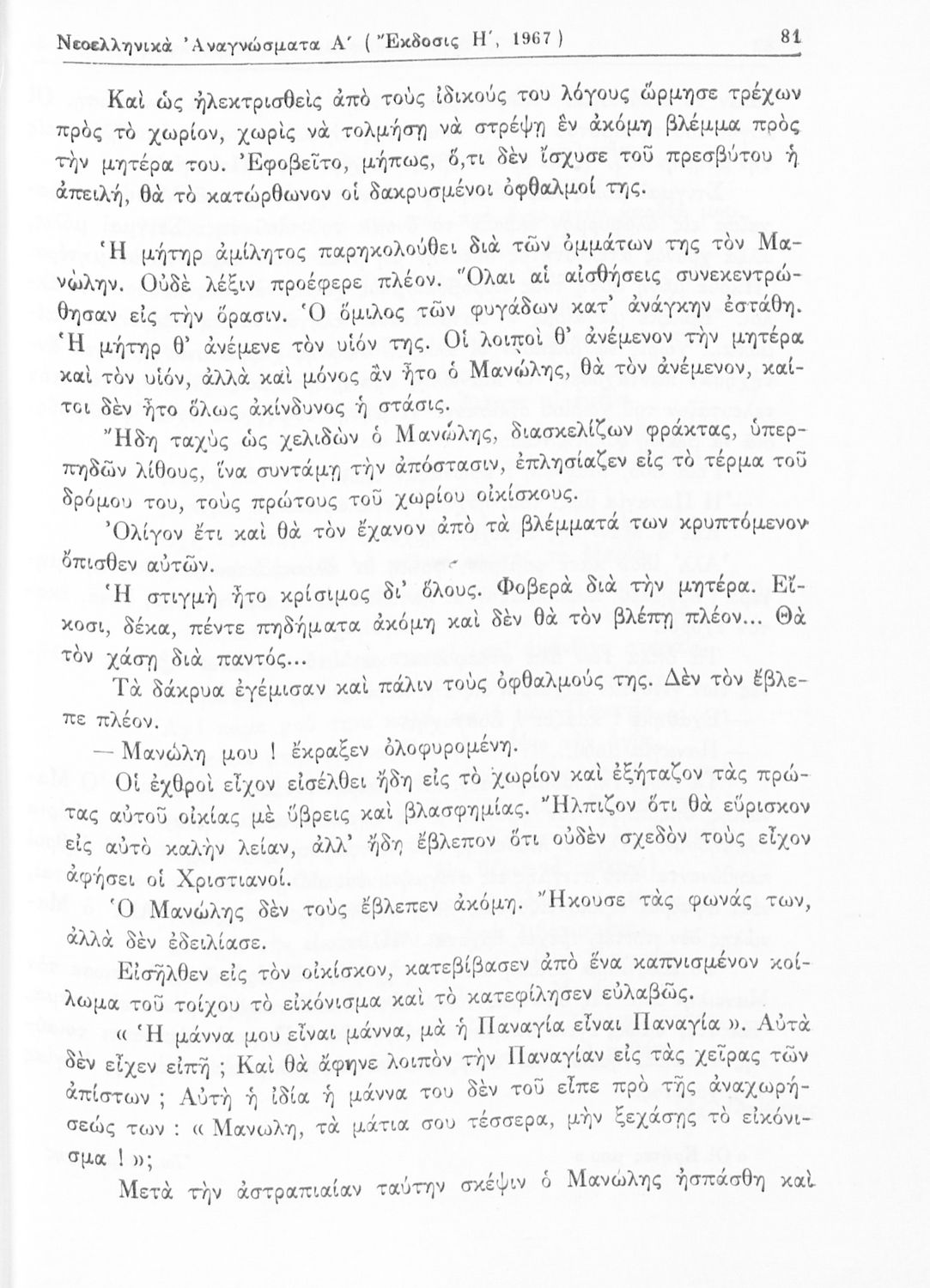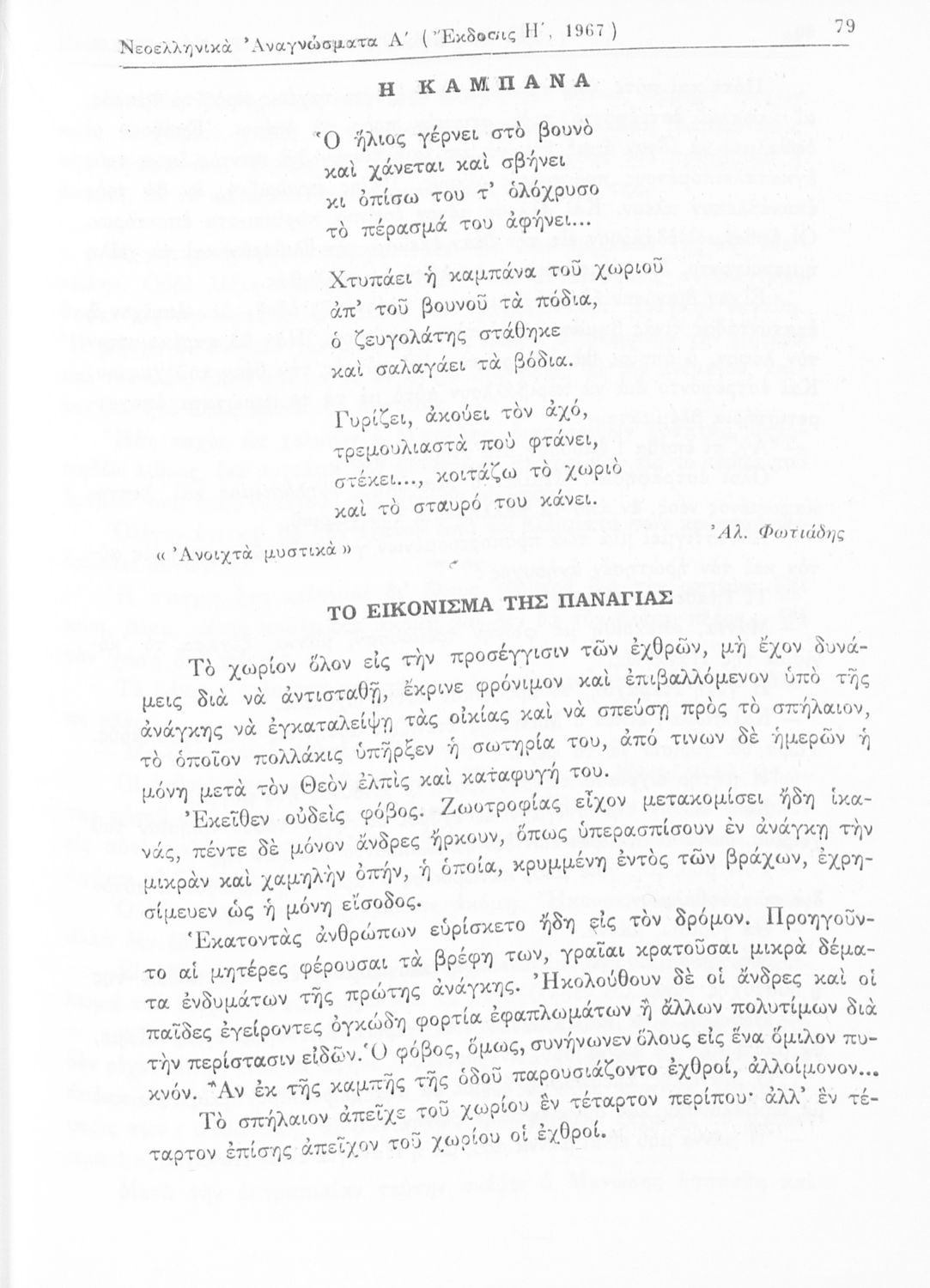 Σχολικό εγχειρίδιο Νέων Ελληνικών Α' Γυμνασίου που περιέχει ποιήματα και πεζά Ελλήνων συγγραφέων εμπνευσμένα από την αρχαία ελληνική ιστορία και μυθολογία, τη βυζαντινή και σύγχρονη ελληνική ιστορία και την καθημερινή ζωή. Περιέχει παράρτημα με βιογραφίες των συγγραφέων και λεξιλόγιο.