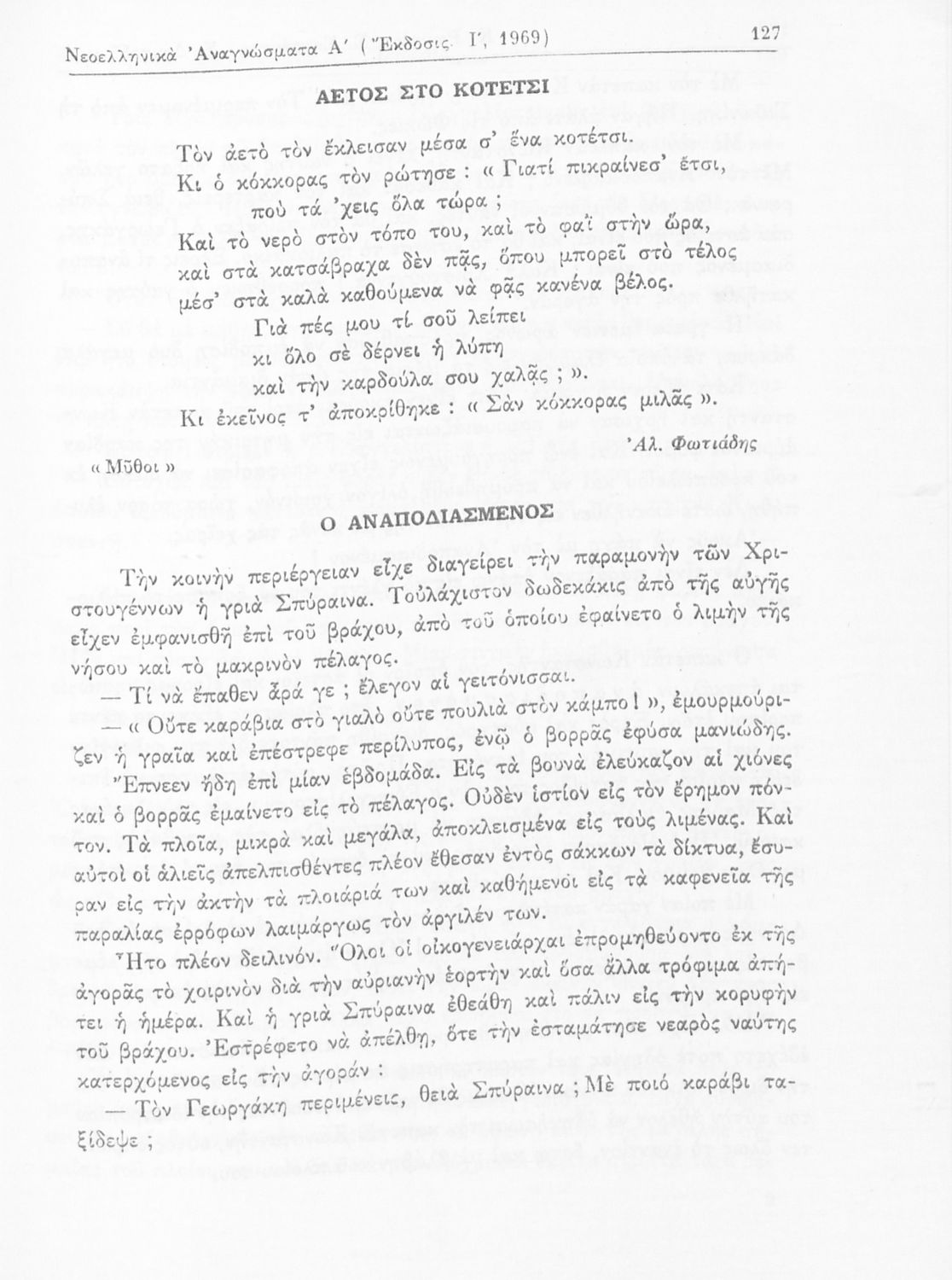 Σχολικό εγχειρίδιο Νέων Ελληνικών Γ΄ Γυμνασίου και Α' Αστικού Σχολείου που περιέχει πεζά και ποιήματα Ελλήνων συγγραφέων εμπνευσμένα από τη θρησκευτική και κοινωνική ζωή, την ελληνική μυθολογία, την αρχαία και