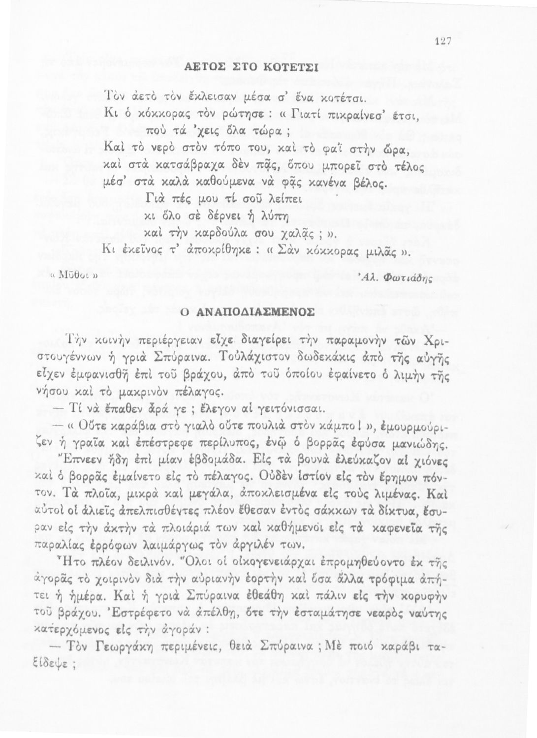 Σχολικό εγχειρίδιο Νέων Ελληνικών Γ΄ Γυμνασίου και Α' Αστικού Σχολείου που περιέχει πεζά και ποιήματα Ελλήνων συγγραφέων εμπνευσμένα από τη θρησκευτική και κοινωνική ζωή, την ελληνική μυθολογία, την αρχαία και