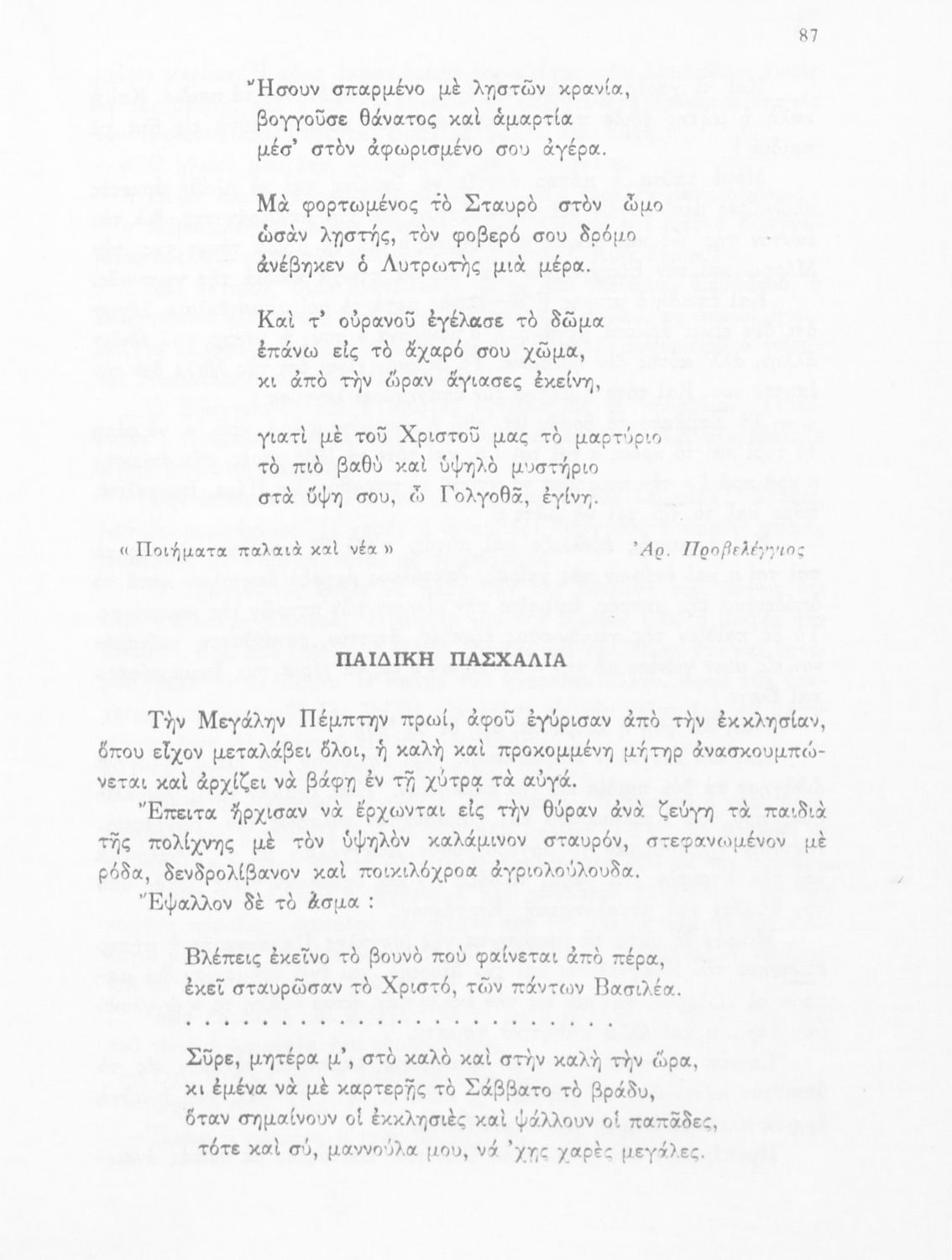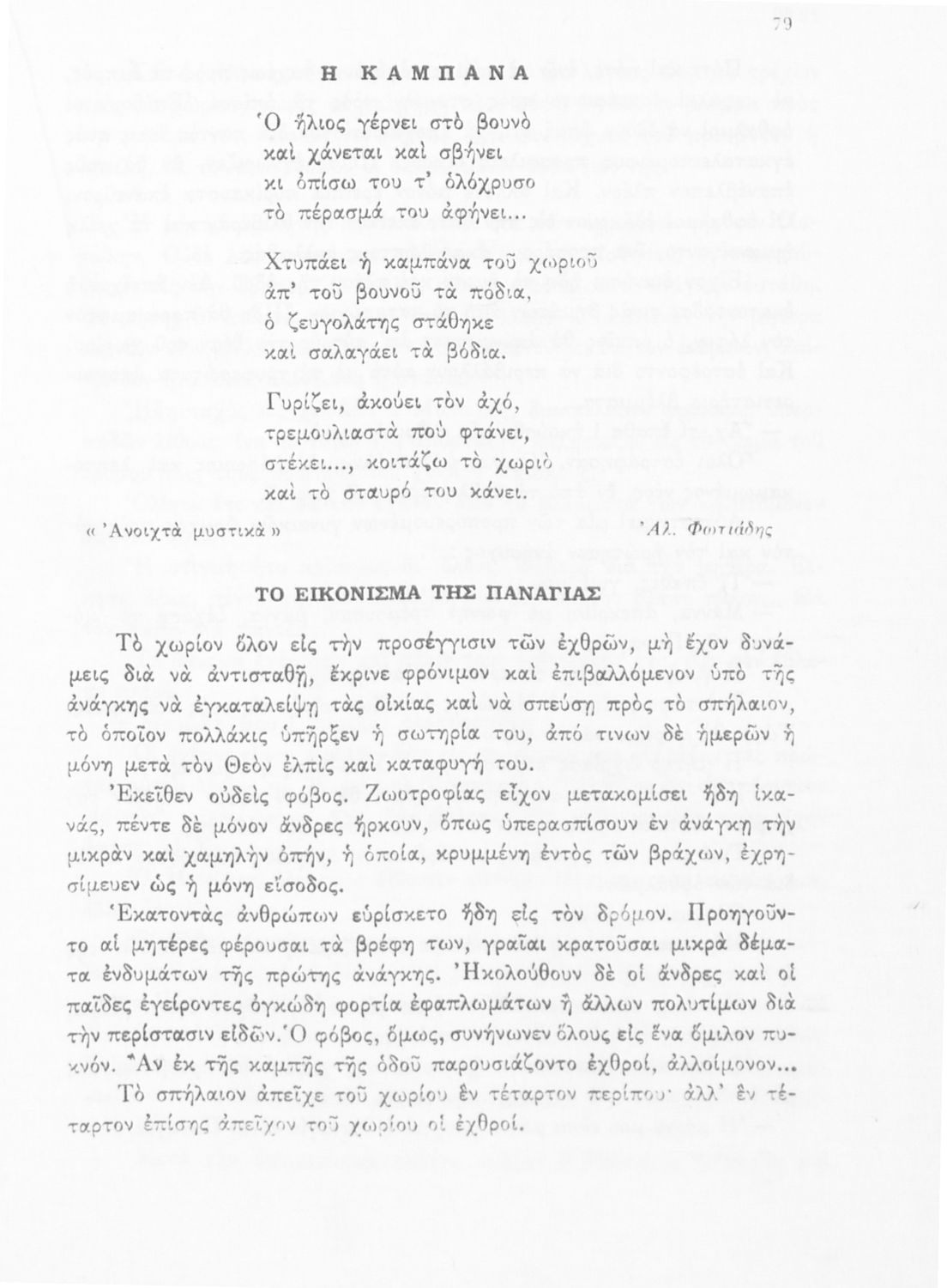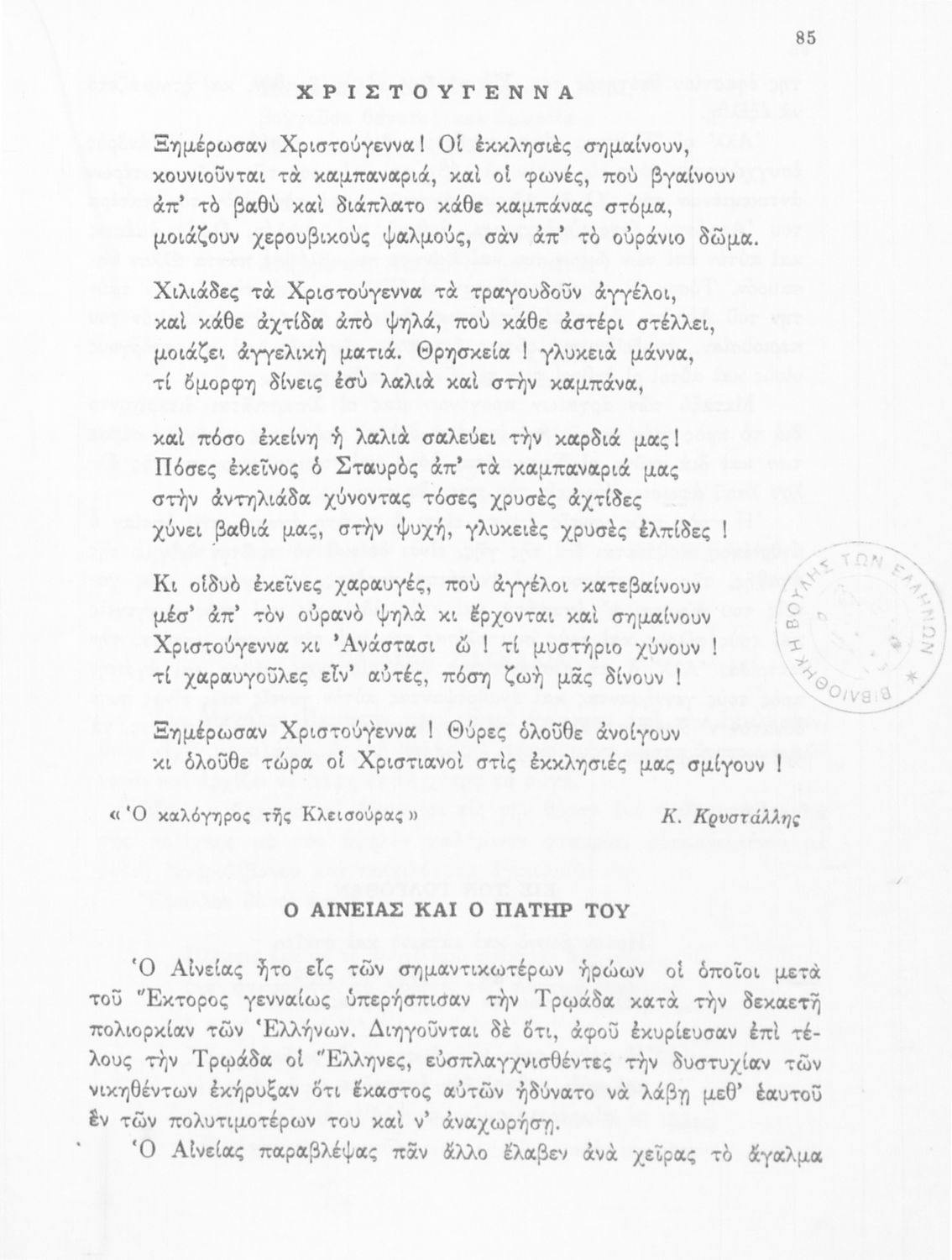 Σχολικό εγχειρίδιο Νέων Ελληνικών Γ΄ Γυμνασίου και Α' Αστικού Σχολείου που περιέχει πεζά και ποιήματα Ελλήνων συγγραφέων εμπνευσμένα από τη θρησκευτική και κοινωνική ζωή, την ελληνική μυθολογία, την αρχαία και
