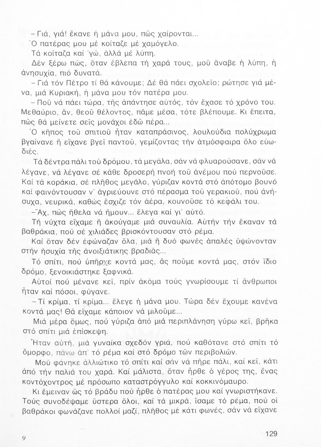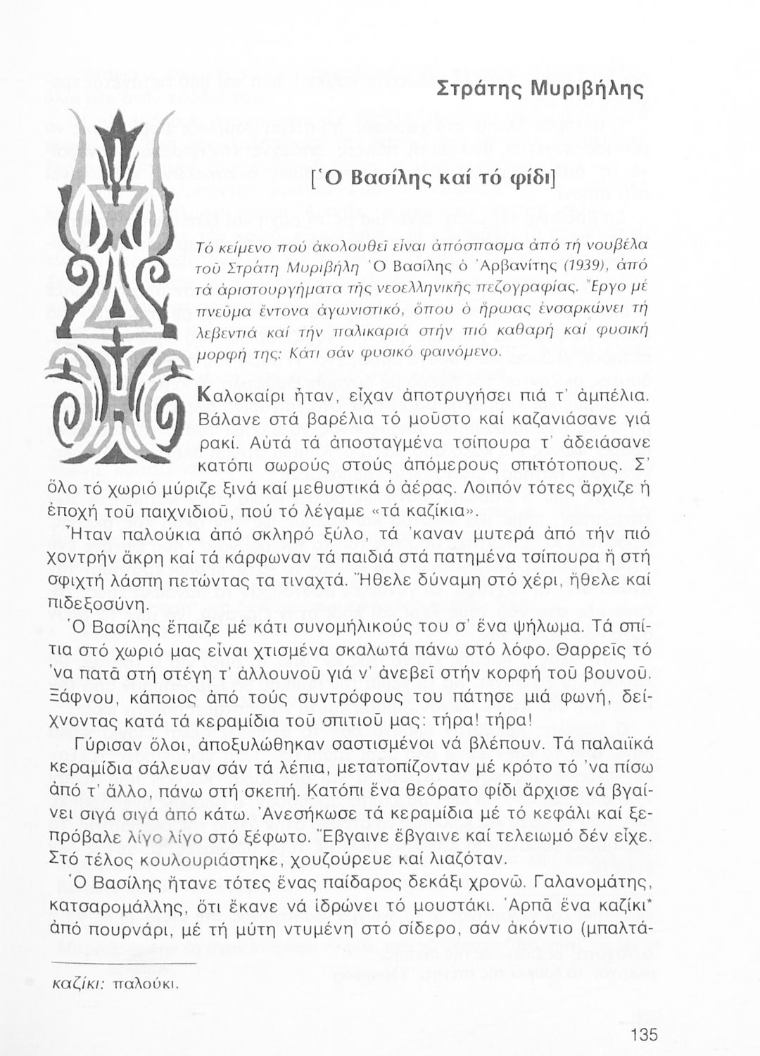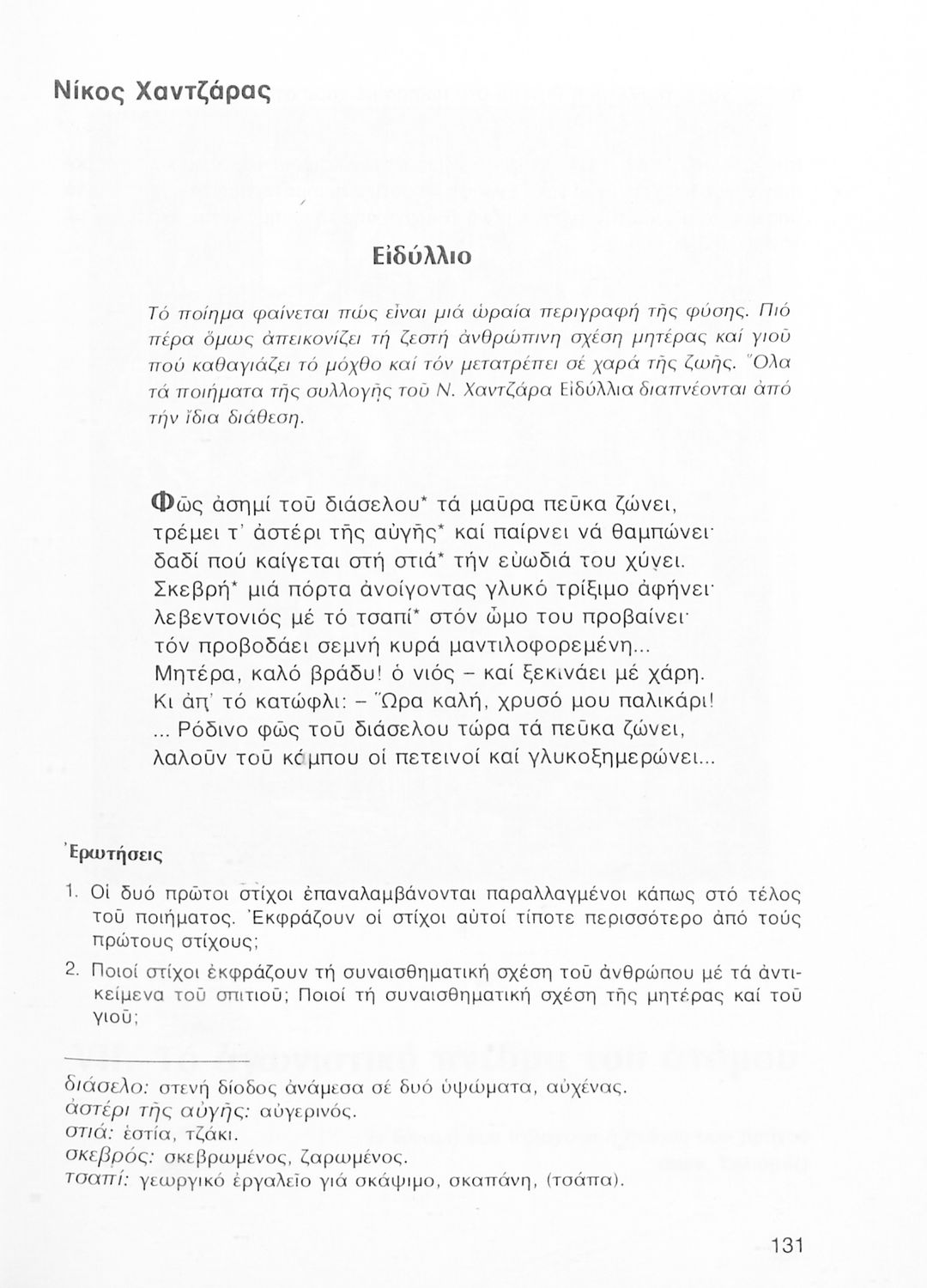 Σχολικό εγχειρίδιο Νέων Ελληνικών Α΄ Γυμνασίου που περιλαμβάνει δοκίμια, πεζά και ποιήματα Ελλήνων συγγραφέων και δημοτικά τραγούδια εμπνευσμένα από τη θρησκευτική, εθνική και κοινωνική ζωή, τη "δοκιμασία της Κύπρου", και την ελληνική φύση. Περιέχει και έργα ευρωπαίων συγγραφέων.