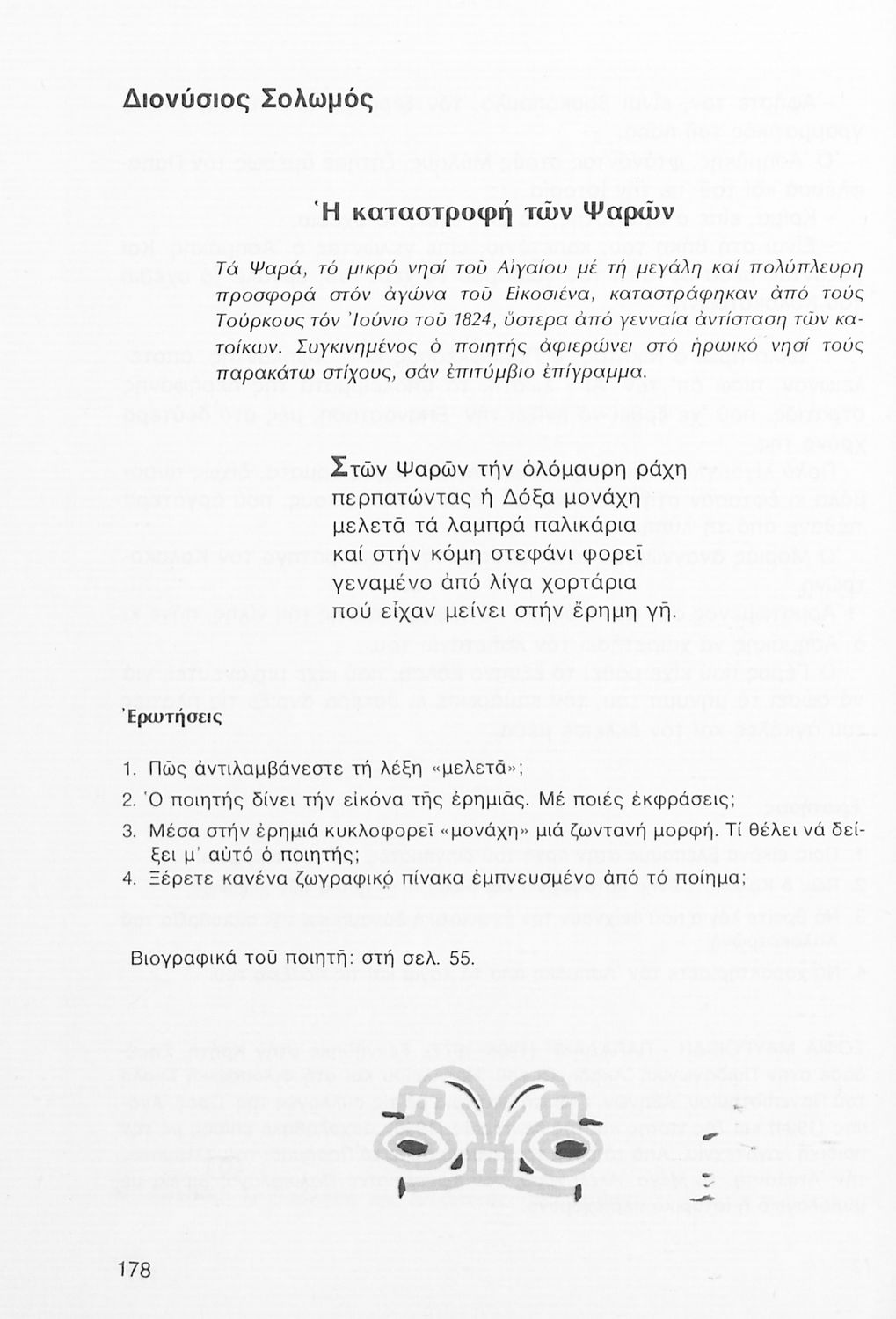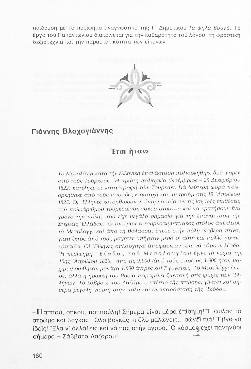 Σχολικό εγχειρίδιο Νέων Ελληνικών Α΄ Γυμνασίου που περιλαμβάνει δοκίμια, πεζά και ποιήματα Ελλήνων συγγραφέων και δημοτικά τραγούδια εμπνευσμένα από τη θρησκευτική, εθνική και κοινωνική ζωή, τη "δοκιμασία της Κύπρου", και την ελληνική φύση. Περιέχει και έργα ευρωπαίων συγγραφέων.