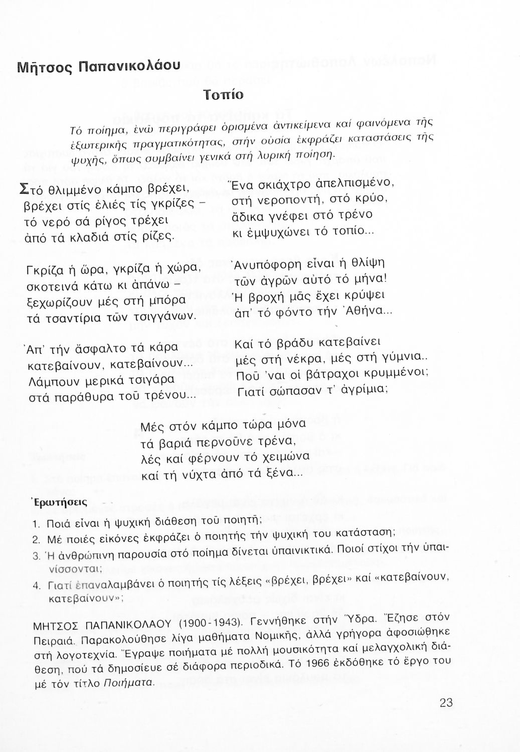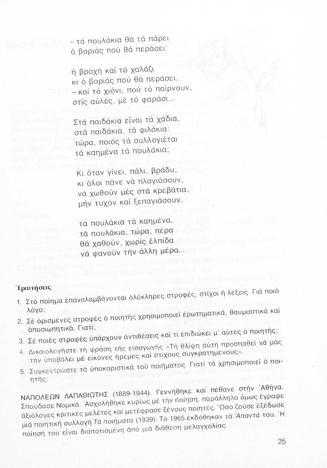Σχολικό εγχειρίδιο Νέων Ελληνικών Α΄ Λυκείου που περιλαμβάνει πεζά, ποιήματα, δοκίμια και θεατρικά έργα σύγχρονων Ελλήνων και κλασσικών ξένων συγγραφέων, ερωτήσεις και βιογραφικά σημειώματα