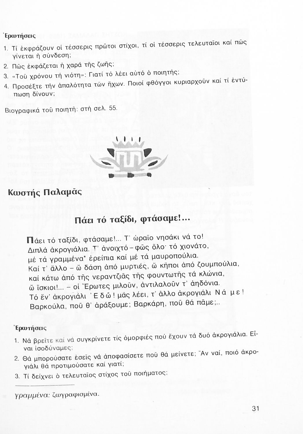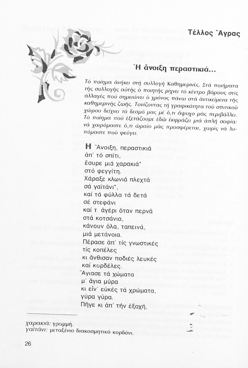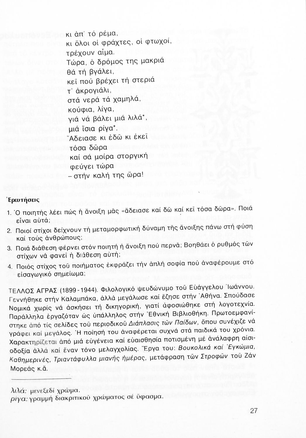 Σχολικό εγχειρίδιο Νέων Ελληνικών Α΄ Γυμνασίου που περιλαμβάνει δοκίμια, πεζά και ποιήματα Ελλήνων συγγραφέων και δημοτικά τραγούδια εμπνευσμένα από τη θρησκευτική, εθνική και κοινωνική ζωή, τη "δοκιμασία της Κύπρου", και την ελληνική φύση. Περιέχει και έργα ευρωπαίων συγγραφέων.