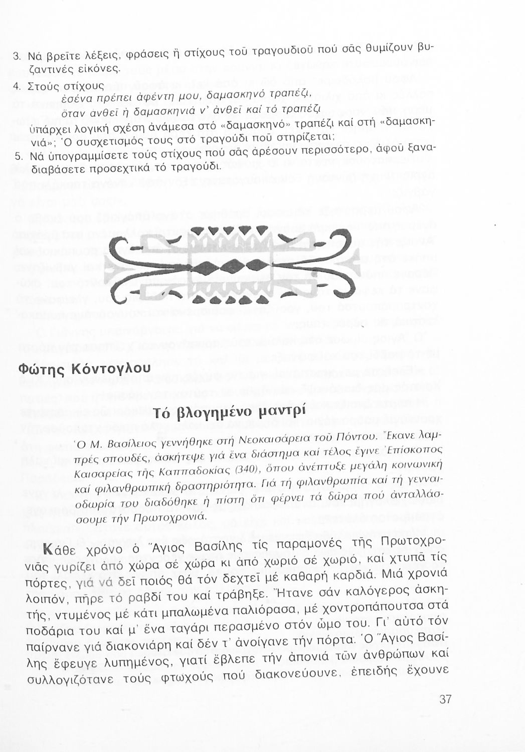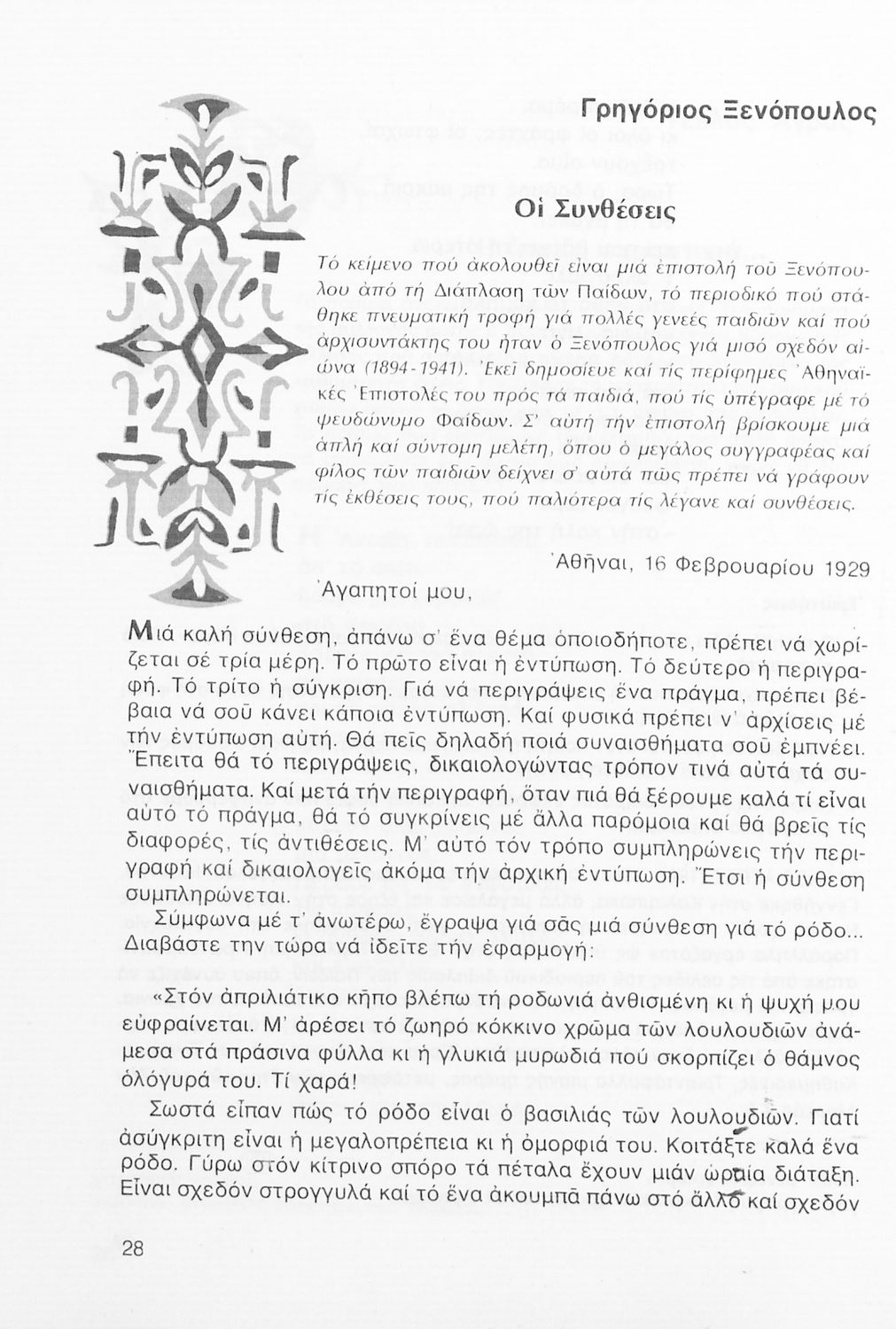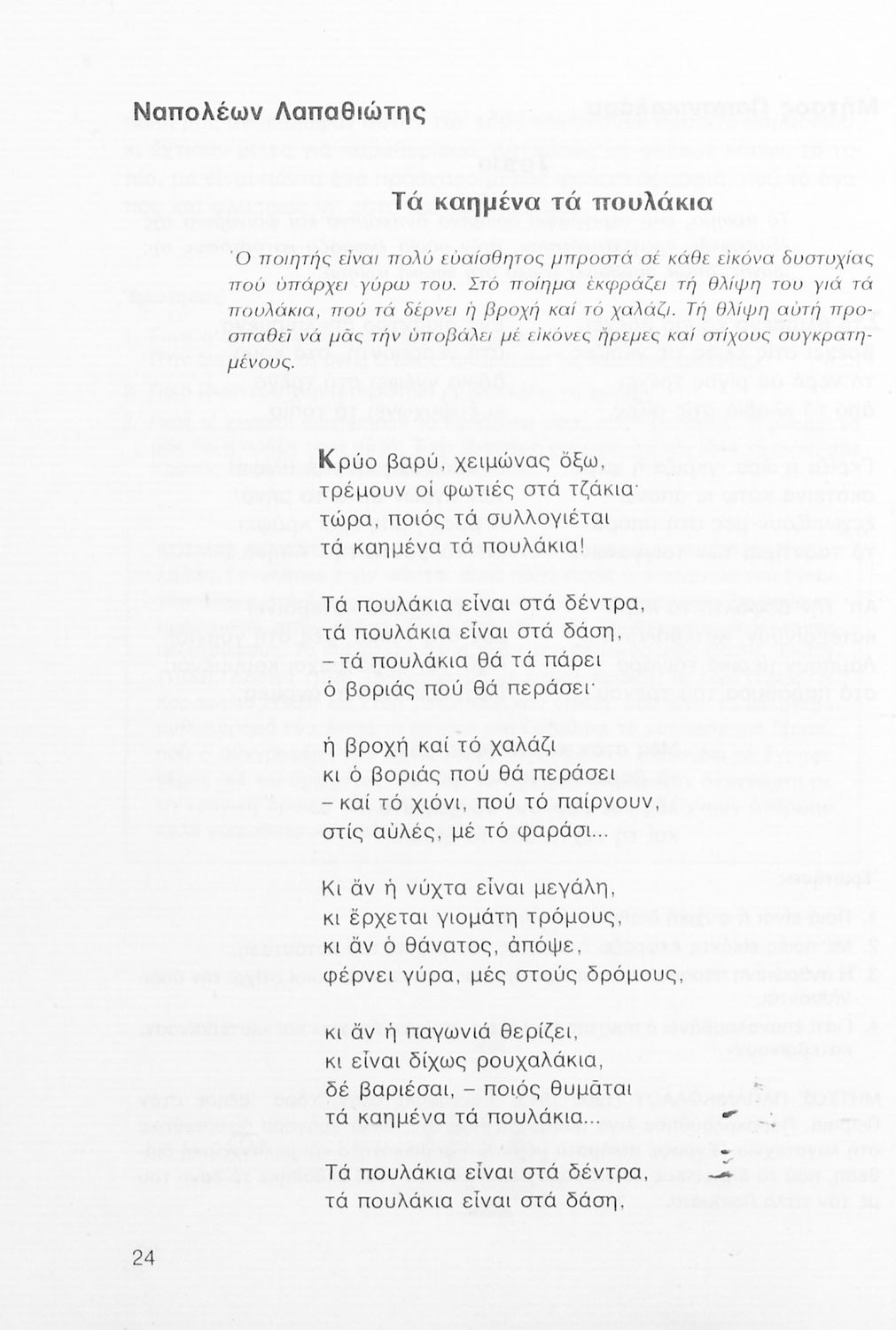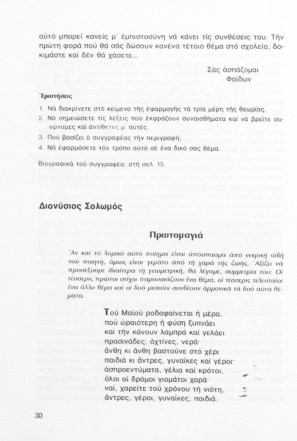 Σχολικό εγχειρίδιο Νέων Ελληνικών Α΄ Γυμνασίου που περιλαμβάνει δοκίμια, πεζά και ποιήματα Ελλήνων συγγραφέων και δημοτικά τραγούδια εμπνευσμένα από τη θρησκευτική, εθνική και κοινωνική ζωή, τη "δοκιμασία της Κύπρου", και την ελληνική φύση. Περιέχει και έργα ευρωπαίων συγγραφέων.