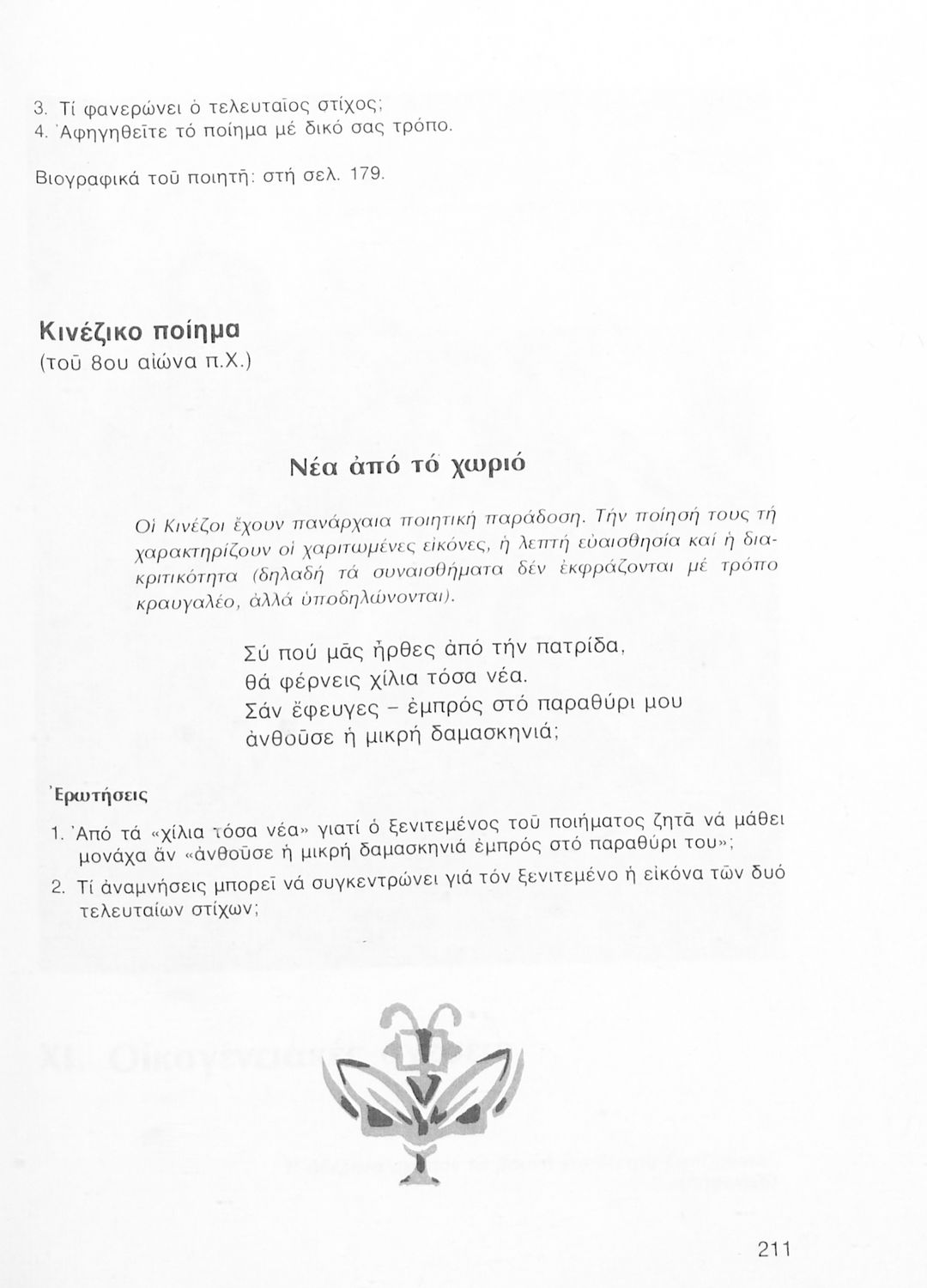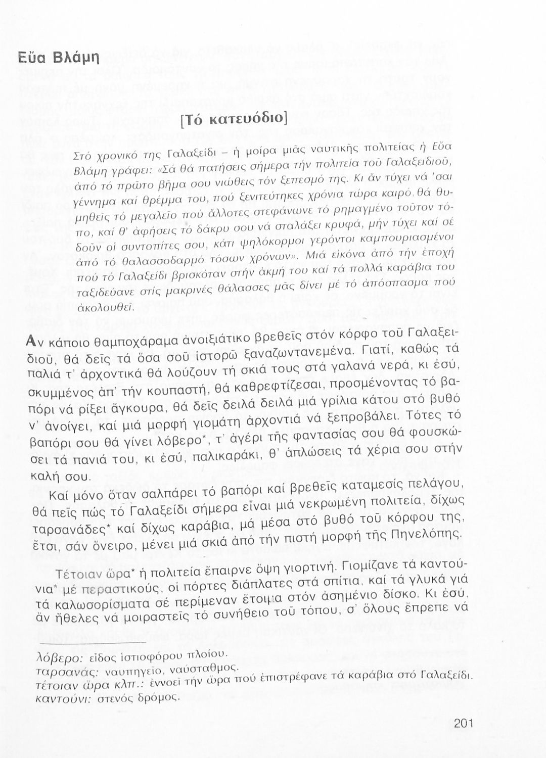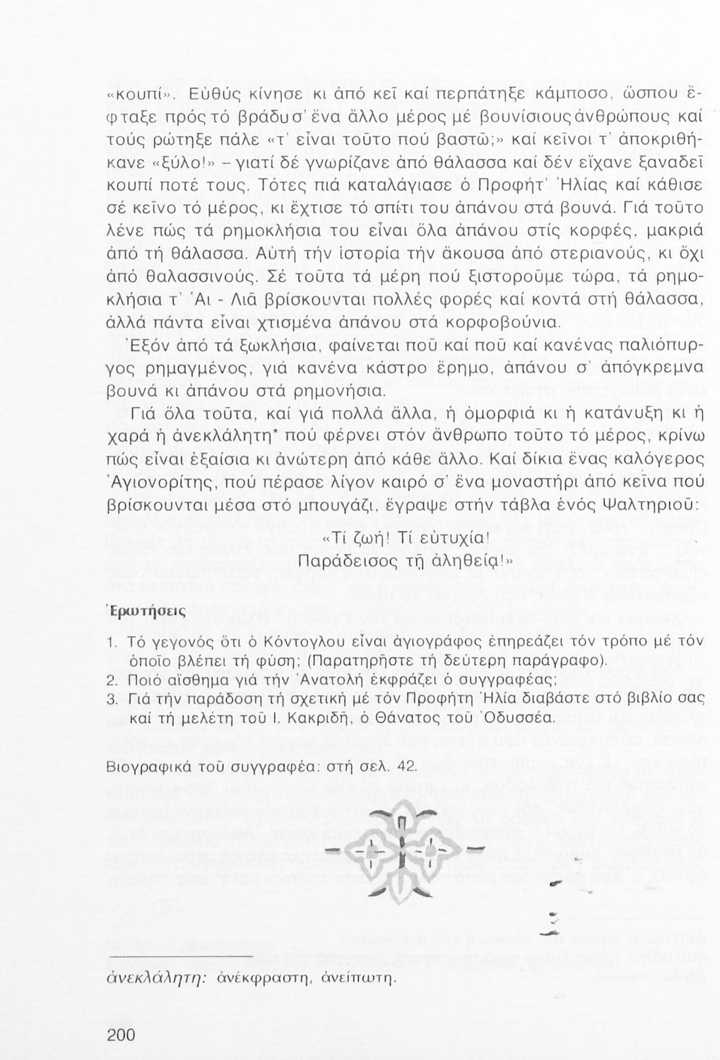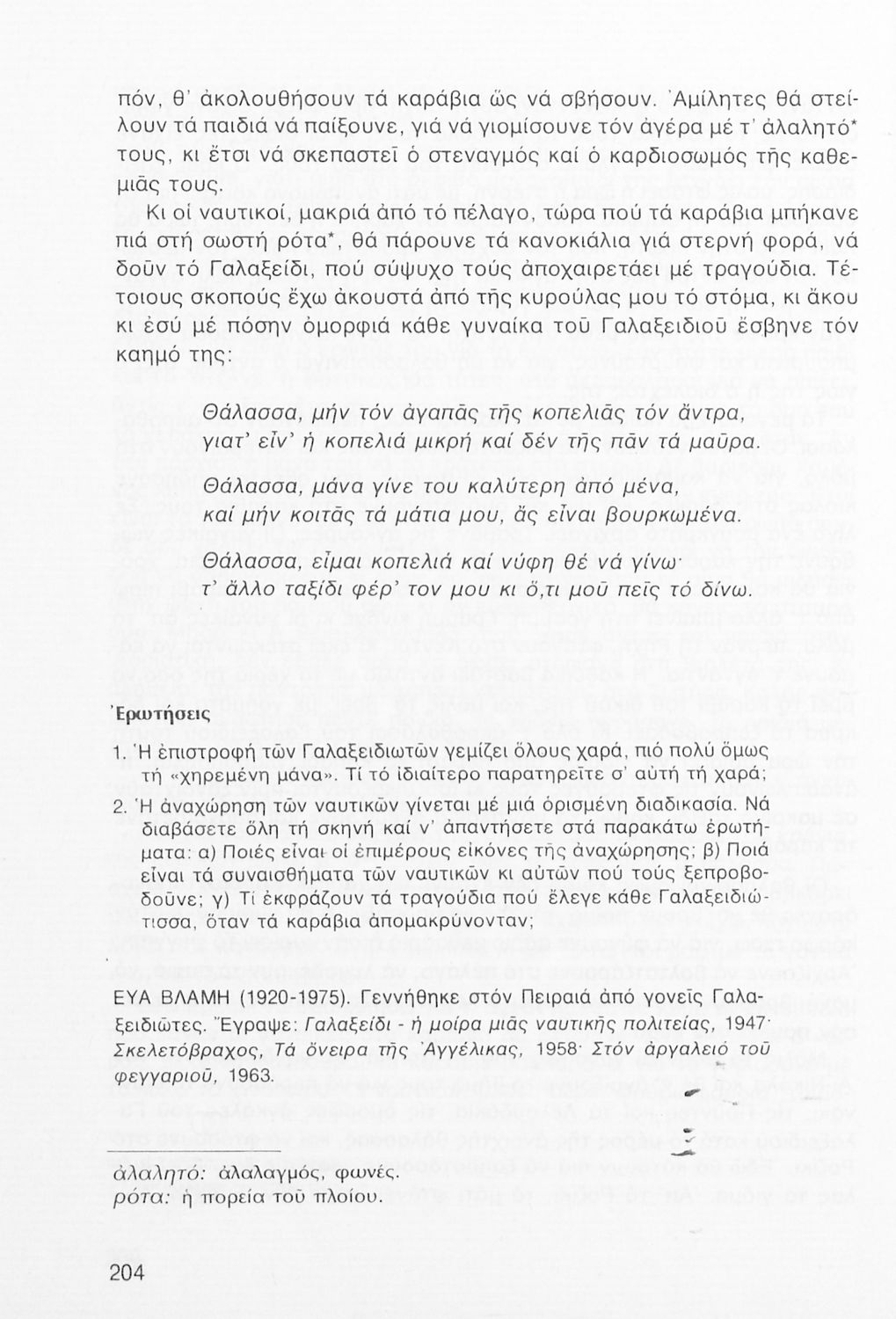 Σχολικό εγχειρίδιο Νέων Ελληνικών Α΄ Γυμνασίου που περιλαμβάνει δοκίμια, πεζά και ποιήματα Ελλήνων συγγραφέων και δημοτικά τραγούδια εμπνευσμένα από τη θρησκευτική, εθνική και κοινωνική ζωή, τη "δοκιμασία της Κύπρου", και την ελληνική φύση. Περιέχει και έργα ευρωπαίων συγγραφέων.