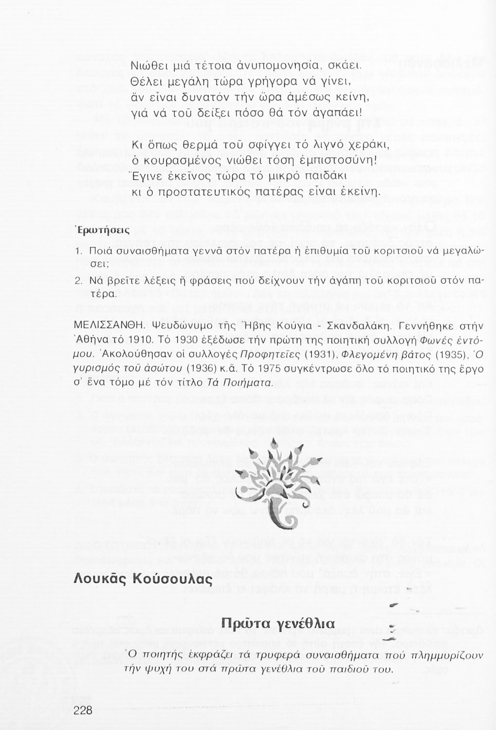 Σχολικό εγχειρίδιο Νέων Ελληνικών Α΄ Γυμνασίου που περιλαμβάνει δοκίμια, πεζά και ποιήματα Ελλήνων συγγραφέων και δημοτικά τραγούδια εμπνευσμένα από τη θρησκευτική, εθνική και κοινωνική ζωή, τη "δοκιμασία της Κύπρου", και την ελληνική φύση. Περιέχει και έργα ευρωπαίων συγγραφέων.