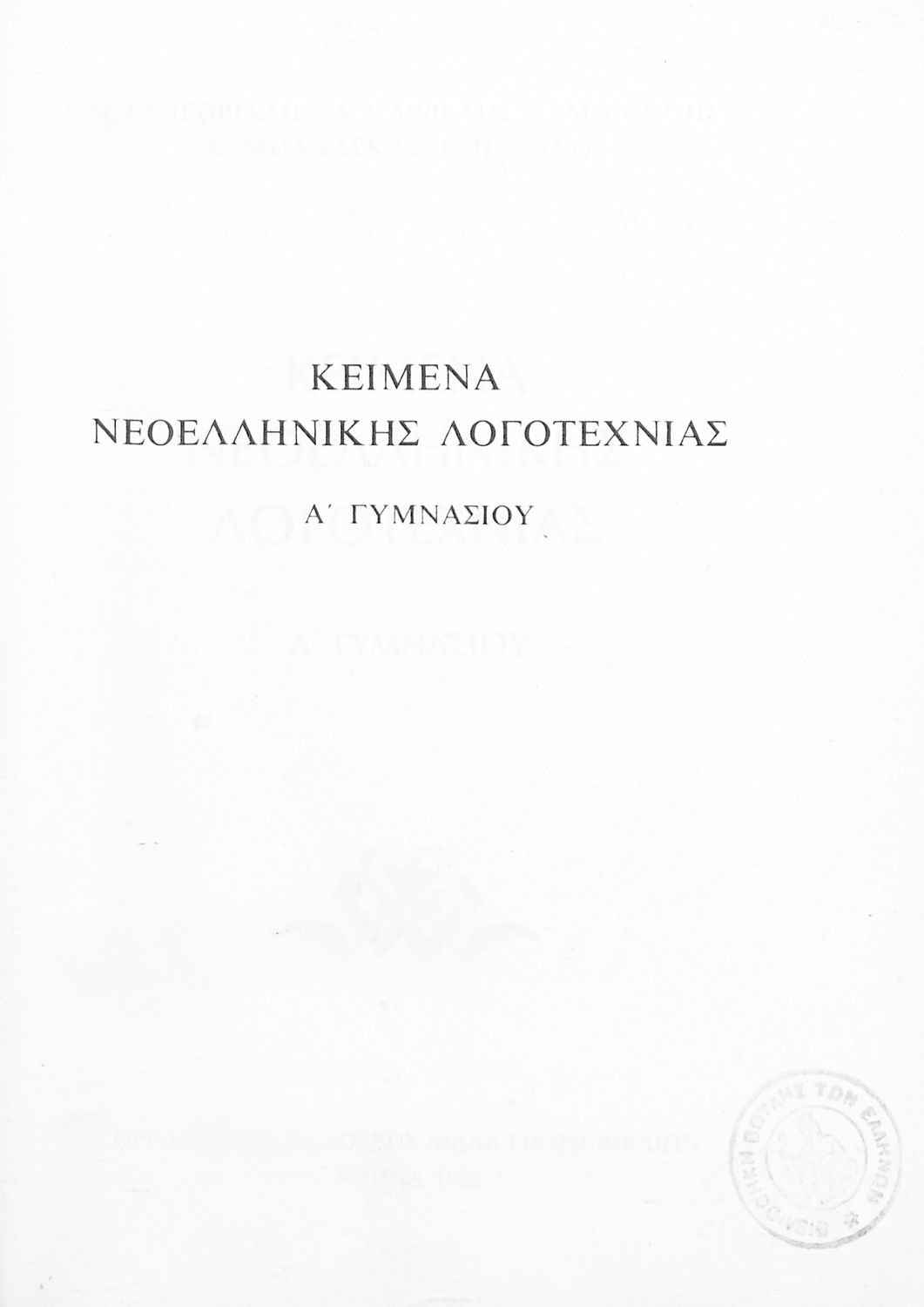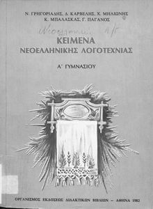 Βαθμίδα εκπαίδευσης: Δευτεροβάθμια Τάξη: Α' Γυμνασίου Μάθημα: Νέα Ελληνικά Γλώσσα: Δημοτική Παρουσίαση περιεχομένου: Σχολικό εγχειρίδιο Νέων Ελληνικών Α΄ Γυμνασίου που περιλαμβάνει δοκίμια, πεζά και ποιήματα Ελλήνων συγγραφέων και δημοτικά τραγούδια εμπνευσμένα από τη θρησκευτική, εθνική και κοινωνική ζωή, τη "δοκιμασία της Κύπρου", και την ελληνική φύση. Περιέχει και έργα ευρωπαίων συγγραφέων. |