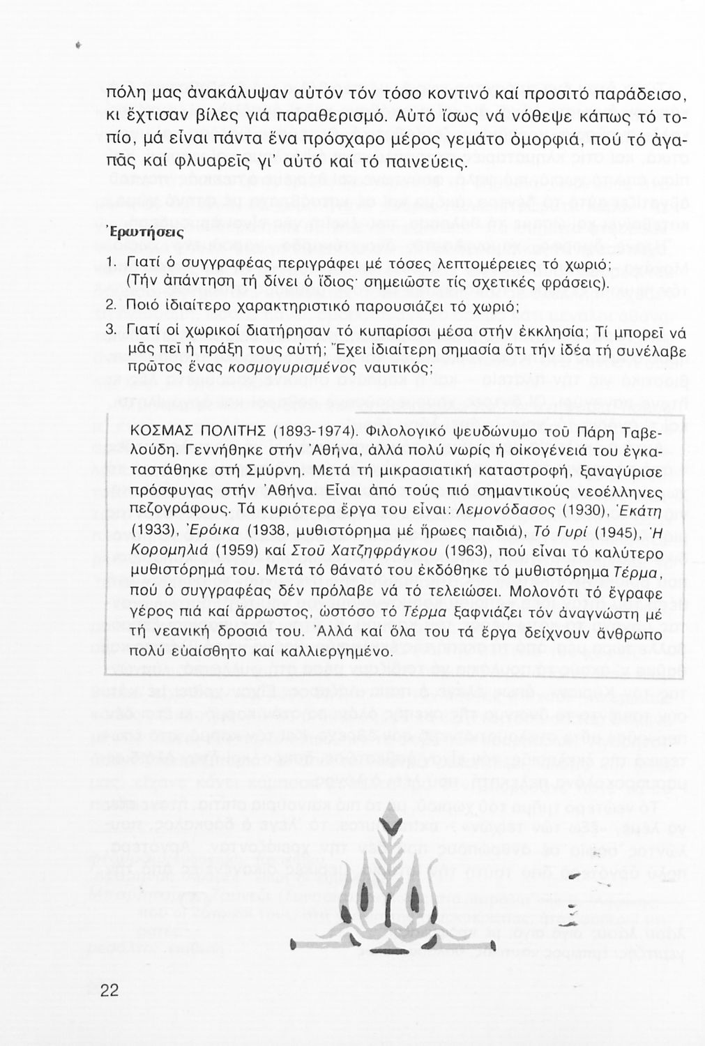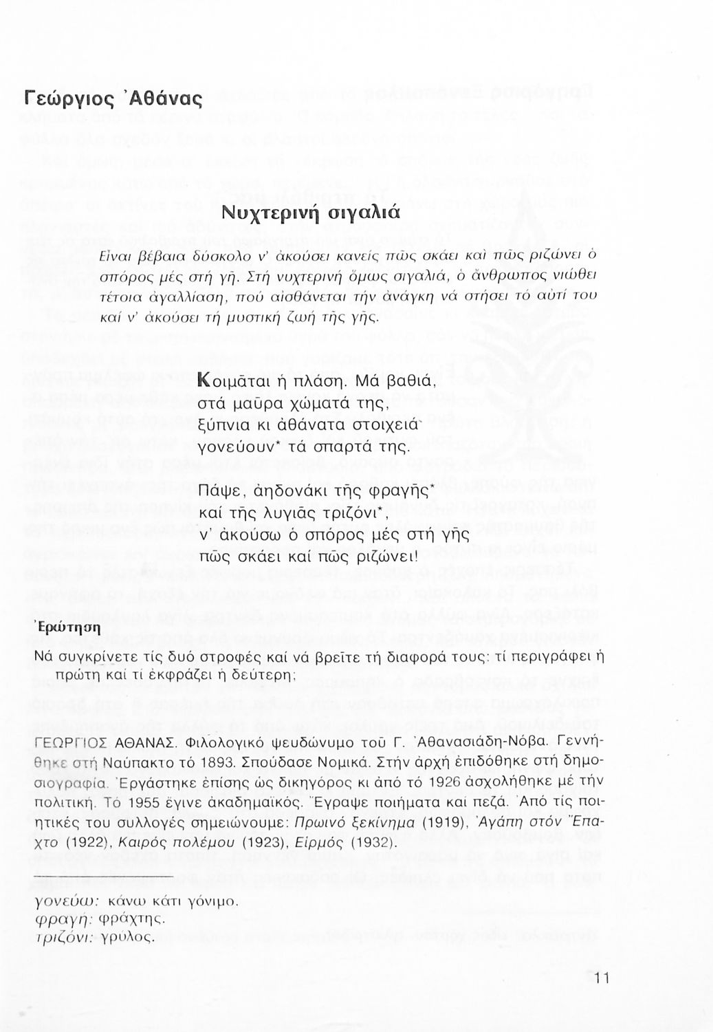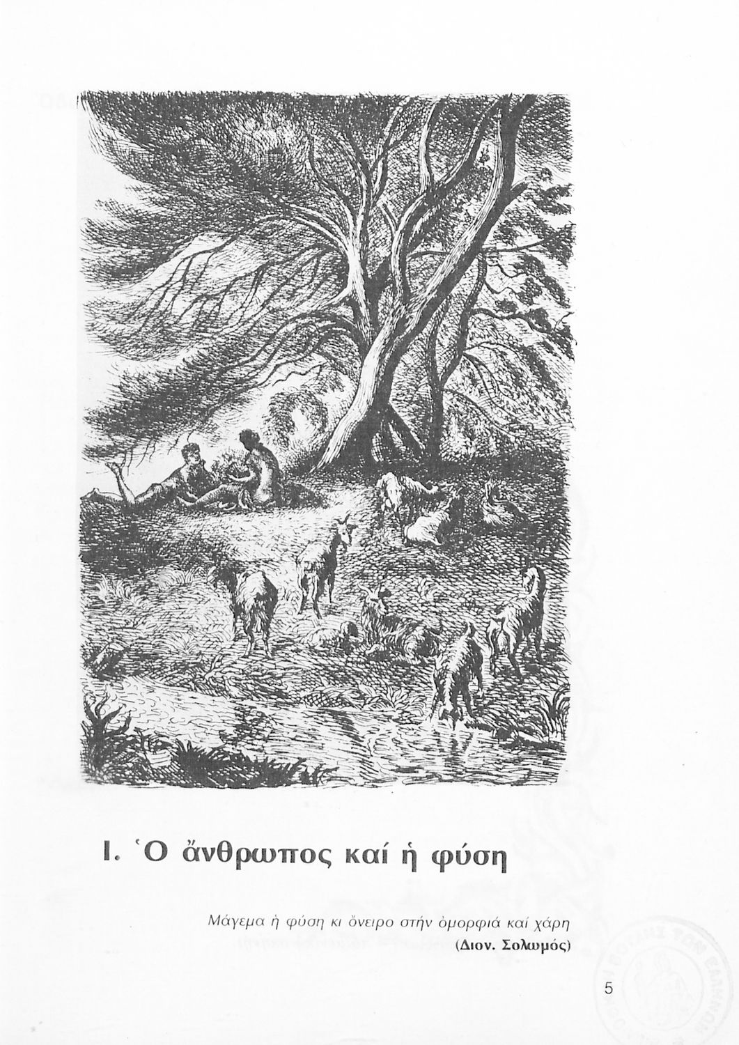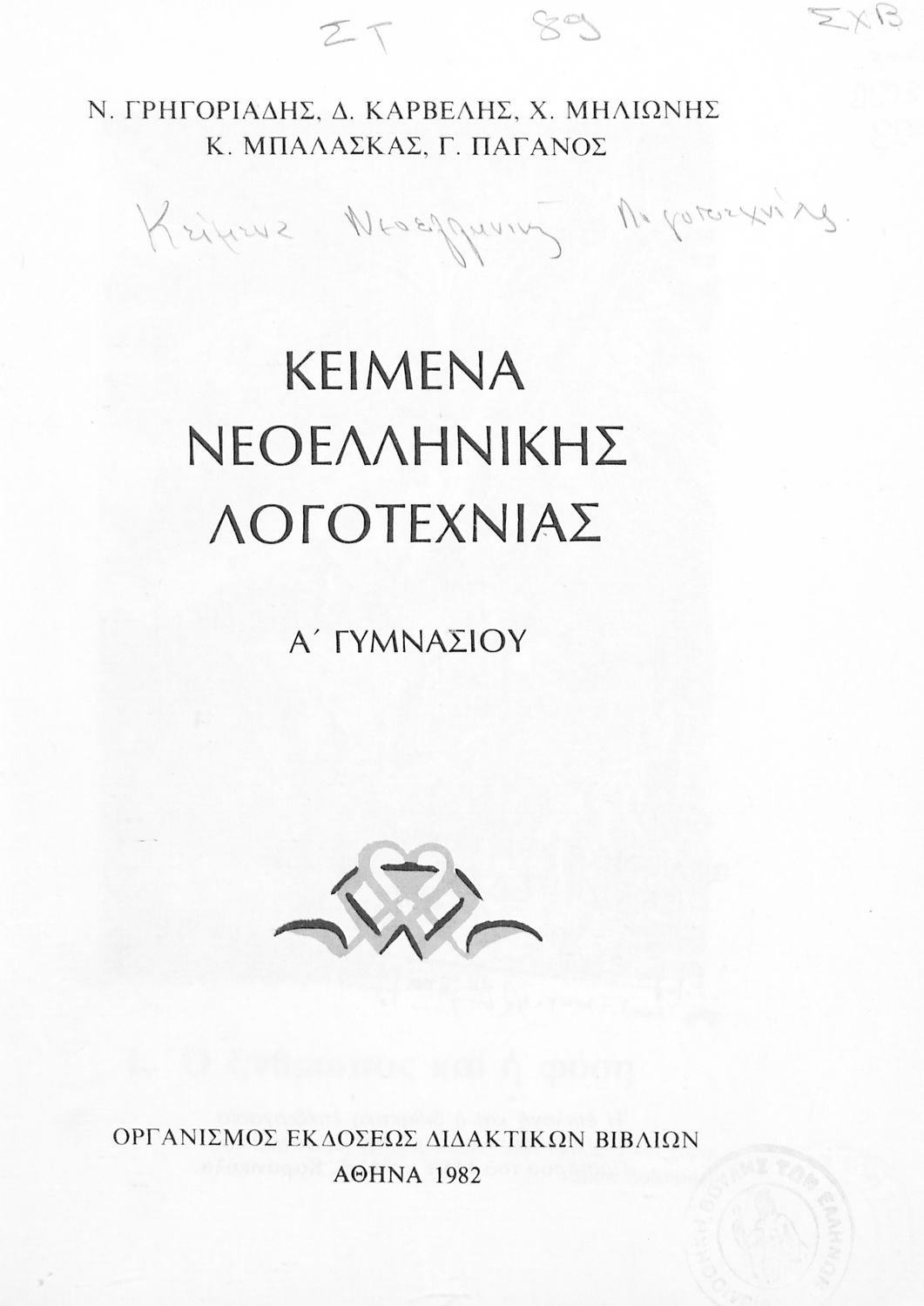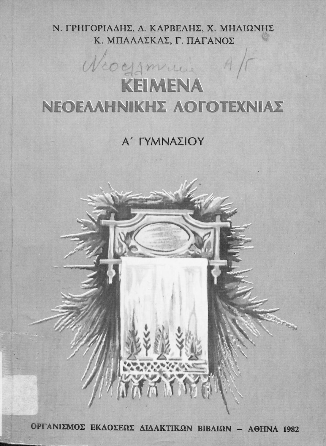 Σχολικό εγχειρίδιο Νέων Ελληνικών Α΄ Γυμνασίου που περιλαμβάνει δοκίμια, πεζά και ποιήματα Ελλήνων συγγραφέων και δημοτικά τραγούδια εμπνευσμένα από τη θρησκευτική, εθνική και κοινωνική ζωή, τη "δοκιμασία της Κύπρου", και την ελληνική φύση. Περιέχει και έργα ευρωπαίων συγγραφέων.