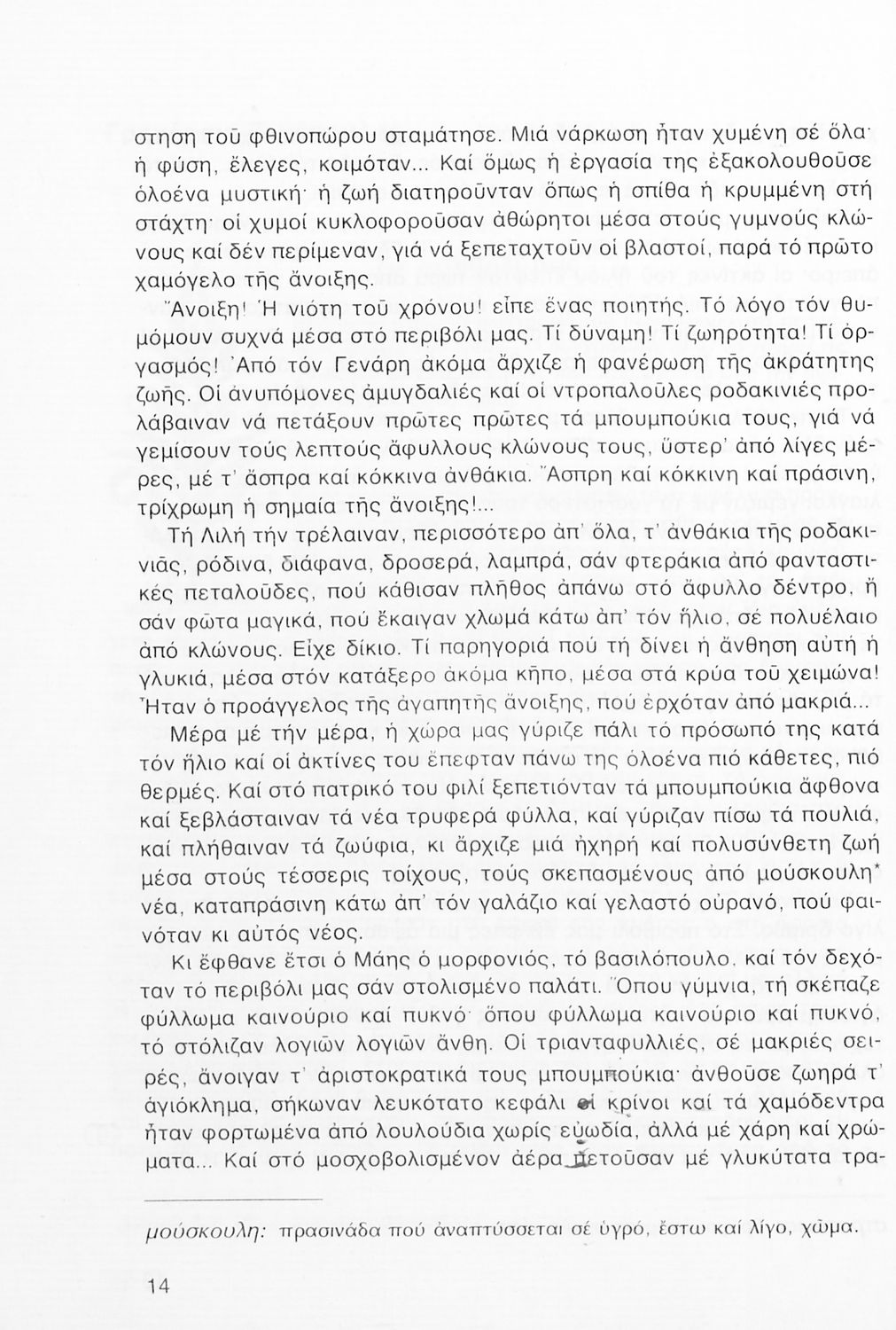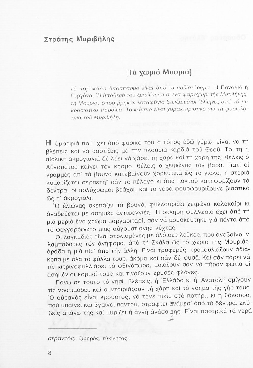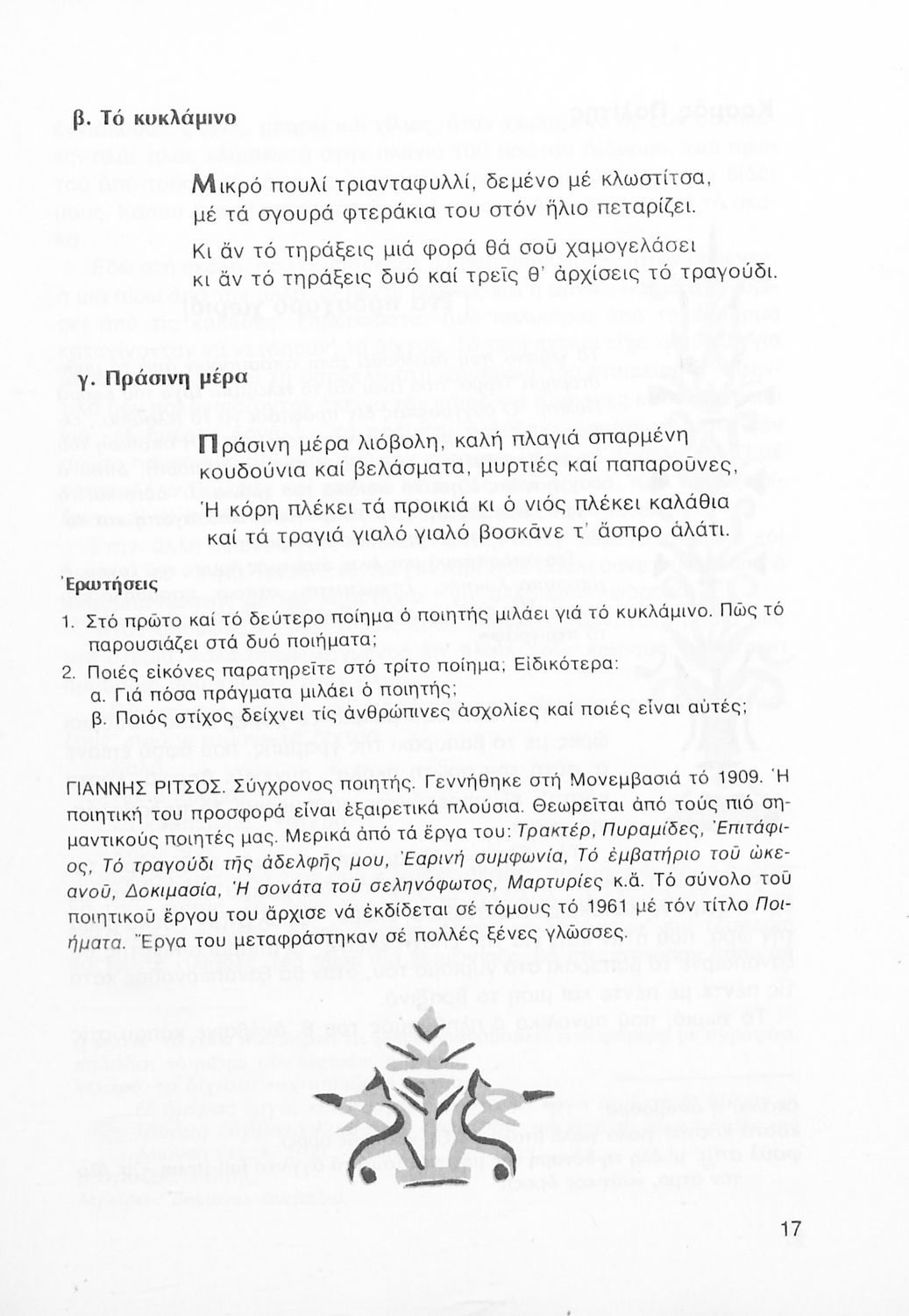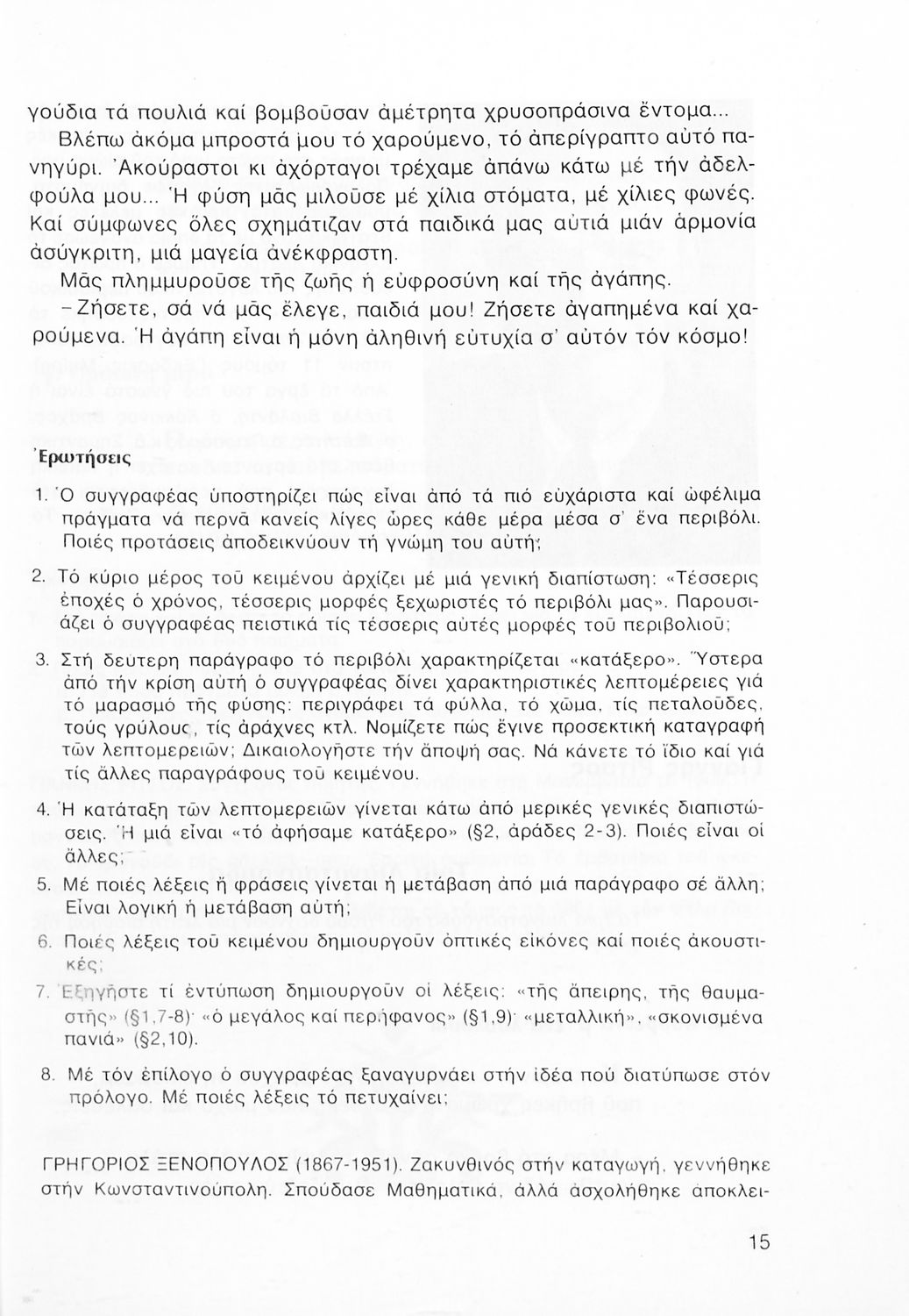Σχολικό εγχειρίδιο Νέων Ελληνικών Α΄ Γυμνασίου που περιλαμβάνει δοκίμια, πεζά και ποιήματα Ελλήνων συγγραφέων και δημοτικά τραγούδια εμπνευσμένα από τη θρησκευτική, εθνική και κοινωνική ζωή, τη "δοκιμασία της Κύπρου", και την ελληνική φύση. Περιέχει και έργα ευρωπαίων συγγραφέων.