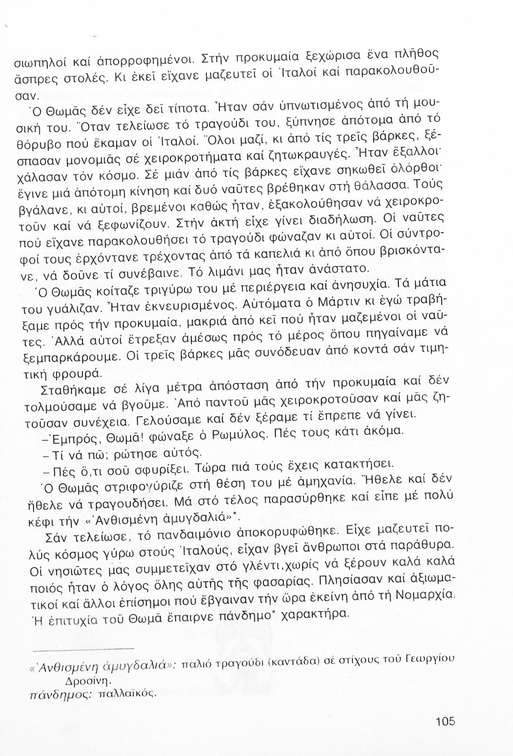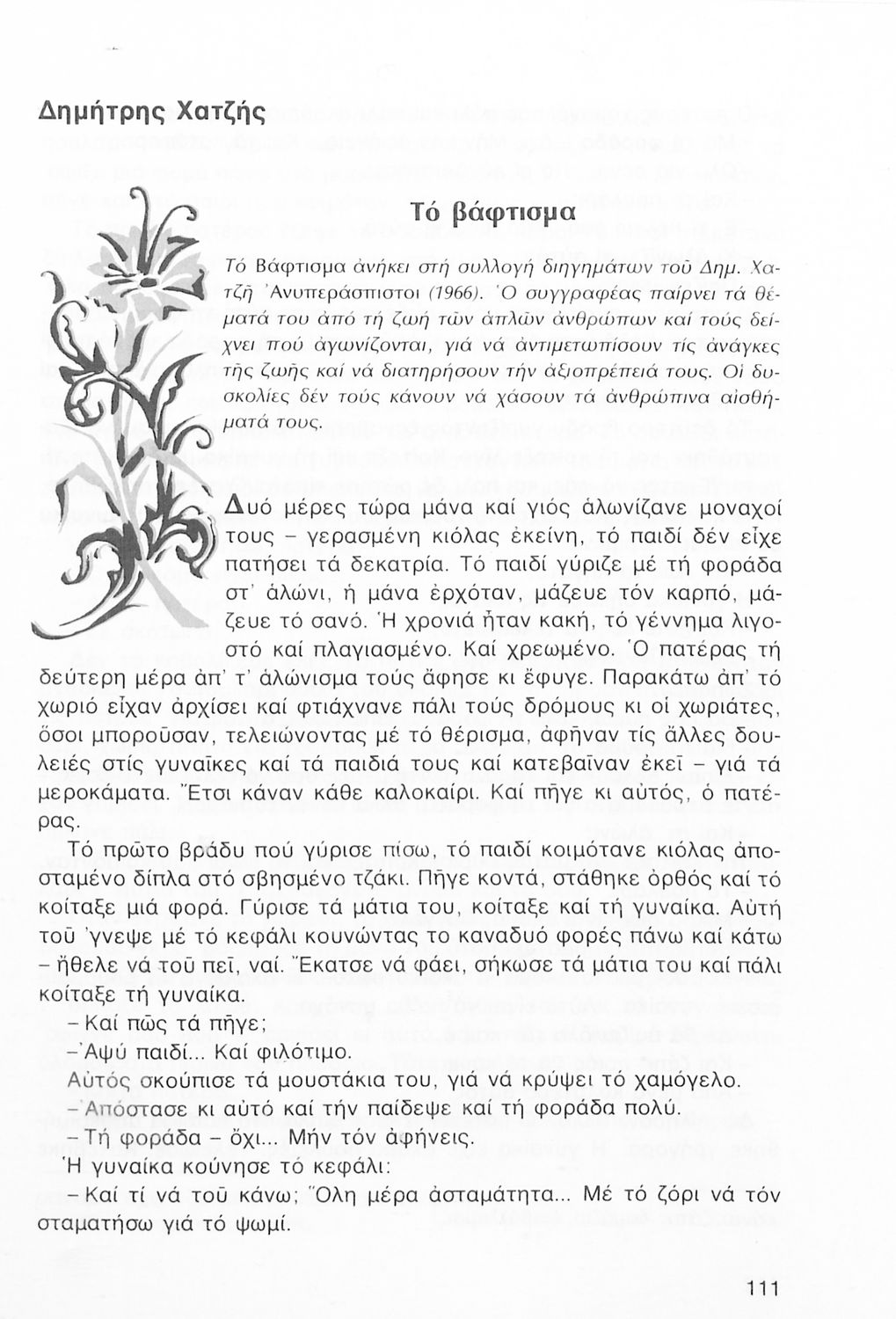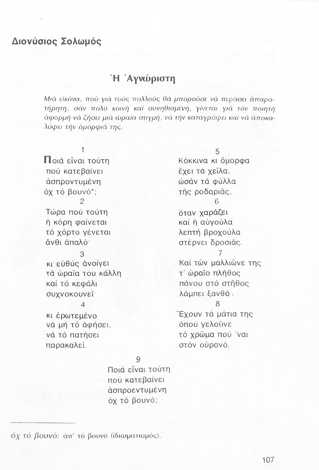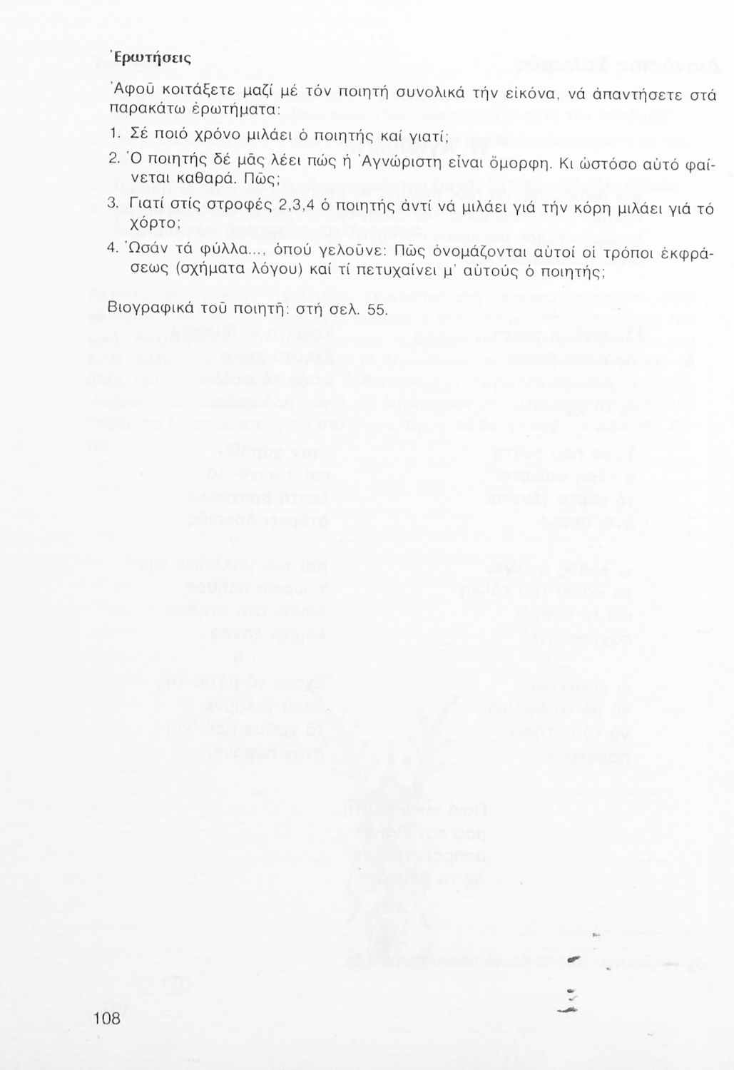 Σχολικό εγχειρίδιο Νέων Ελληνικών Α΄ Γυμνασίου που περιλαμβάνει δοκίμια, πεζά και ποιήματα Ελλήνων συγγραφέων και δημοτικά τραγούδια εμπνευσμένα από τη θρησκευτική, εθνική και κοινωνική ζωή, τη "δοκιμασία της Κύπρου", και την ελληνική φύση. Περιέχει και έργα ευρωπαίων συγγραφέων.