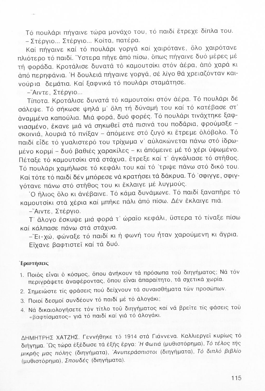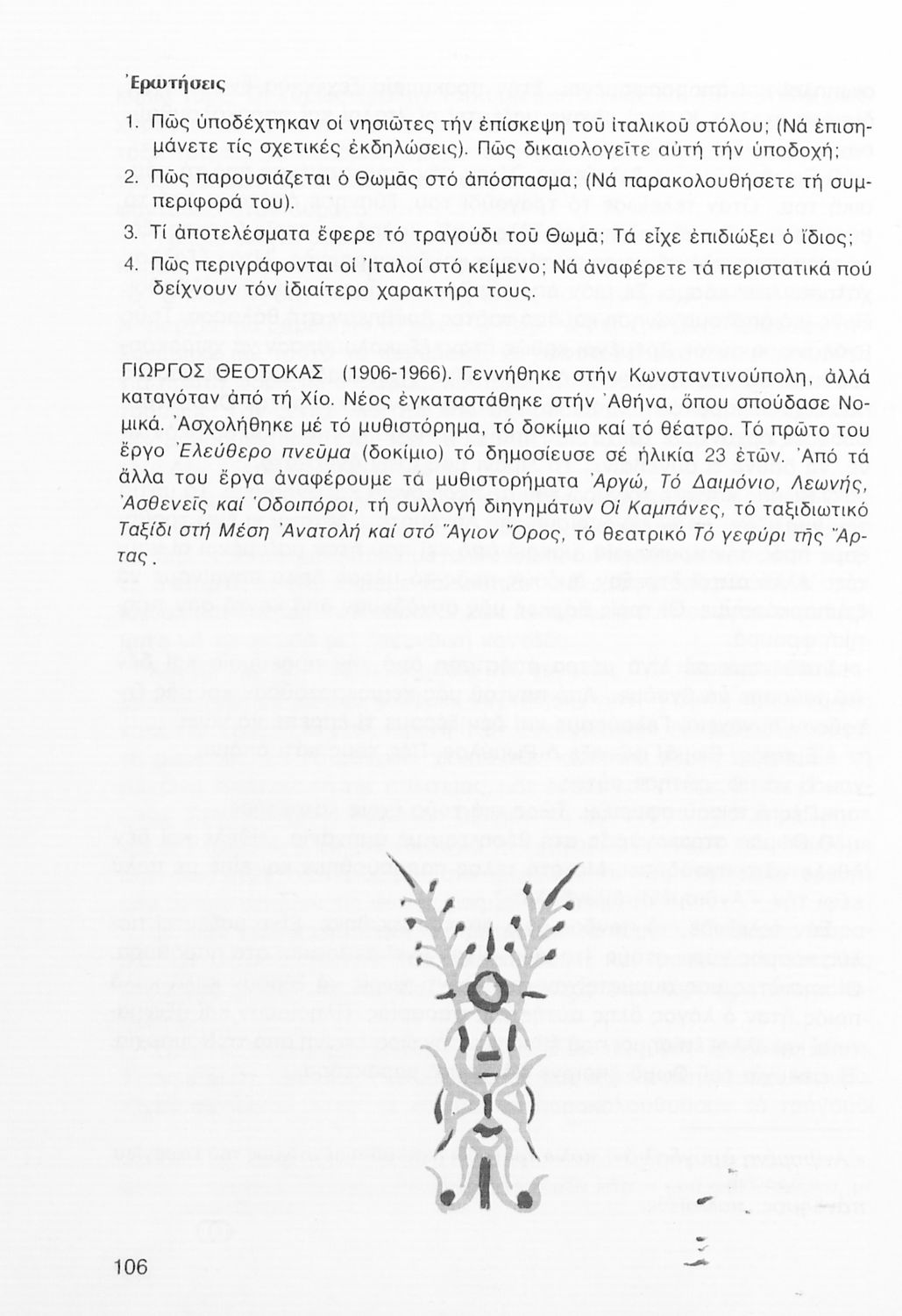 Σχολικό εγχειρίδιο Νέων Ελληνικών Α΄ Γυμνασίου που περιλαμβάνει δοκίμια, πεζά και ποιήματα Ελλήνων συγγραφέων και δημοτικά τραγούδια εμπνευσμένα από τη θρησκευτική, εθνική και κοινωνική ζωή, τη "δοκιμασία της ...