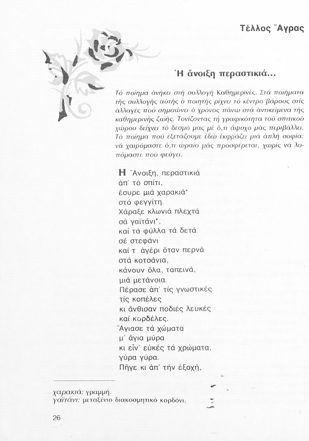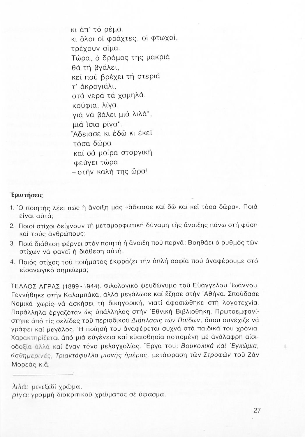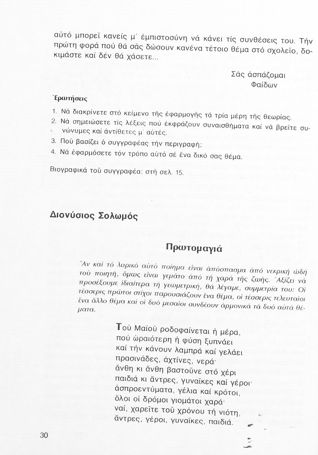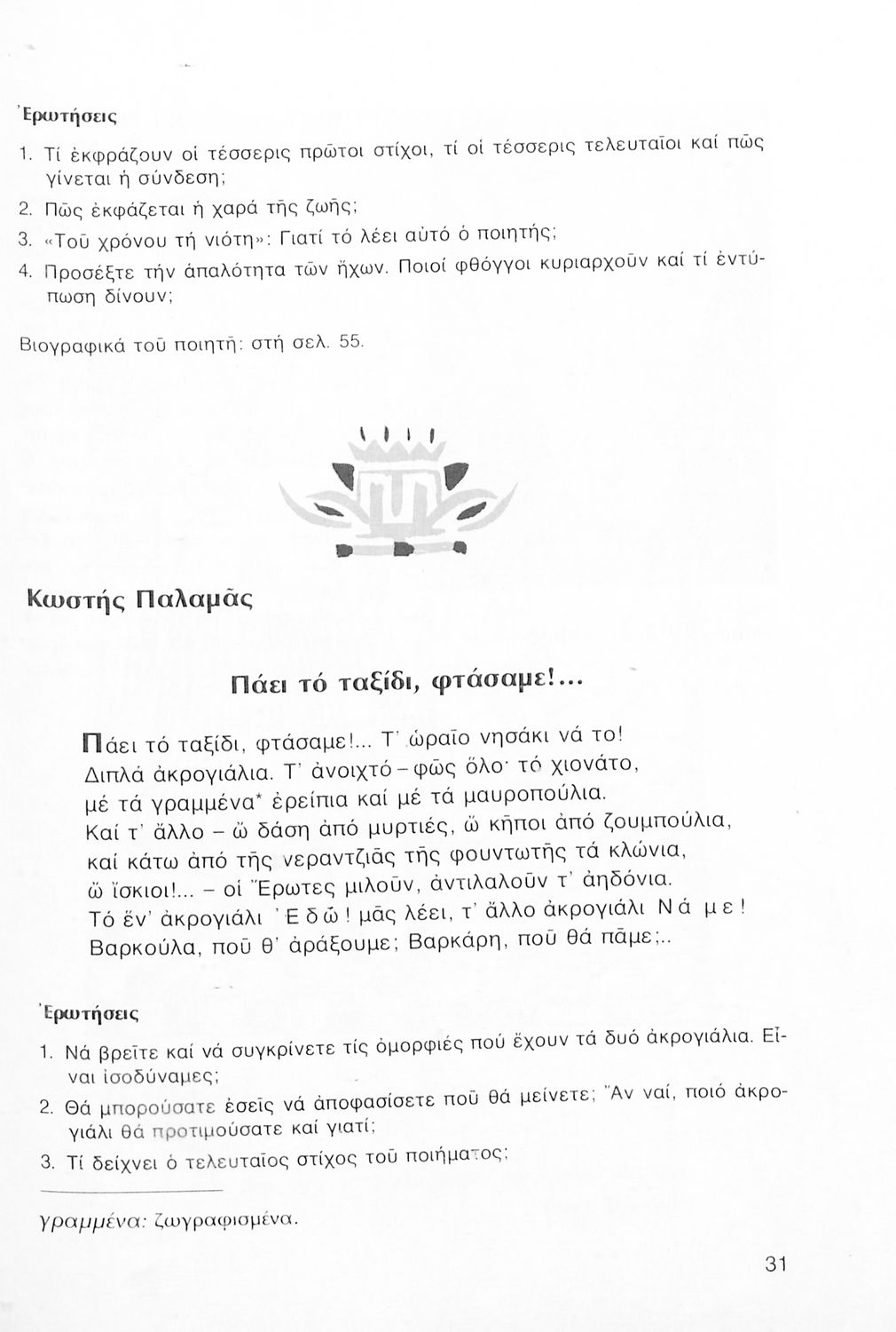Σχολικό εγχειρίδιο Νέων Ελληνικών Α΄ Γυμνασίου που περιλαμβάνει δοκίμια, πεζά και ποιήματα Ελλήνων συγγραφέων και δημοτικά τραγούδια εμπνευσμένα από τη θρησκευτική, εθνική και κοινωνική ζωή, τη "δοκιμασία της Κύπρου", και την ελληνική φύση. Περιέχει και έργα ευρωπαίων συγγραφέων.
