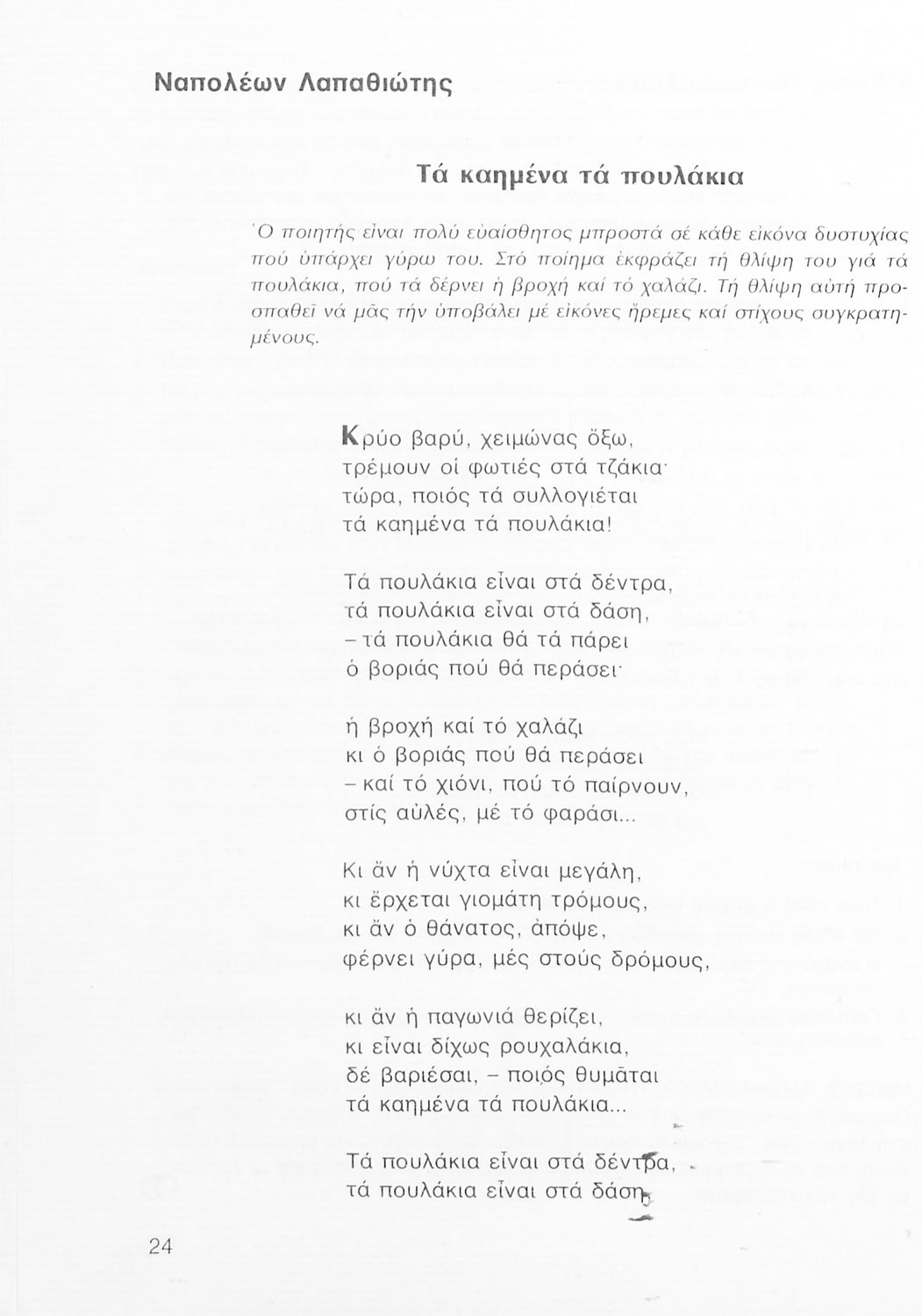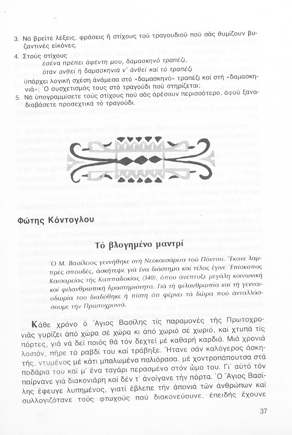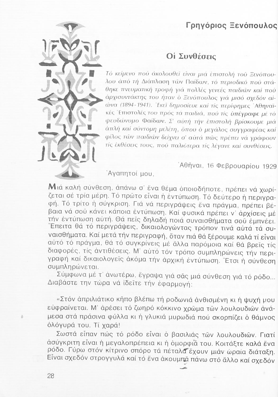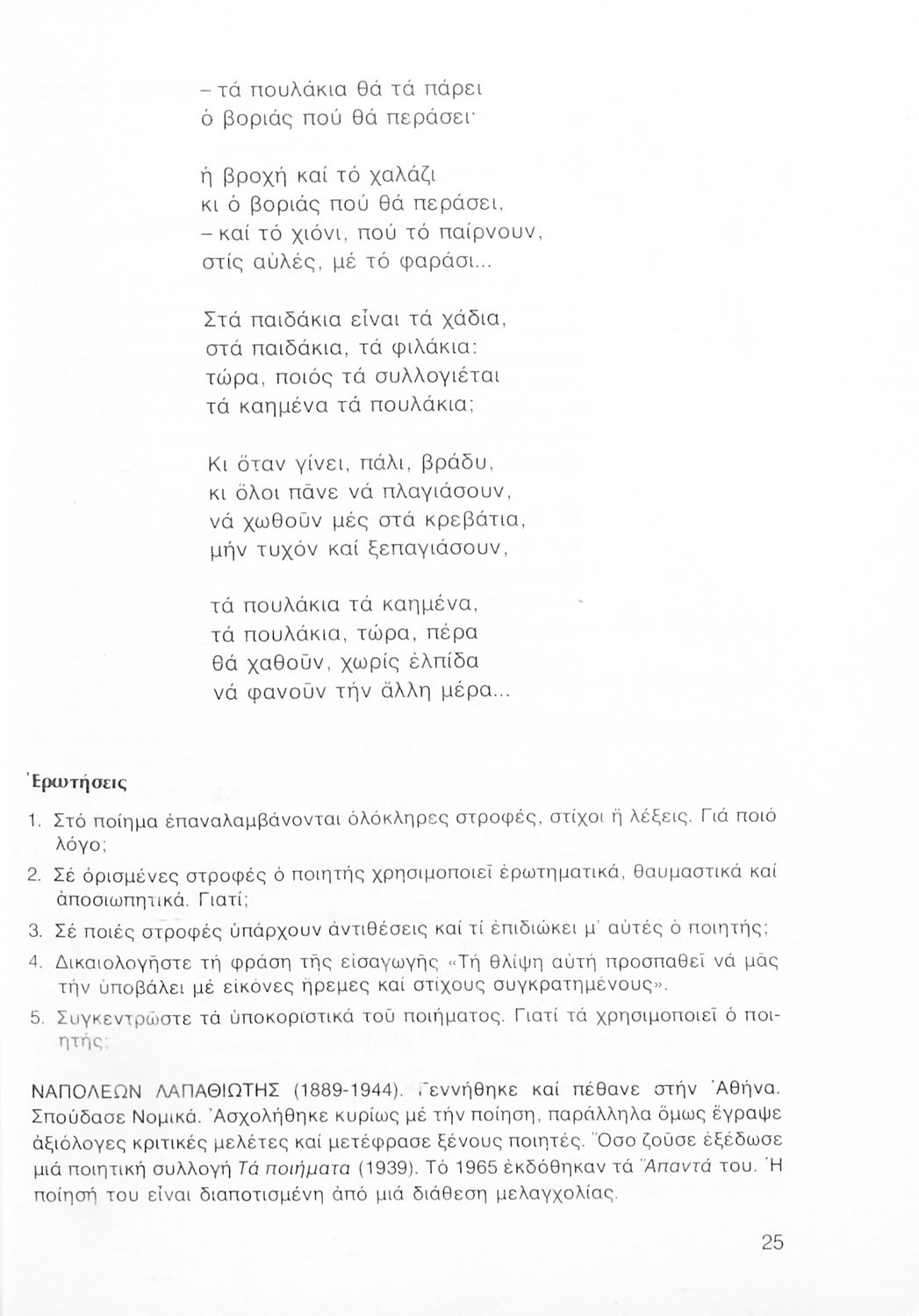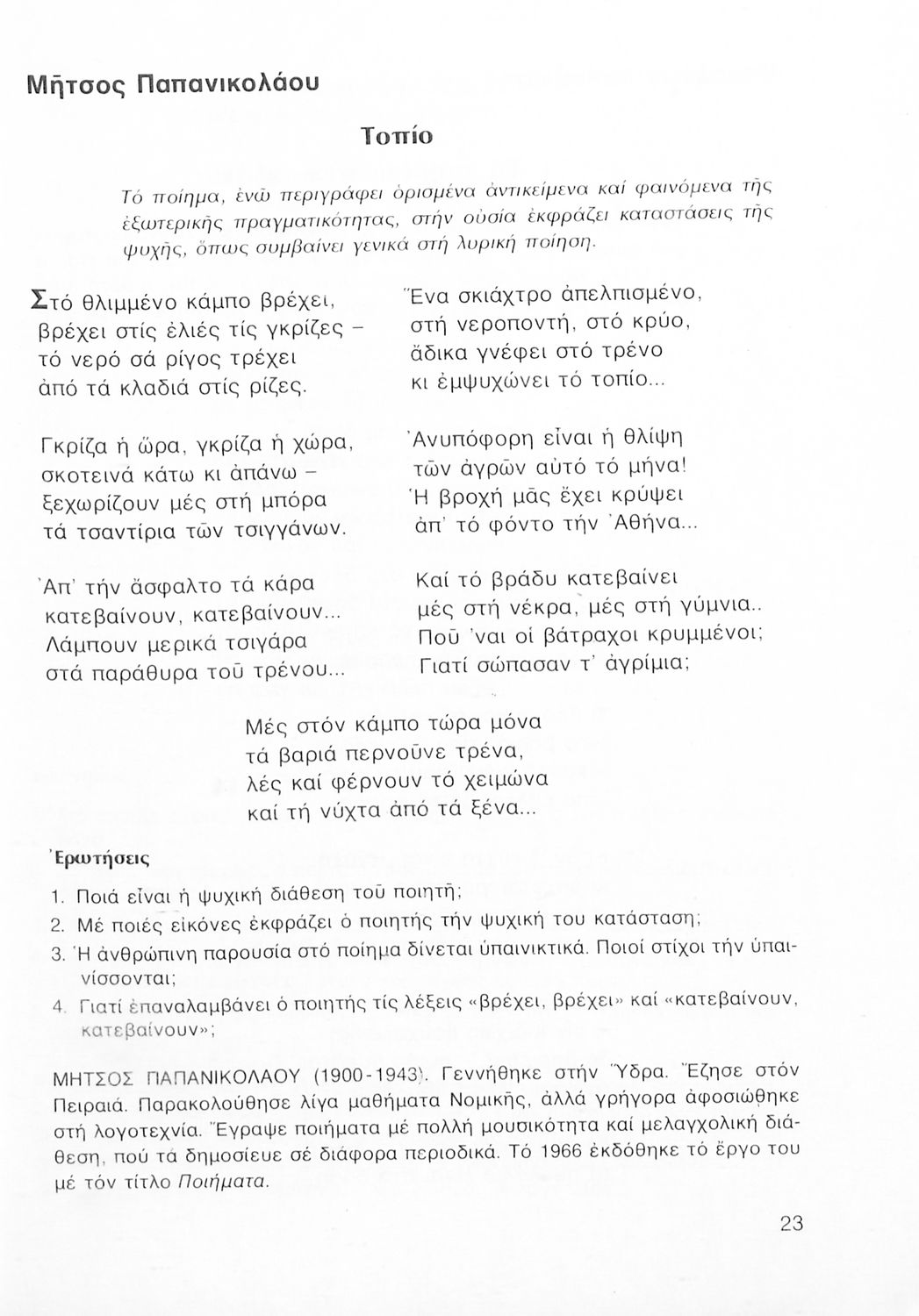 Σχολικό εγχειρίδιο Νέων Ελληνικών Α΄ Γυμνασίου που περιλαμβάνει δοκίμια, πεζά και ποιήματα Ελλήνων συγγραφέων και δημοτικά τραγούδια εμπνευσμένα από τη θρησκευτική, εθνική και κοινωνική ζωή, τη "δοκιμασία της Κύπρου", και την ελληνική φύση. Περιέχει και έργα ευρωπαίων συγγραφέων.