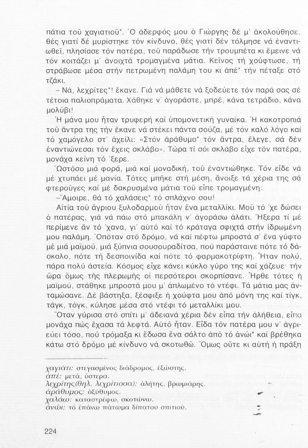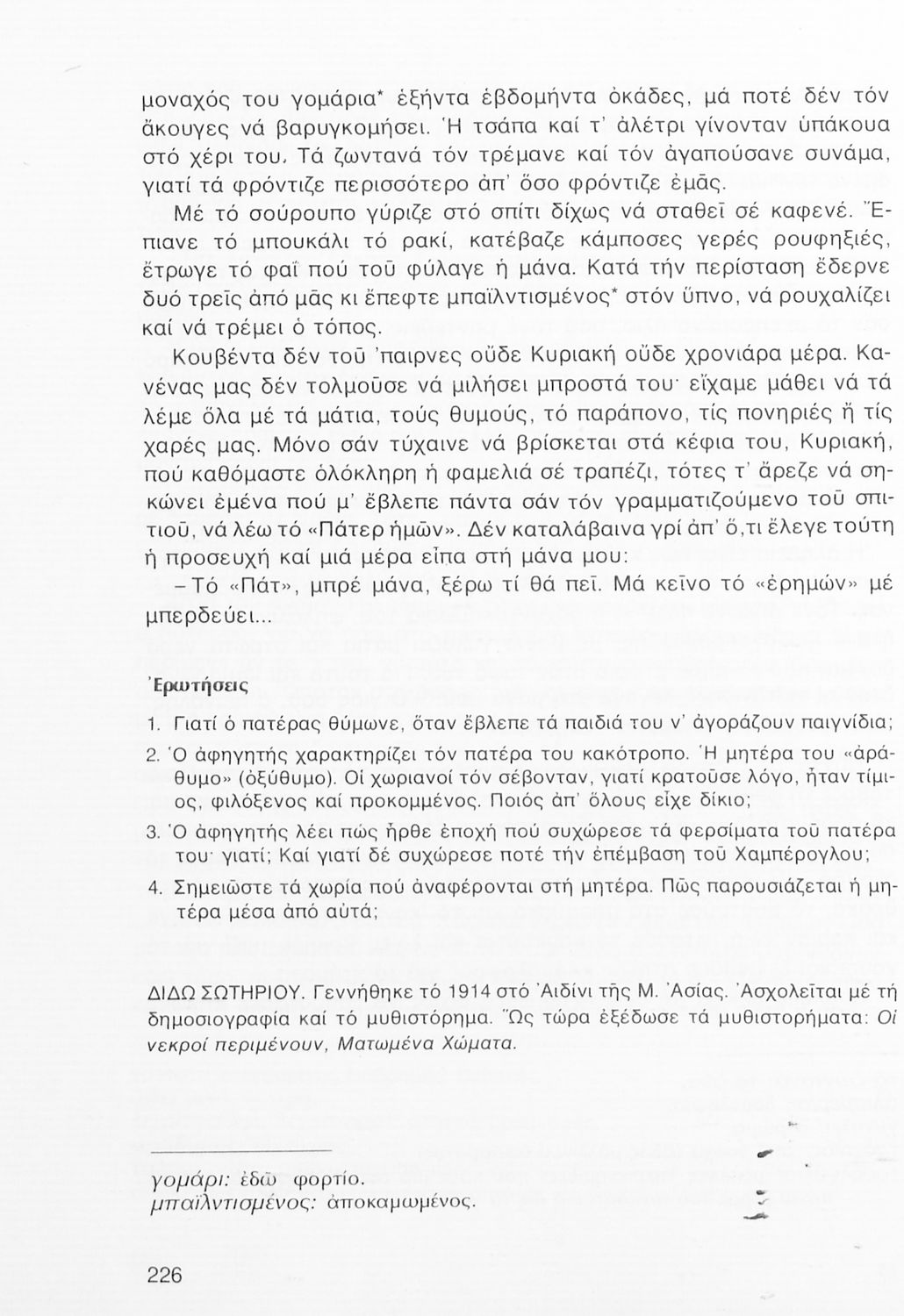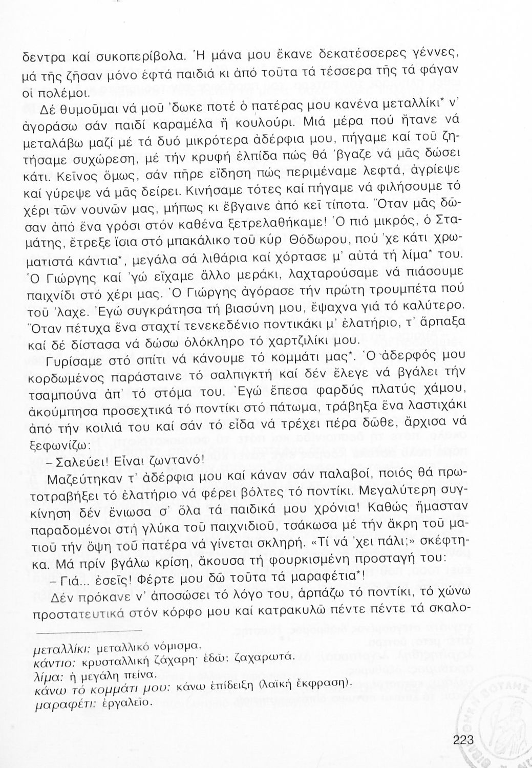 Σχολικό εγχειρίδιο Νέων Ελληνικών Α΄ Γυμνασίου που περιλαμβάνει δοκίμια, πεζά και ποιήματα Ελλήνων συγγραφέων και δημοτικά τραγούδια εμπνευσμένα από τη θρησκευτική, εθνική και κοινωνική ζωή, τη "δοκιμασία της ...