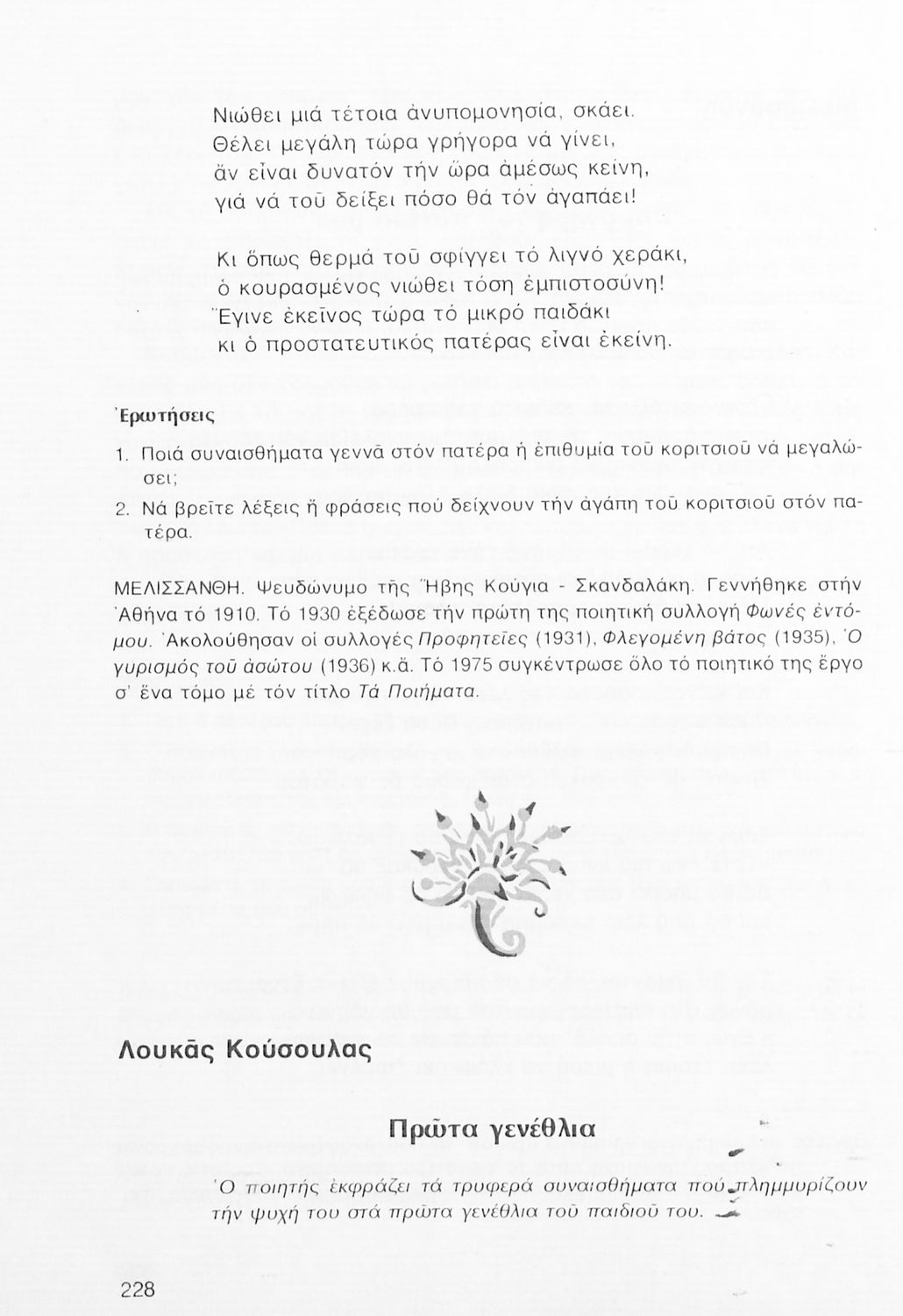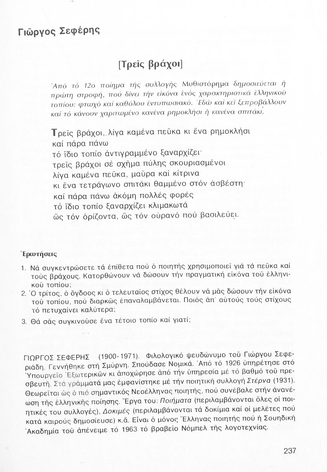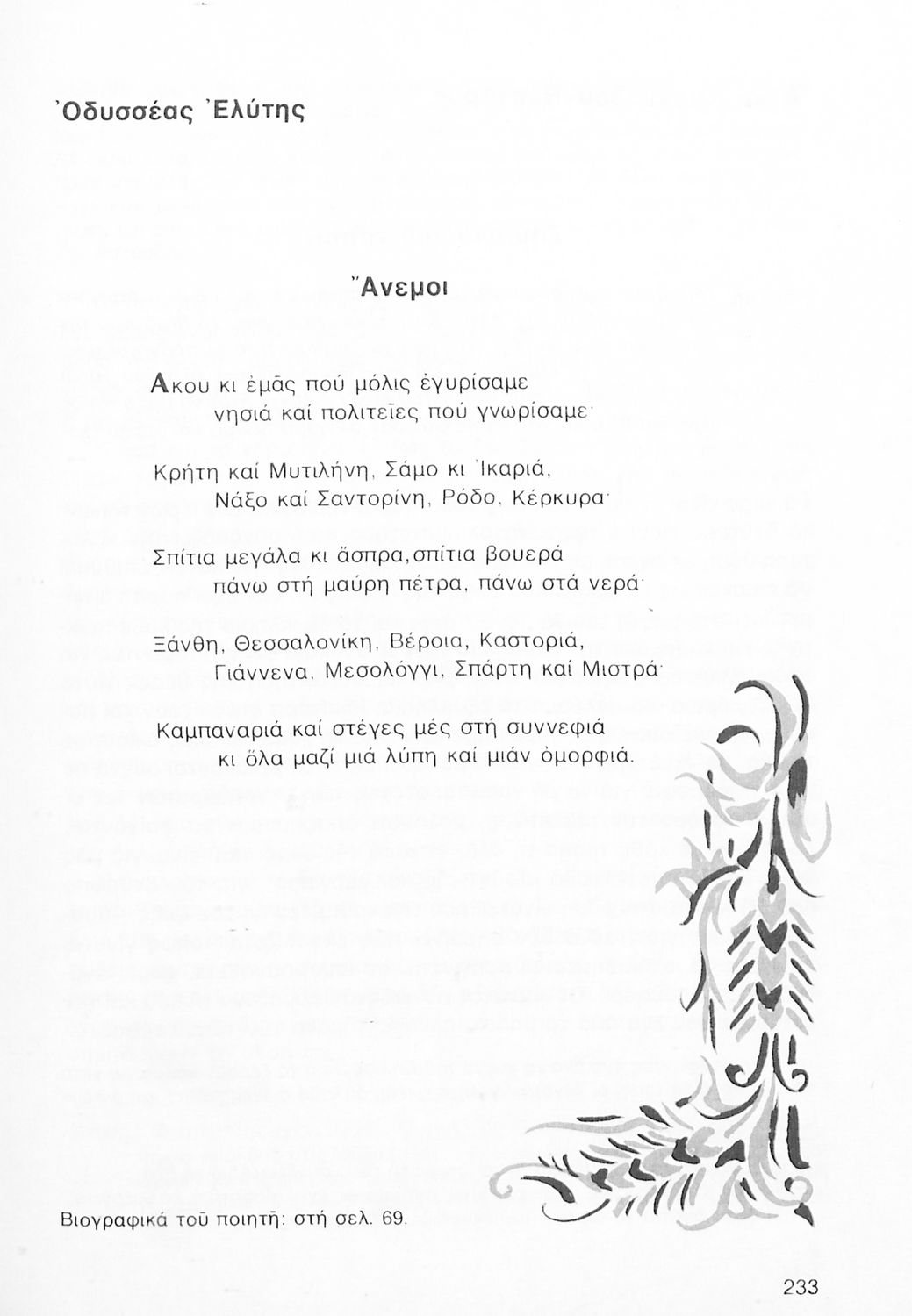 Σχολικό εγχειρίδιο Νέων Ελληνικών Α΄ Γυμνασίου που περιλαμβάνει δοκίμια, πεζά και ποιήματα Ελλήνων συγγραφέων και δημοτικά τραγούδια εμπνευσμένα από τη θρησκευτική, εθνική και κοινωνική ζωή, τη "δοκιμασία της Κύπρου", και την ελληνική φύση. Περιέχει και έργα ευρωπαίων συγγραφέων.