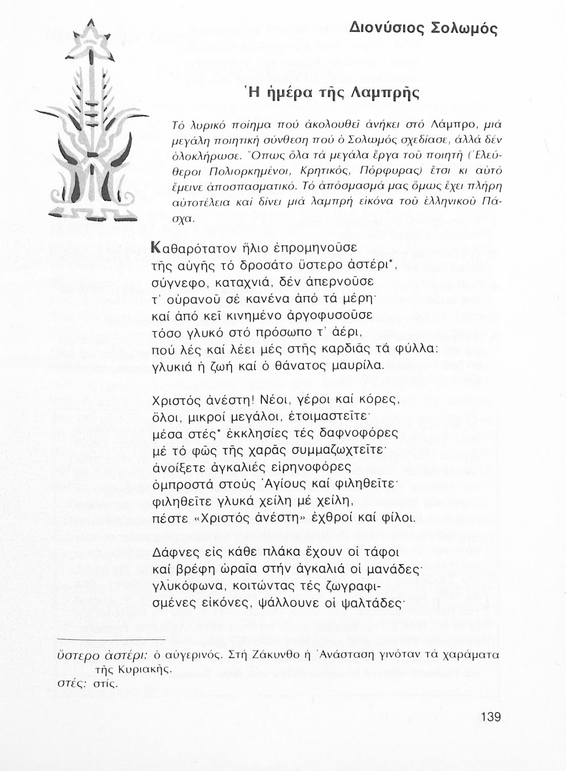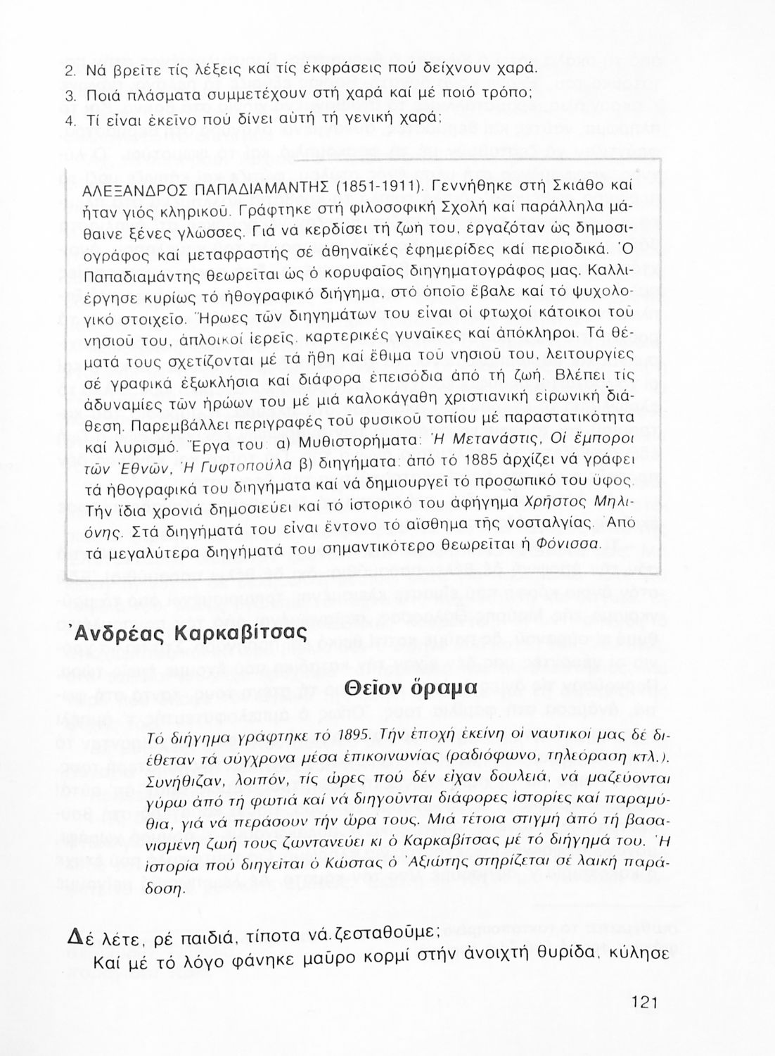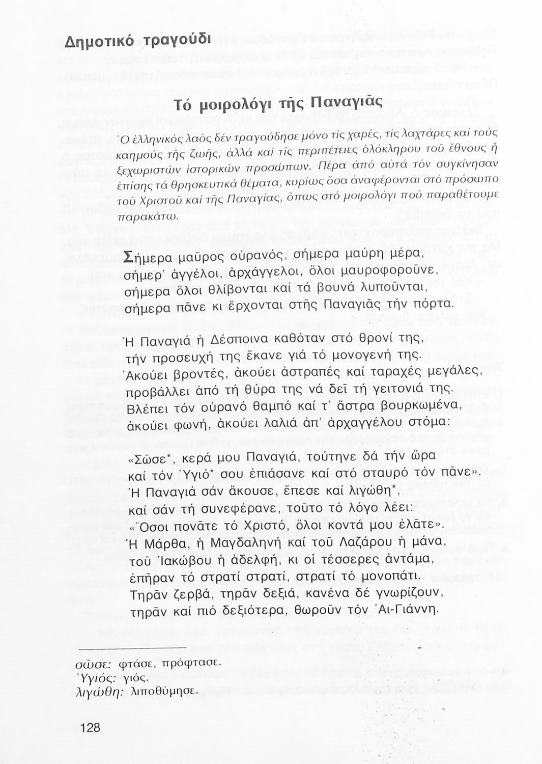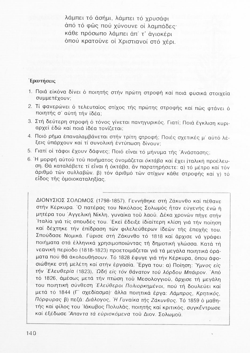 Σχολικό εγχειρίδιο Νέων Ελληνικών Β' Γυμνασίου που περιέχει δημοτικά τραγούδια, πεζά, δοκίμια και ποιήματα σύγχρονων Ελλήνων συγγραφέων και είναι χωρισμένο σε θεματικές ενότητες όπως η πόλη και η ύπαιθρος, η εποχή του 40' και η κατοχή, η θρησκευτική ζωή, ο καημός της ξενιτιάς, ο ελληνισμός έξω από τα σύνορα, οι αγώνες Ακριτών-Κλεφτών κ.α. Περιλαμβάνει και έργα ευρωπαίων λογοτεχνών.
