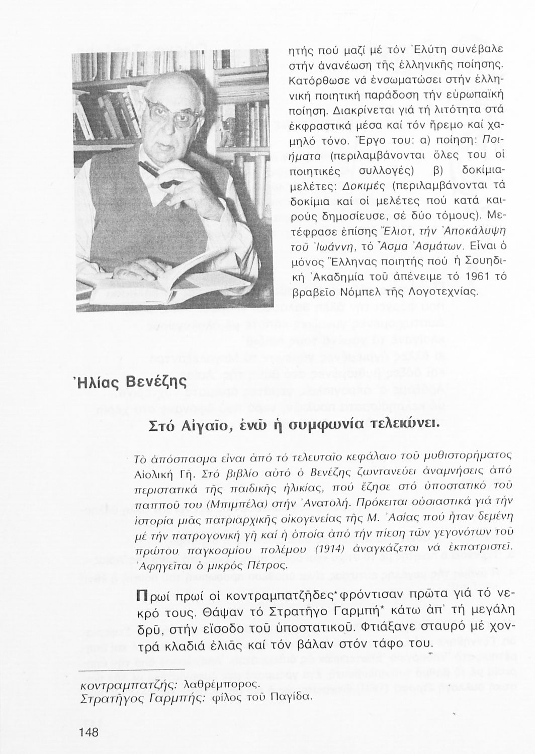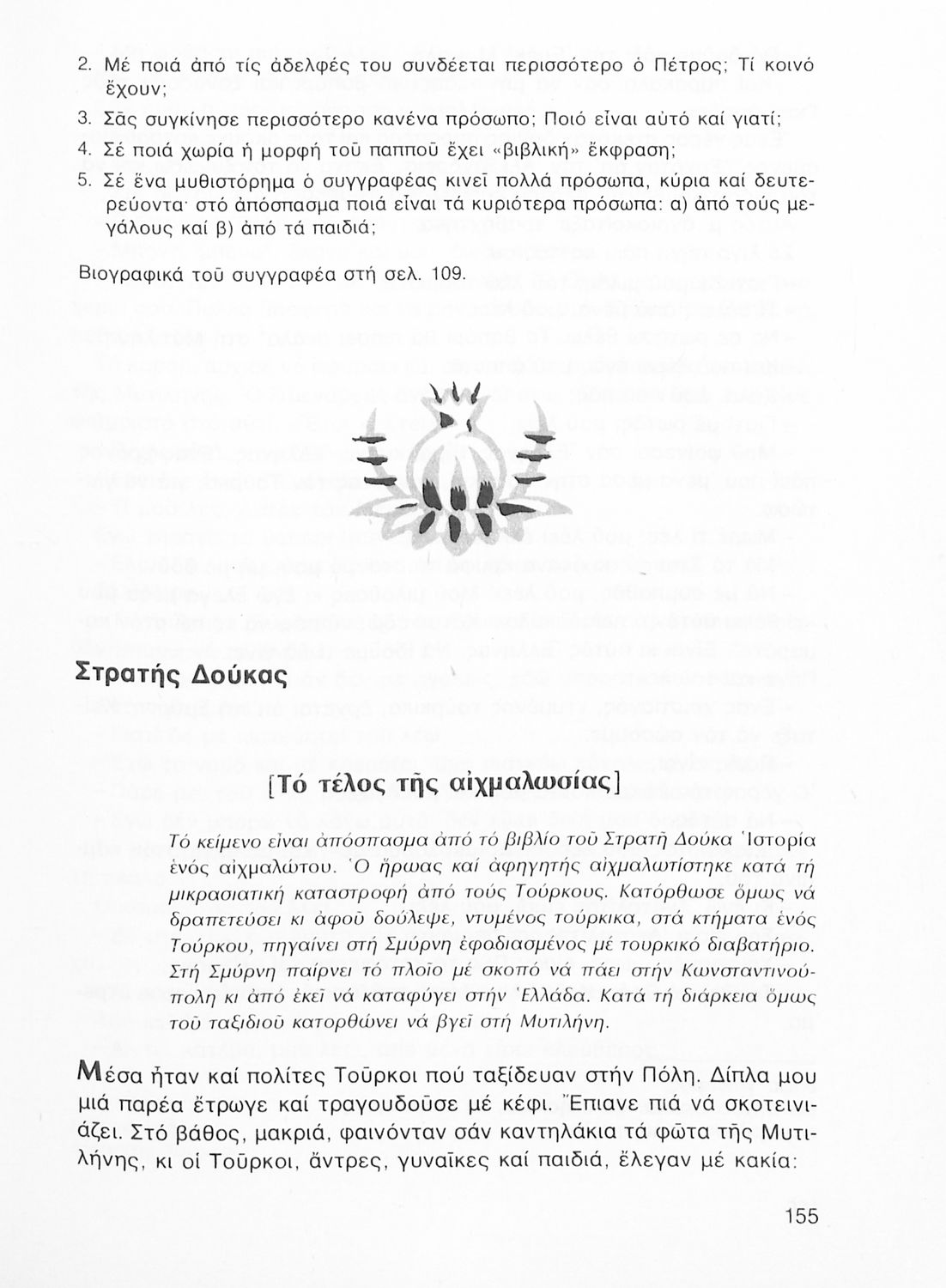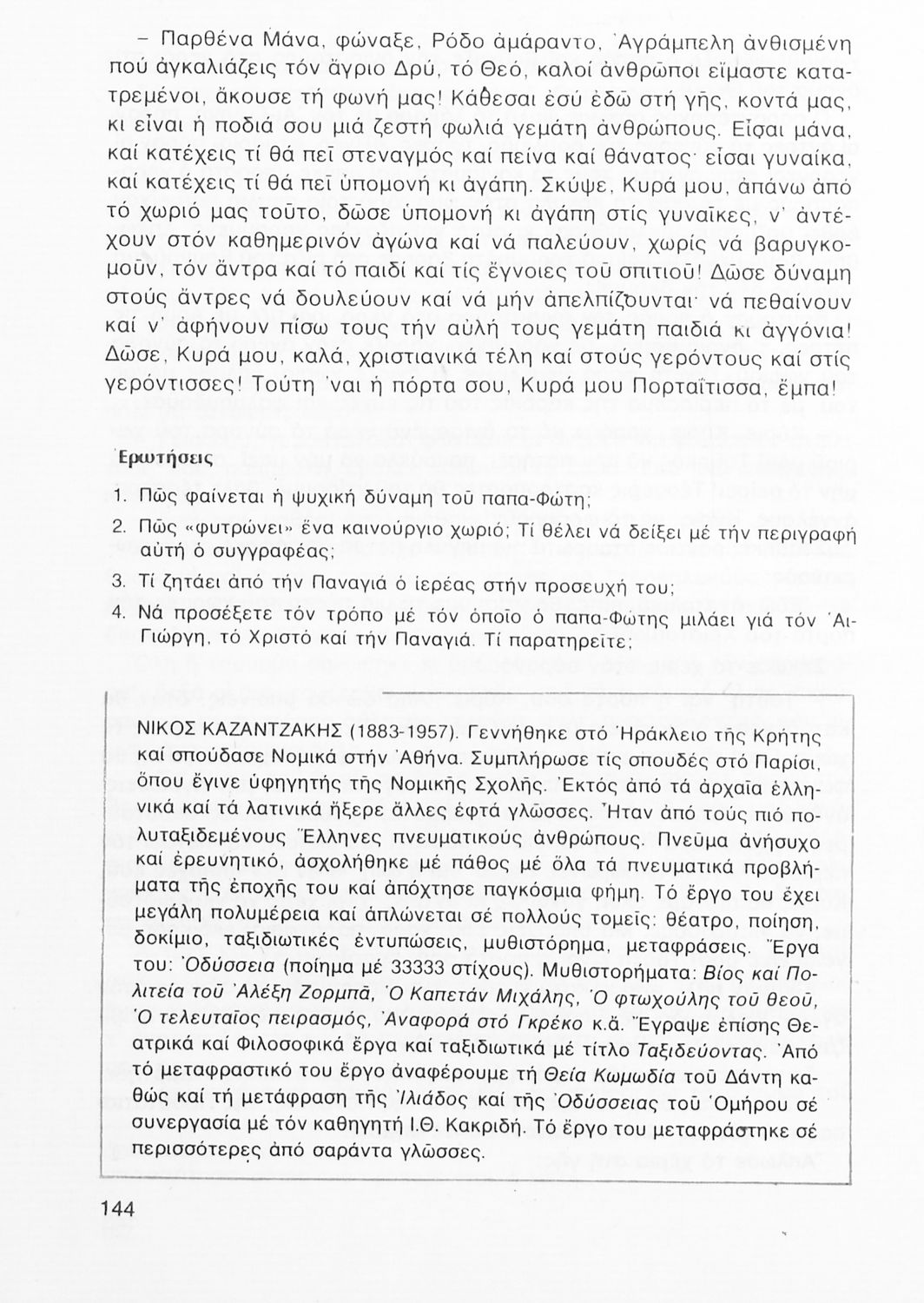 Σχολικό εγχειρίδιο Νέων Ελληνικών Α΄ Γυμνασίου που περιλαμβάνει δοκίμια, πεζά και ποιήματα Ελλήνων συγγραφέων και δημοτικά τραγούδια εμπνευσμένα από τη θρησκευτική, εθνική και κοινωνική ζωή, τη "δοκιμασία της ...