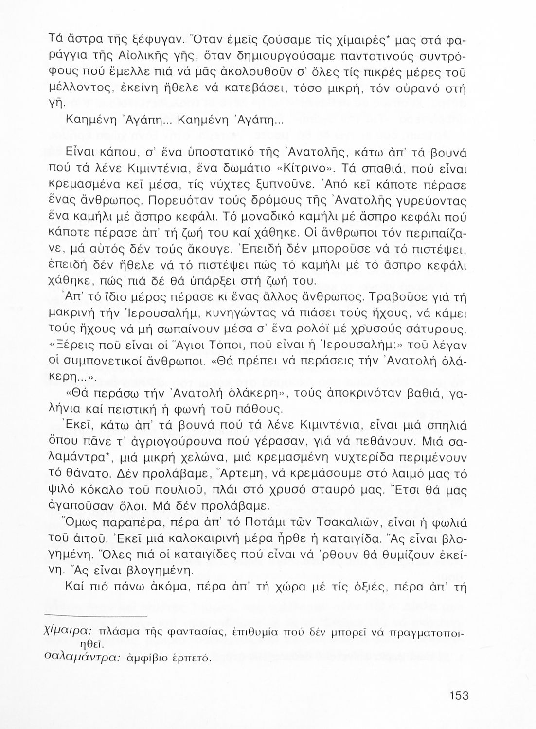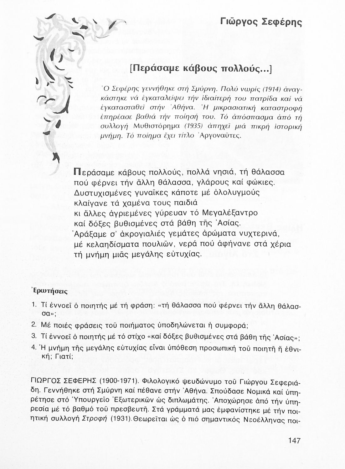 Σχολικό εγχειρίδιο Νέων Ελληνικών Β' Γυμνασίου που περιέχει δημοτικά τραγούδια, πεζά, δοκίμια και ποιήματα σύγχρονων Ελλήνων συγγραφέων και είναι χωρισμένο σε θεματικές ενότητες όπως η πόλη και η ύπαιθρος, η εποχή του 40' και η κατοχή, η θρησκευτική ζωή, ο καημός της ξενιτιάς, ο ελληνισμός έξω από τα σύνορα, οι αγώνες Ακριτών-Κλεφτών κ.α. Περιλαμβάνει και έργα ευρωπαίων λογοτεχνών.