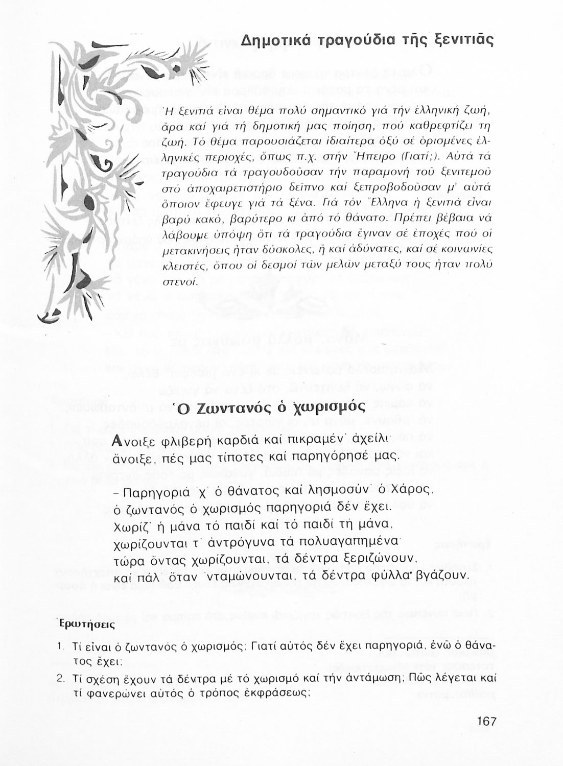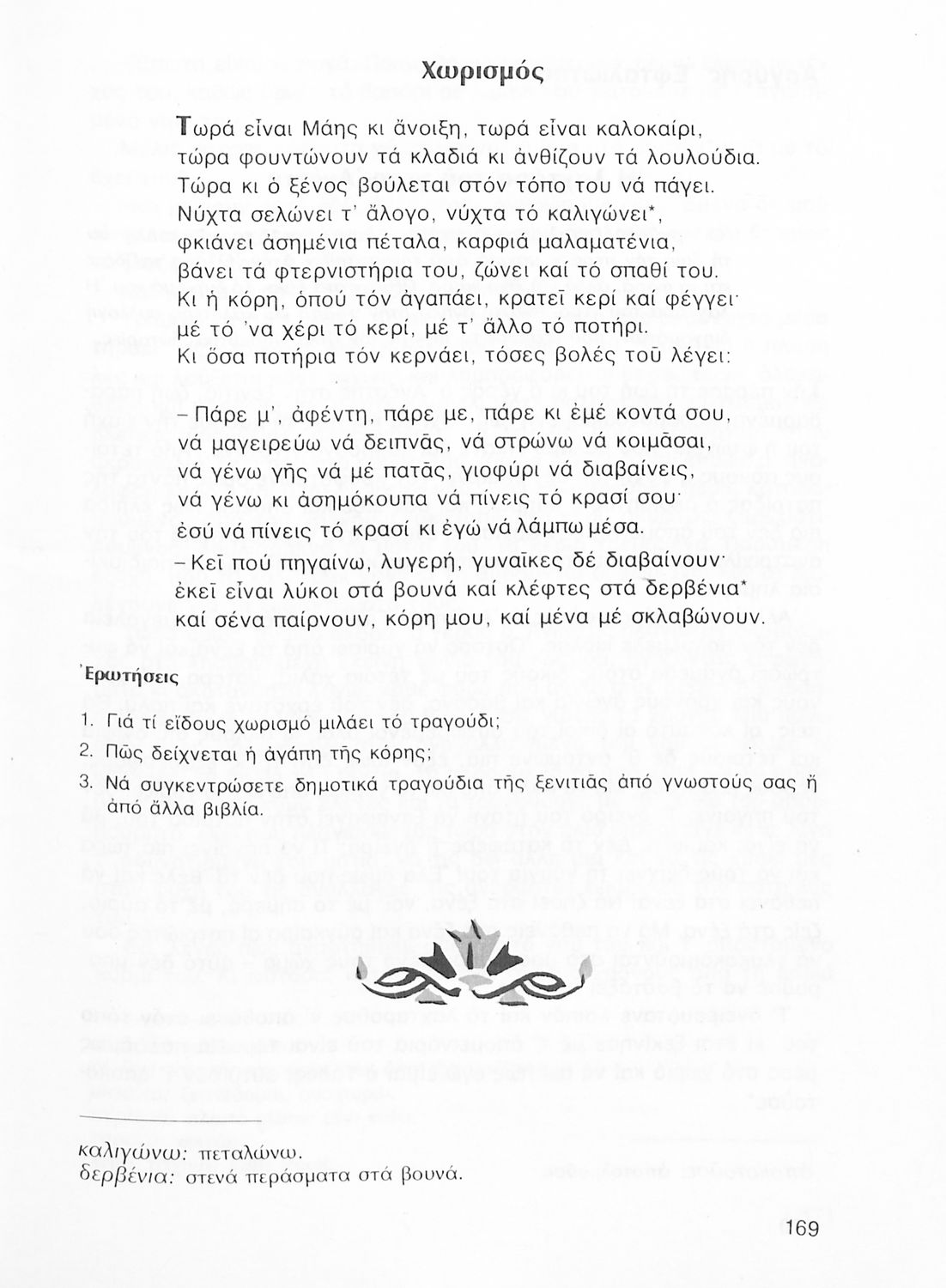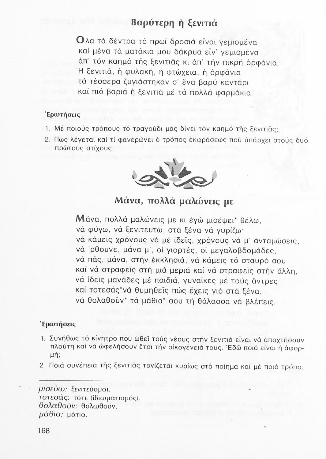 Σχολικό εγχειρίδιο Νέων Ελληνικών Β' Γυμνασίου που περιέχει δημοτικά τραγούδια, πεζά, δοκίμια και ποιήματα σύγχρονων Ελλήνων συγγραφέων και είναι χωρισμένο σε θεματικές ενότητες όπως η πόλη και η ύπαιθρος, η εποχή του 40' και η κατοχή, η θρησκευτική ζωή, ο καημός της ξενιτιάς, ο ελληνισμός έξω από τα σύνορα, οι αγώνες Ακριτών-Κλεφτών κ.α. Περιλαμβάνει και έργα ευρωπαίων λογοτεχνών.