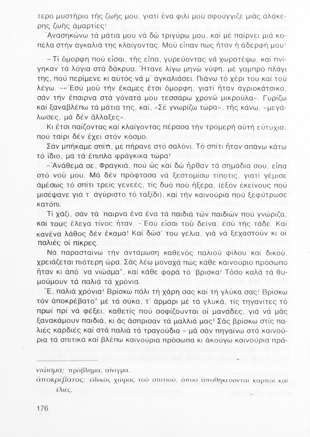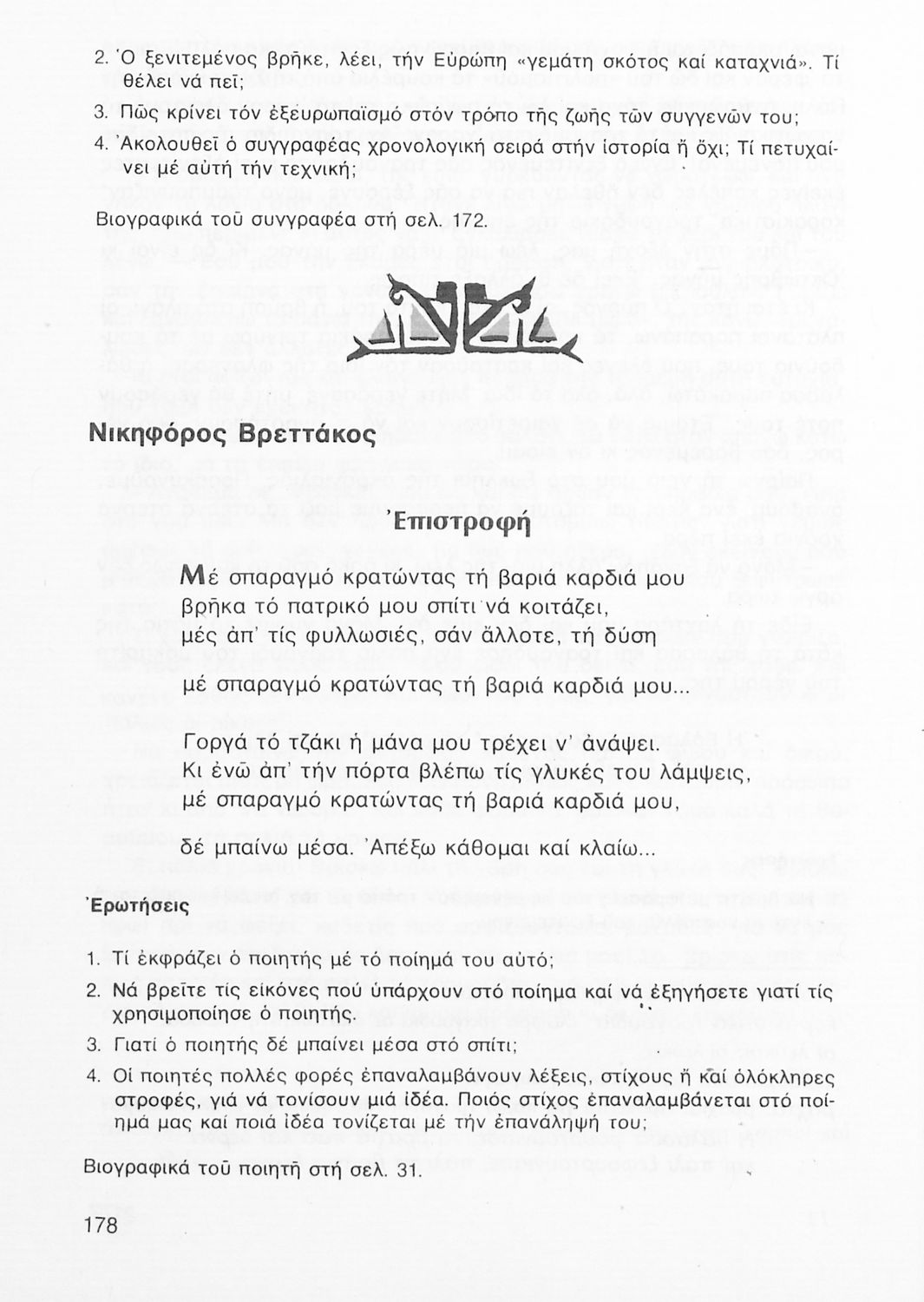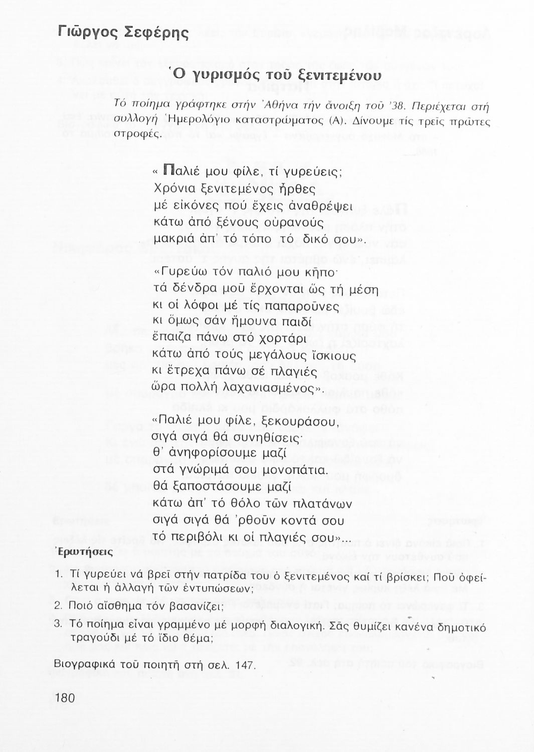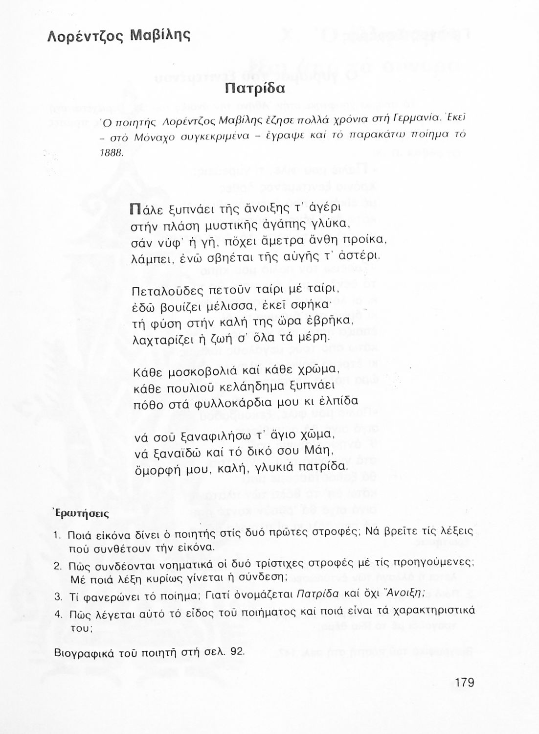 Σχολικό εγχειρίδιο Νέων Ελληνικών Β' Γυμνασίου που περιέχει δημοτικά τραγούδια, πεζά, δοκίμια και ποιήματα σύγχρονων Ελλήνων συγγραφέων και είναι χωρισμένο σε θεματικές ενότητες όπως η πόλη και η ύπαιθρος, η εποχή του 40' και η κατοχή, η θρησκευτική ζωή, ο καημός της ξενιτιάς, ο ελληνισμός έξω από τα σύνορα, οι αγώνες Ακριτών-Κλεφτών κ.α. Περιλαμβάνει και έργα ευρωπαίων λογοτεχνών.