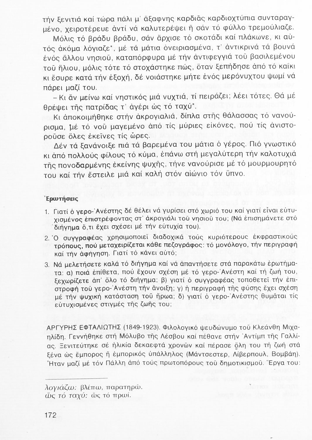 Σχολικό εγχειρίδιο Νέων Ελληνικών Α΄ Γυμνασίου που περιλαμβάνει δοκίμια, πεζά και ποιήματα Ελλήνων συγγραφέων και δημοτικά τραγούδια εμπνευσμένα από τη θρησκευτική, εθνική και κοινωνική ζωή, τη "δοκιμασία της ...