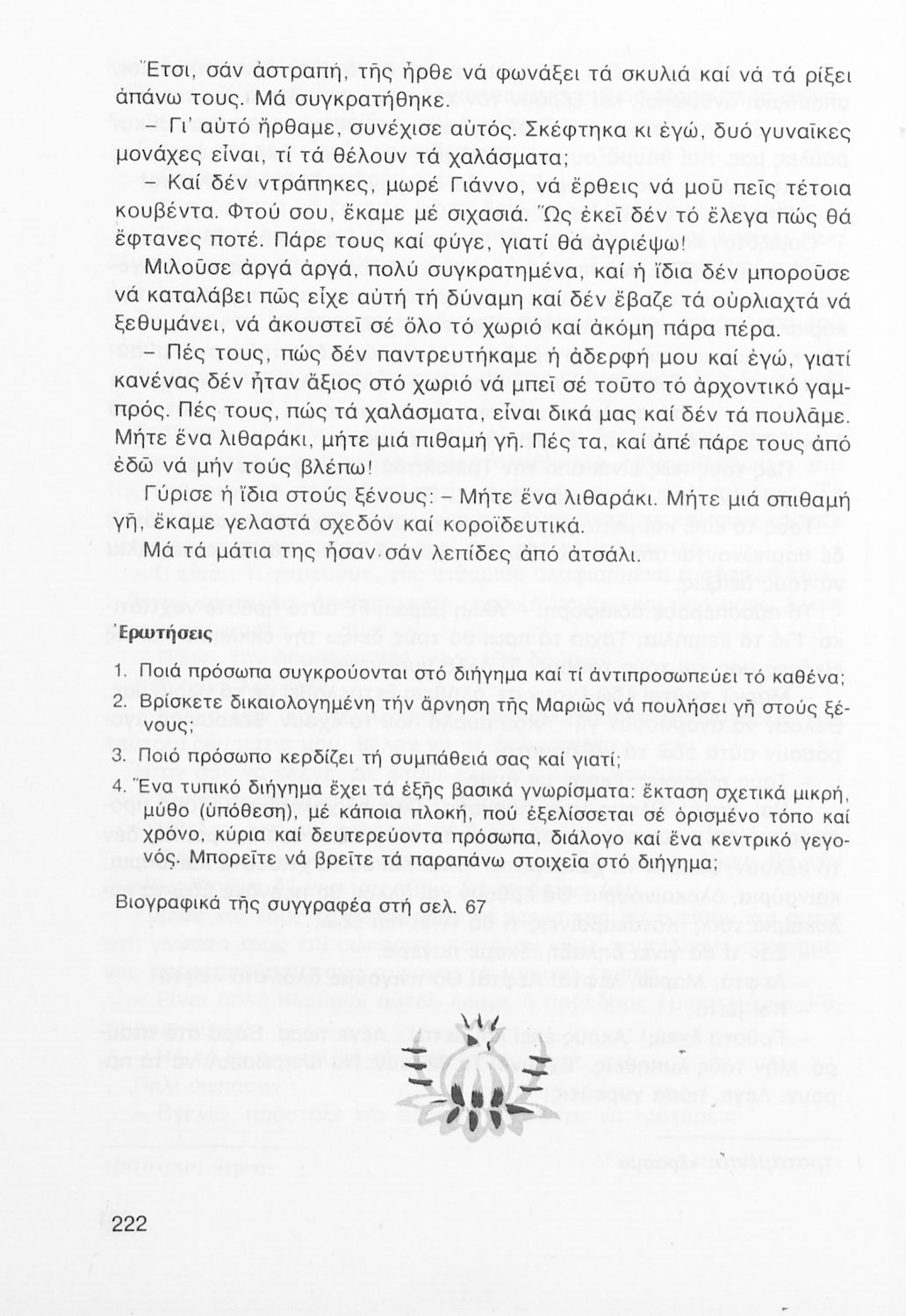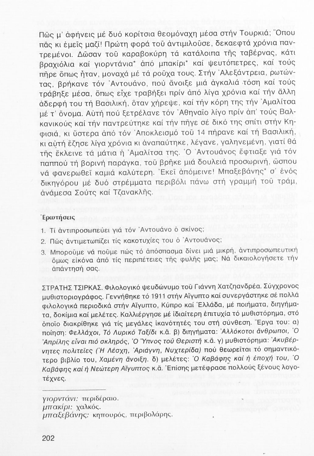 Σχολικό εγχειρίδιο Νέων Ελληνικών Β' Γυμνασίου που περιέχει δημοτικά τραγούδια, πεζά, δοκίμια και ποιήματα σύγχρονων Ελλήνων συγγραφέων και είναι χωρισμένο σε θεματικές ενότητες όπως η πόλη και η ύπαιθρος, η εποχή του 40' και η κατοχή, η θρησκευτική ζωή, ο καημός της ξενιτιάς, ο ελληνισμός έξω από τα σύνορα, οι αγώνες Ακριτών-Κλεφτών κ.α. Περιλαμβάνει και έργα ευρωπαίων λογοτεχνών.