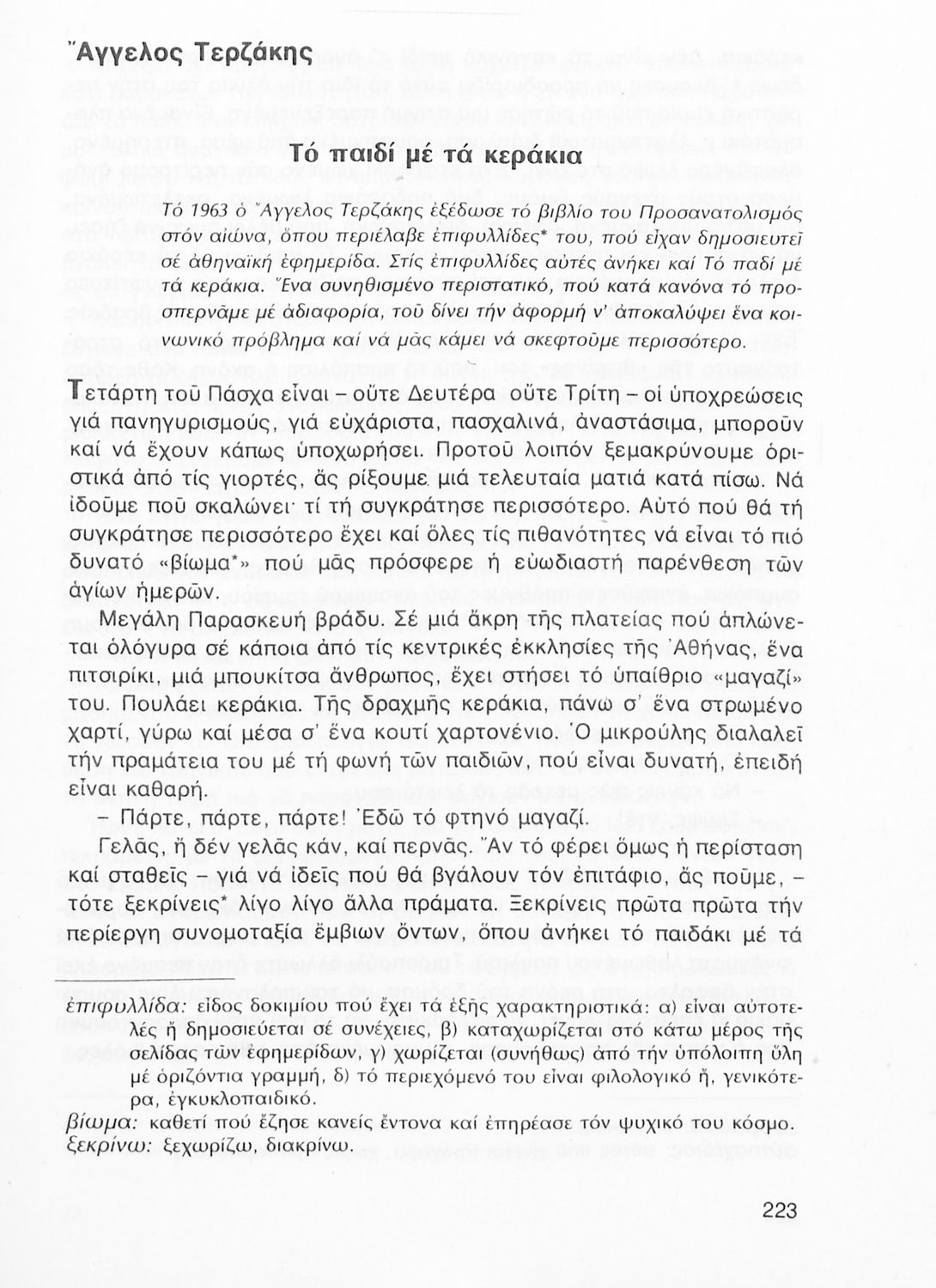 Σχολικό εγχειρίδιο Νέων Ελληνικών Α΄ Γυμνασίου που περιλαμβάνει δοκίμια, πεζά και ποιήματα Ελλήνων συγγραφέων και δημοτικά τραγούδια εμπνευσμένα από τη θρησκευτική, εθνική και κοινωνική ζωή, τη "δοκιμασία της ...