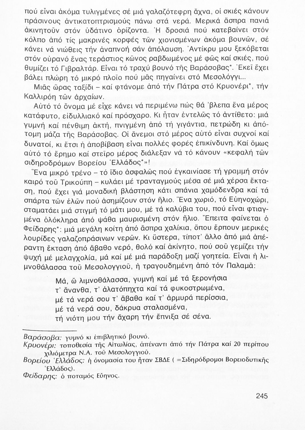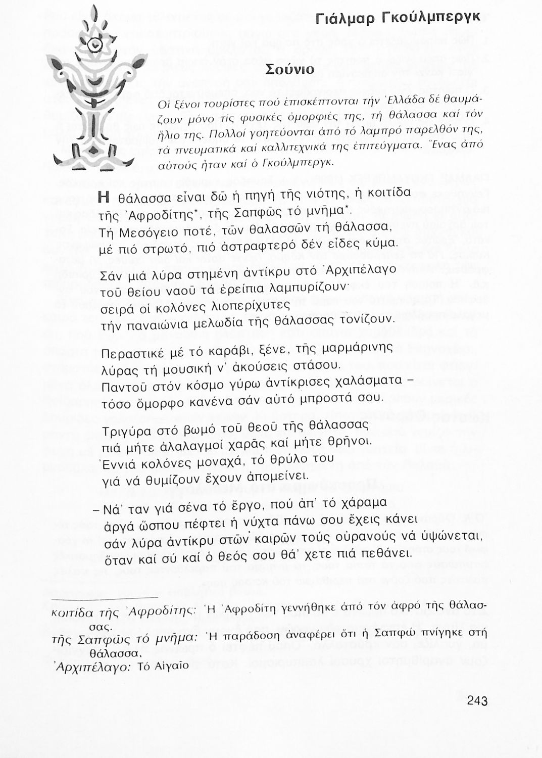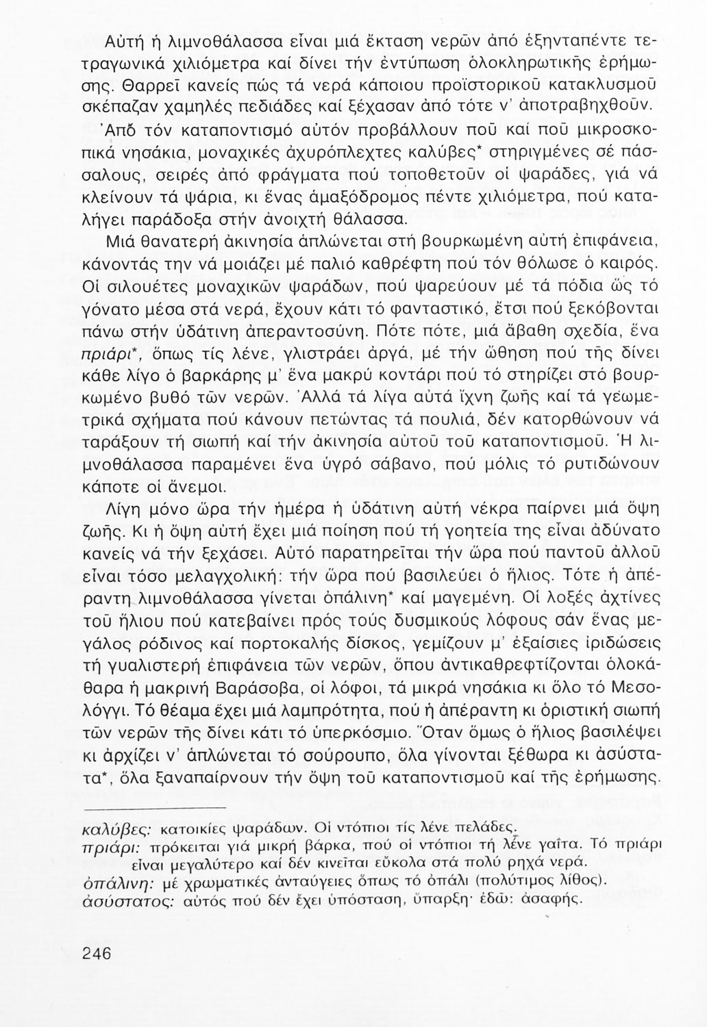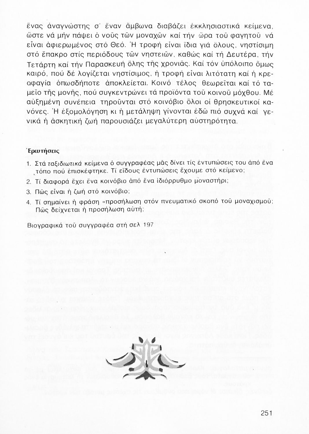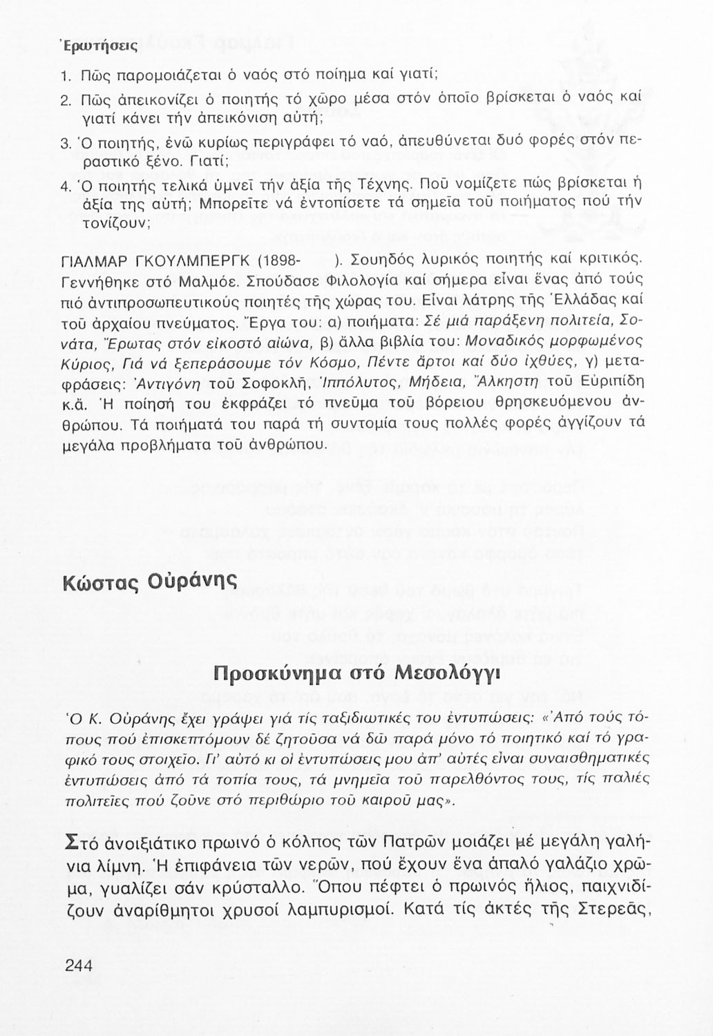 Σχολικό εγχειρίδιο Νέων Ελληνικών Β' Γυμνασίου που περιέχει δημοτικά τραγούδια, πεζά, δοκίμια και ποιήματα σύγχρονων Ελλήνων συγγραφέων και είναι χωρισμένο σε θεματικές ενότητες όπως η πόλη και η ύπαιθρος, η εποχή του 40' και η κατοχή, η θρησκευτική ζωή, ο καημός της ξενιτιάς, ο ελληνισμός έξω από τα σύνορα, οι αγώνες Ακριτών-Κλεφτών κ.α. Περιλαμβάνει και έργα ευρωπαίων λογοτεχνών.