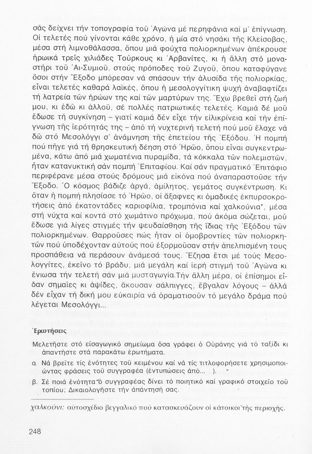 Παρουσίαση περιεχομένου: Σχολικό εγχειρίδιο Νέων Ελληνικών Β' Γυμνασίου που περιέχει δημοτικά τραγούδια, πεζά, δοκίμια και ποιήματα σύγχρονων Ελλήνων συγγραφέων και είναι χωρισμένο σε θεματικές ενότητες όπως η πόλη και η ύπαιθρος, η εποχή του 40' και η κατοχή, η θρησκευτική ζωή, ο καημός της ξενιτιάς, ο ελληνισμός έξω από τα σύνορα, οι αγώνες Ακριτών-Κλεφτών κ.α. Περιλαμβάνει και έργα ευρωπαίων λογοτεχνών.