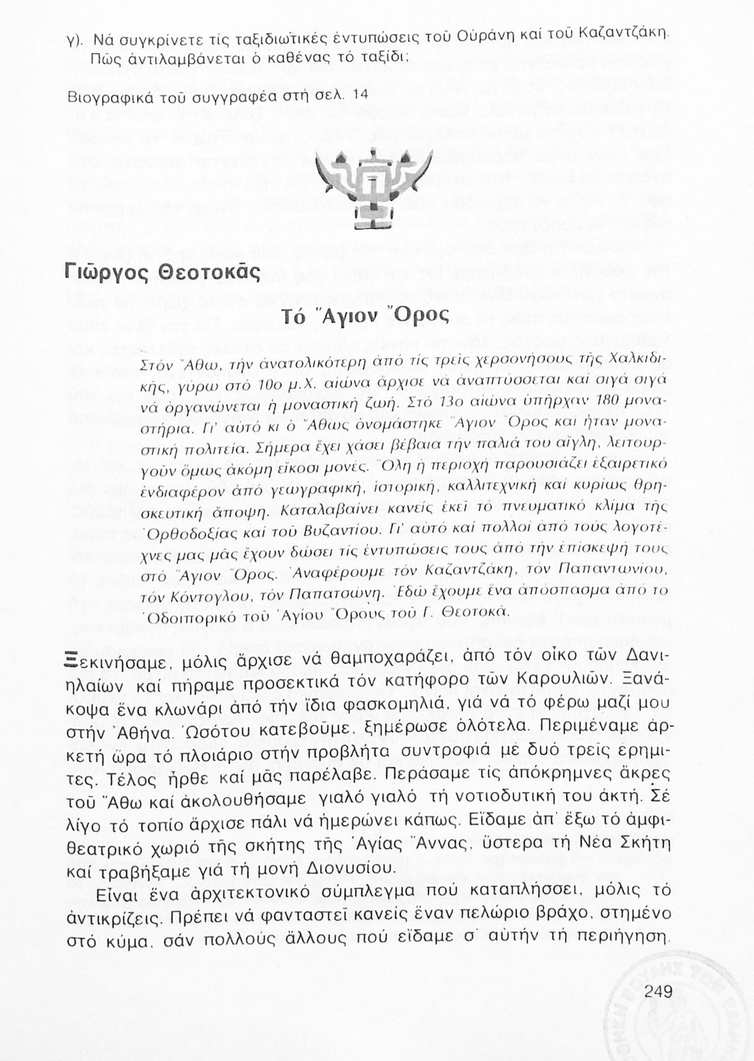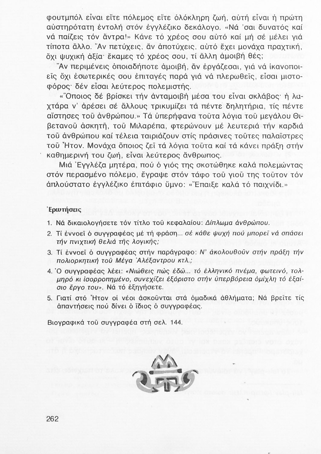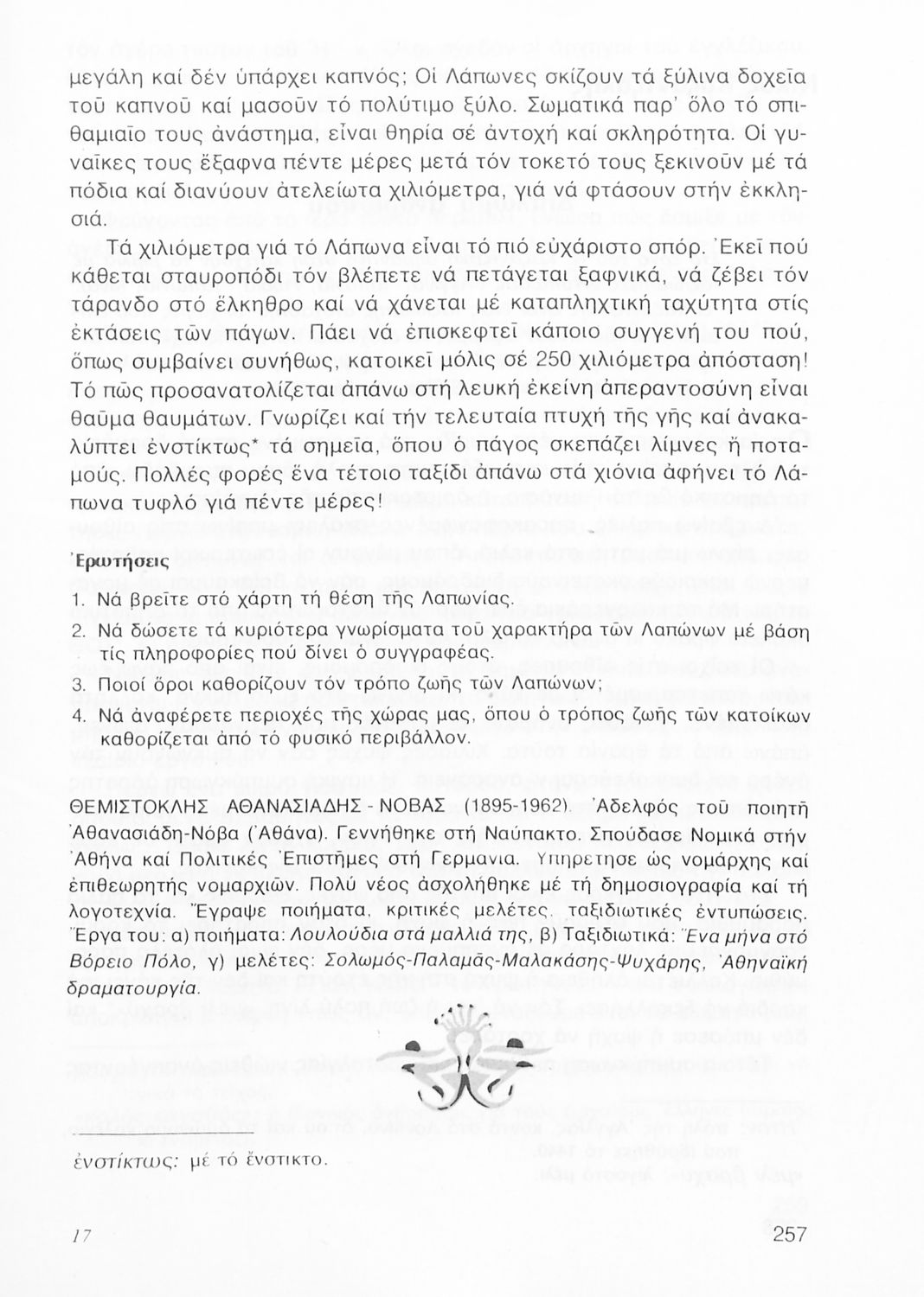 Σχολικό εγχειρίδιο Νέων Ελληνικών Α΄ Γυμνασίου που περιλαμβάνει δοκίμια, πεζά και ποιήματα Ελλήνων συγγραφέων και δημοτικά τραγούδια εμπνευσμένα από τη θρησκευτική, εθνική και κοινωνική ζωή, τη "δοκιμασία της ...