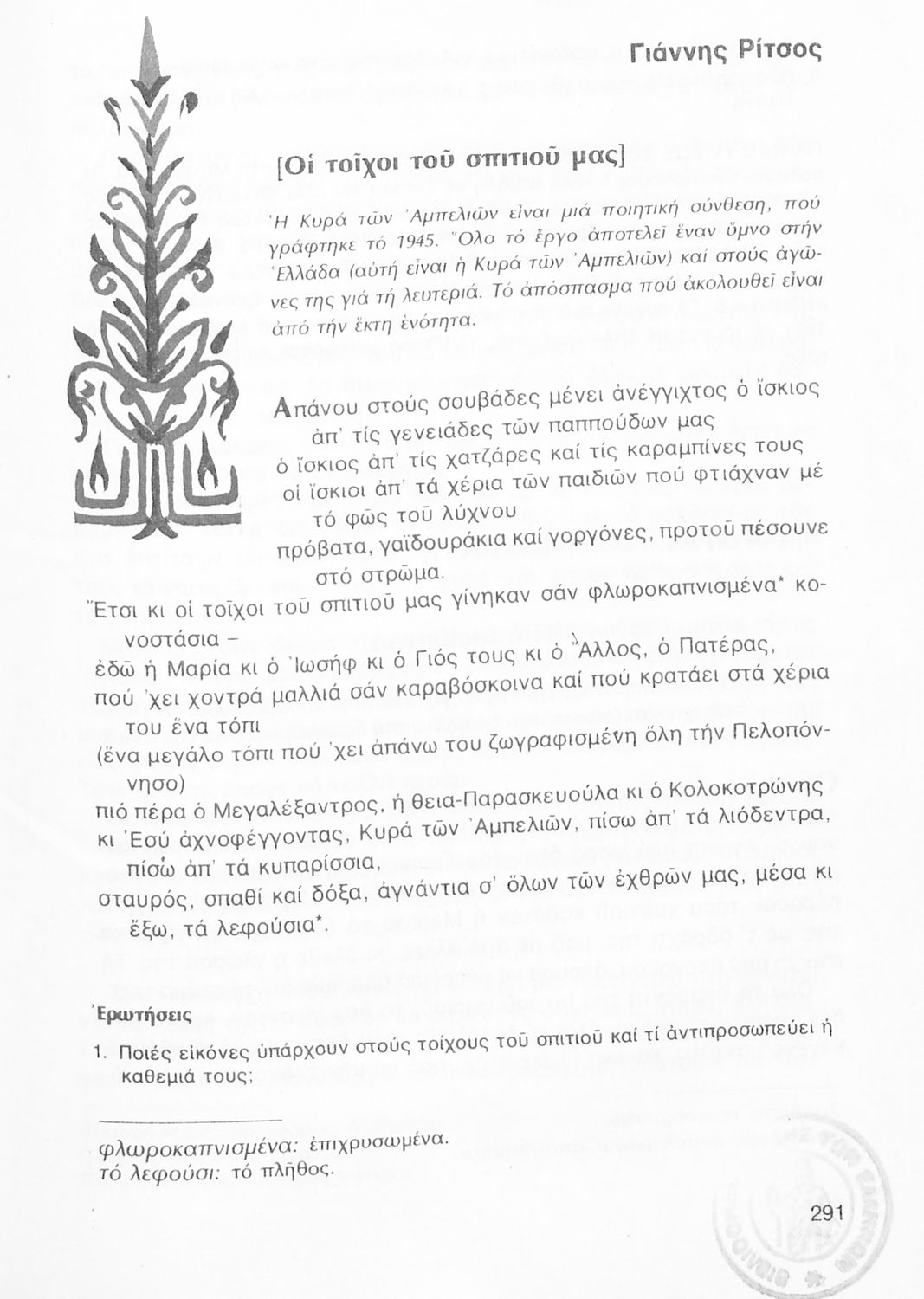 Σχολικό εγχειρίδιο Νέων Ελληνικών Β' Γυμνασίου που περιέχει δημοτικά τραγούδια, πεζά, δοκίμια και ποιήματα σύγχρονων Ελλήνων συγγραφέων και είναι χωρισμένο σε θεματικές ενότητες όπως η πόλη και η ύπαιθρος, η εποχή του 40' και η κατοχή, η θρησκευτική ζωή, ο καημός της ξενιτιάς, ο ελληνισμός έξω από τα σύνορα, οι αγώνες Ακριτών-Κλεφτών κ.α. Περιλαμβάνει και έργα ευρωπαίων λογοτεχνών.