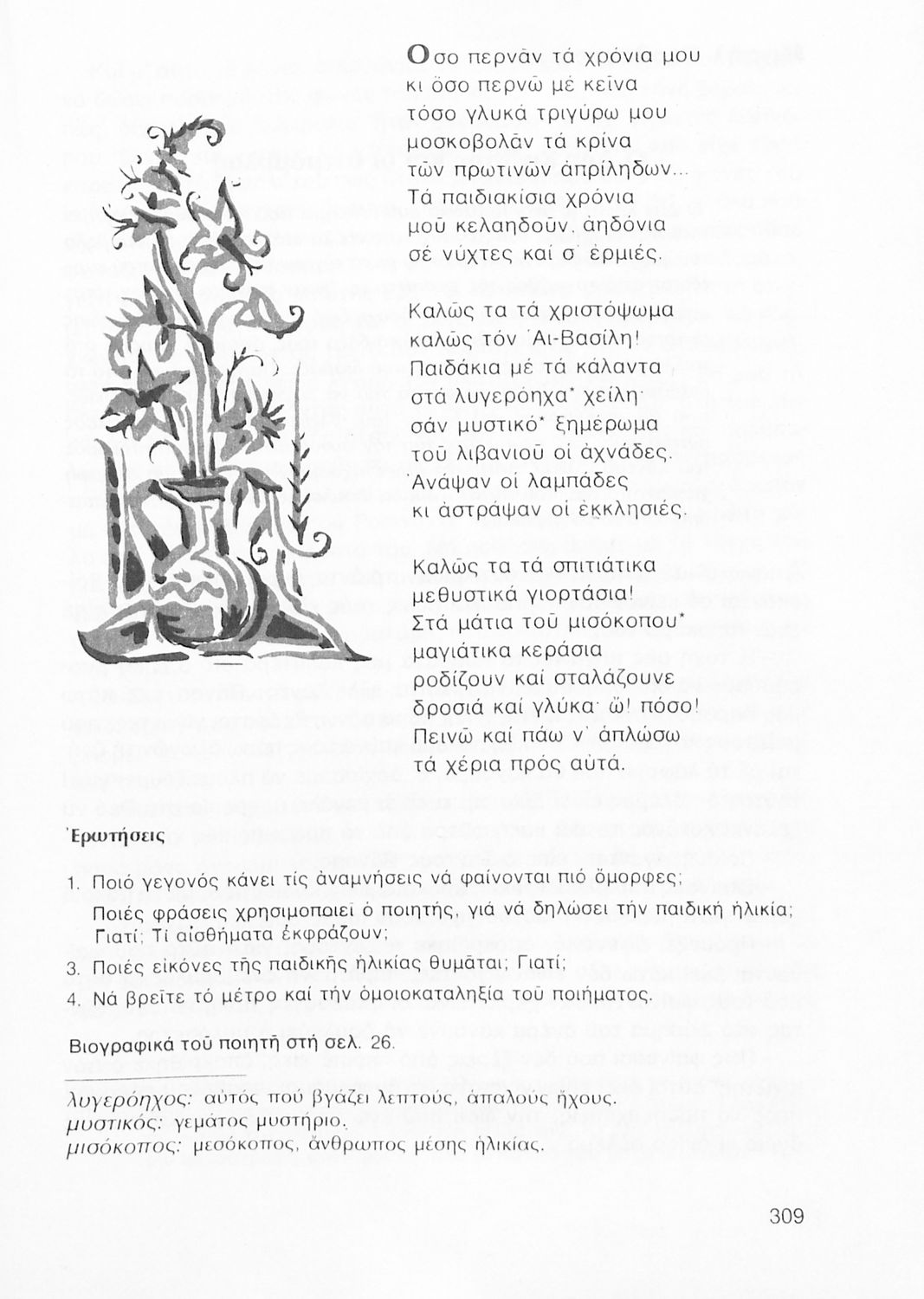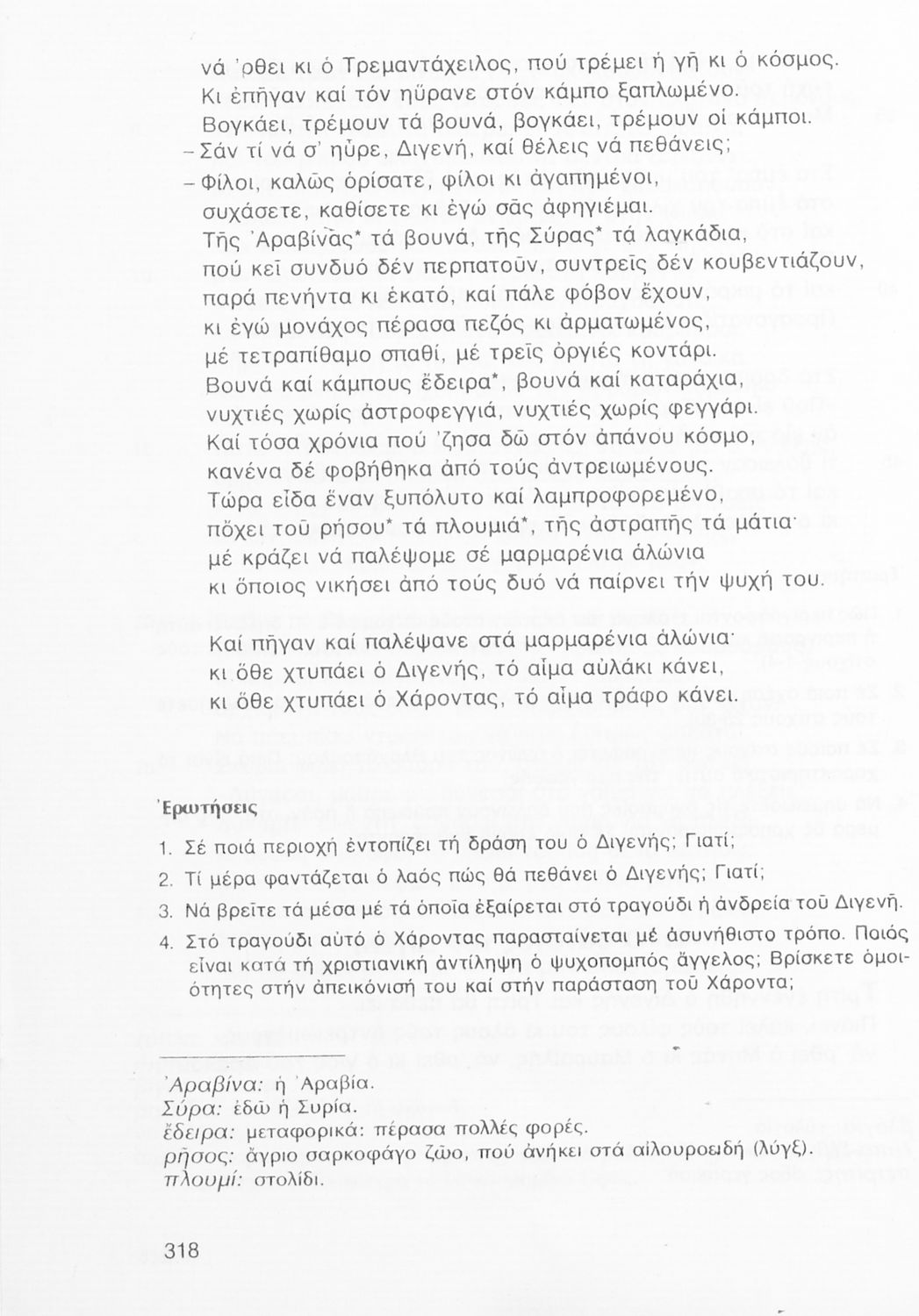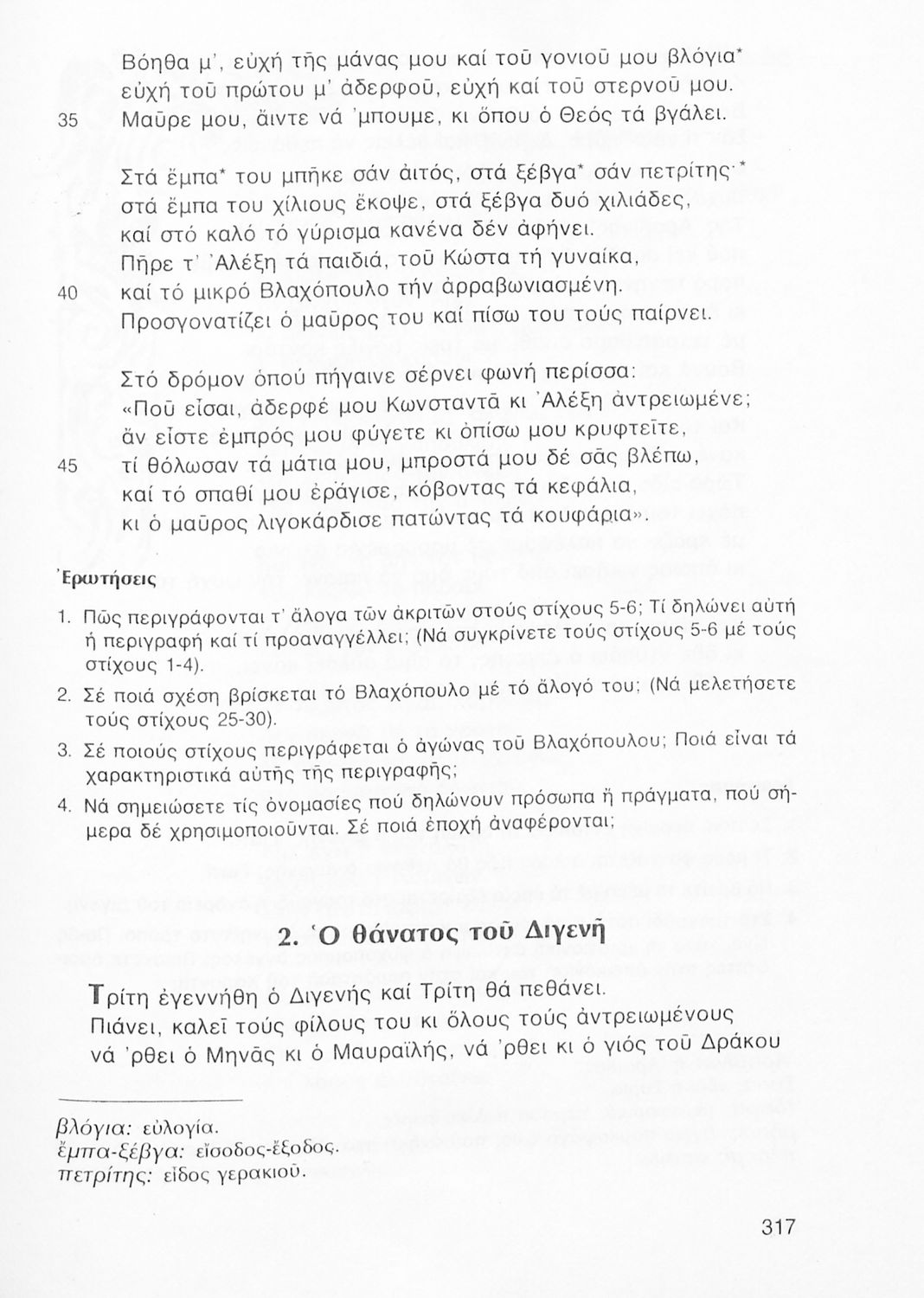Σχολικό εγχειρίδιο Νέων Ελληνικών Β' Γυμνασίου που περιέχει δημοτικά τραγούδια, πεζά, δοκίμια και ποιήματα σύγχρονων Ελλήνων συγγραφέων και είναι χωρισμένο σε θεματικές ενότητες όπως η πόλη και η ύπαιθρος, η εποχή του 40' και η κατοχή, η θρησκευτική ζωή, ο καημός της ξενιτιάς, ο ελληνισμός έξω από τα σύνορα, οι αγώνες Ακριτών-Κλεφτών κ.α. Περιλαμβάνει και έργα ευρωπαίων λογοτεχνών.