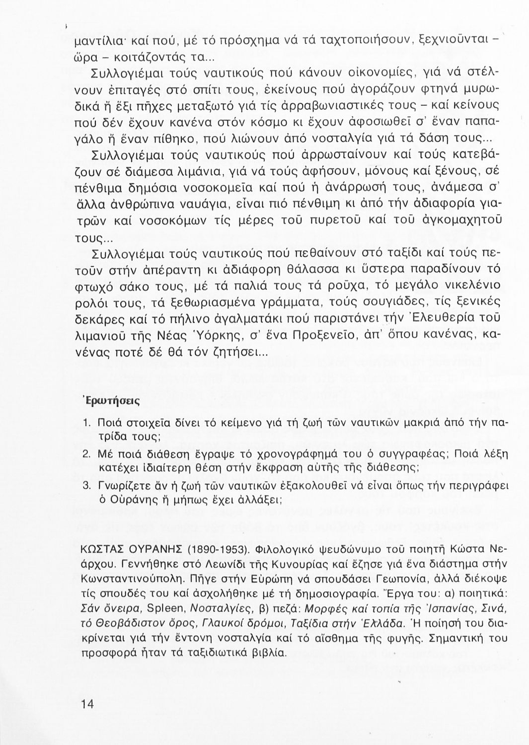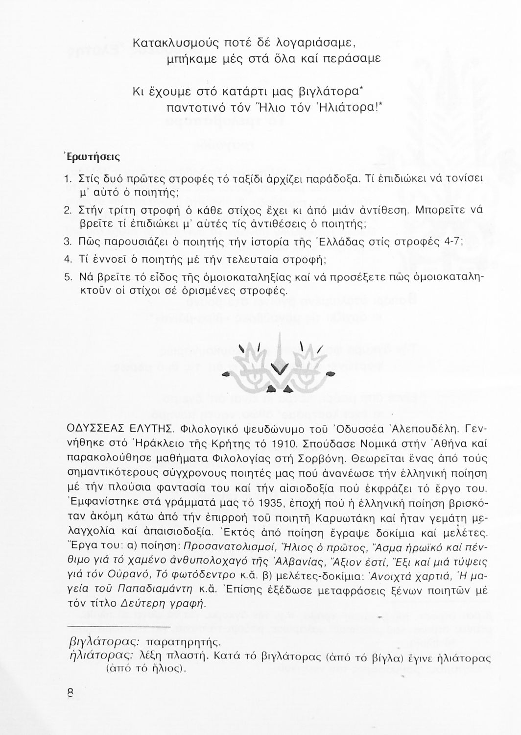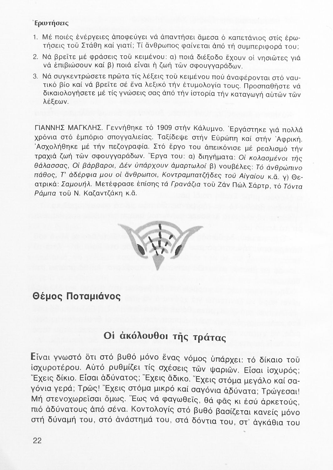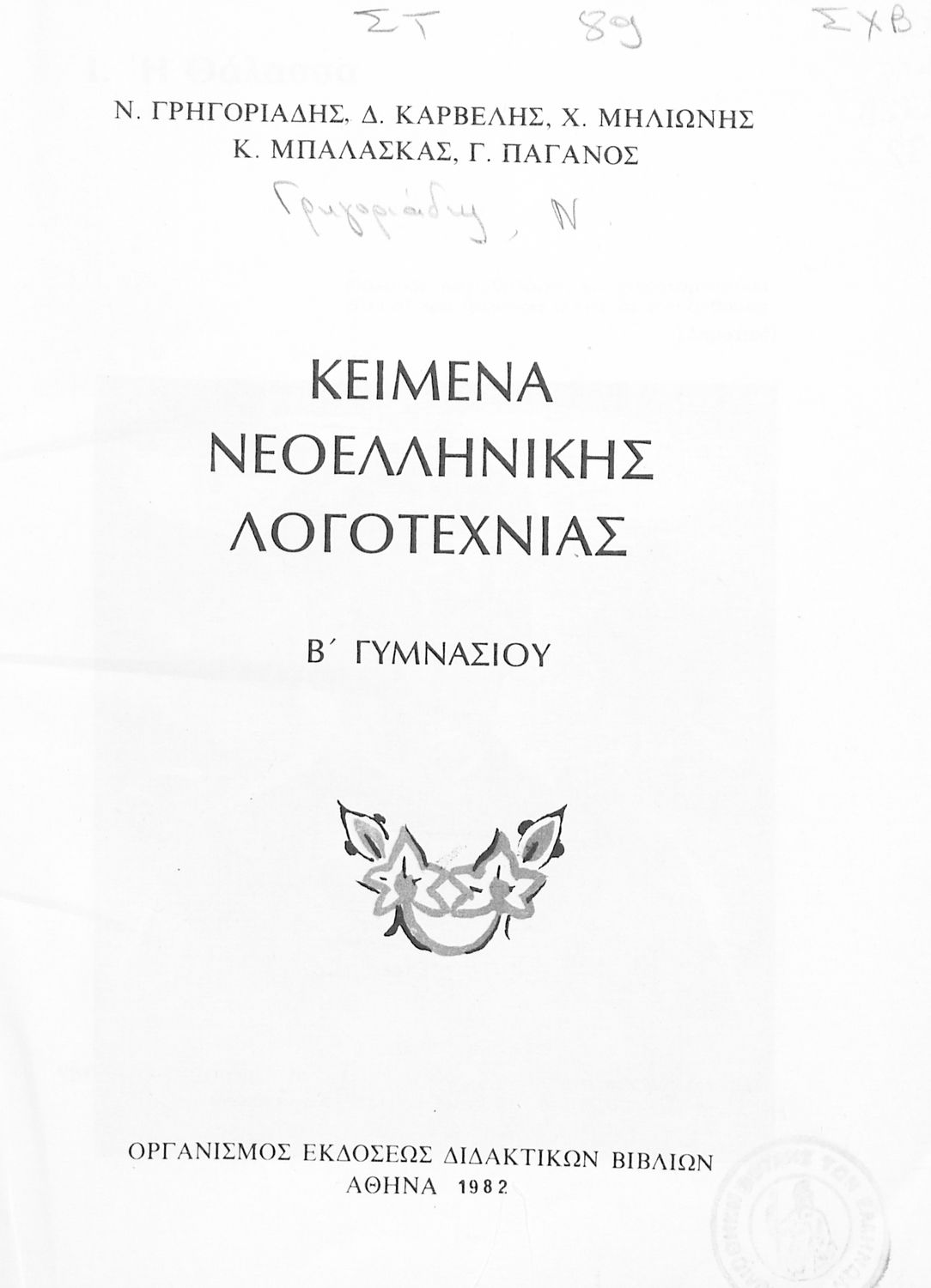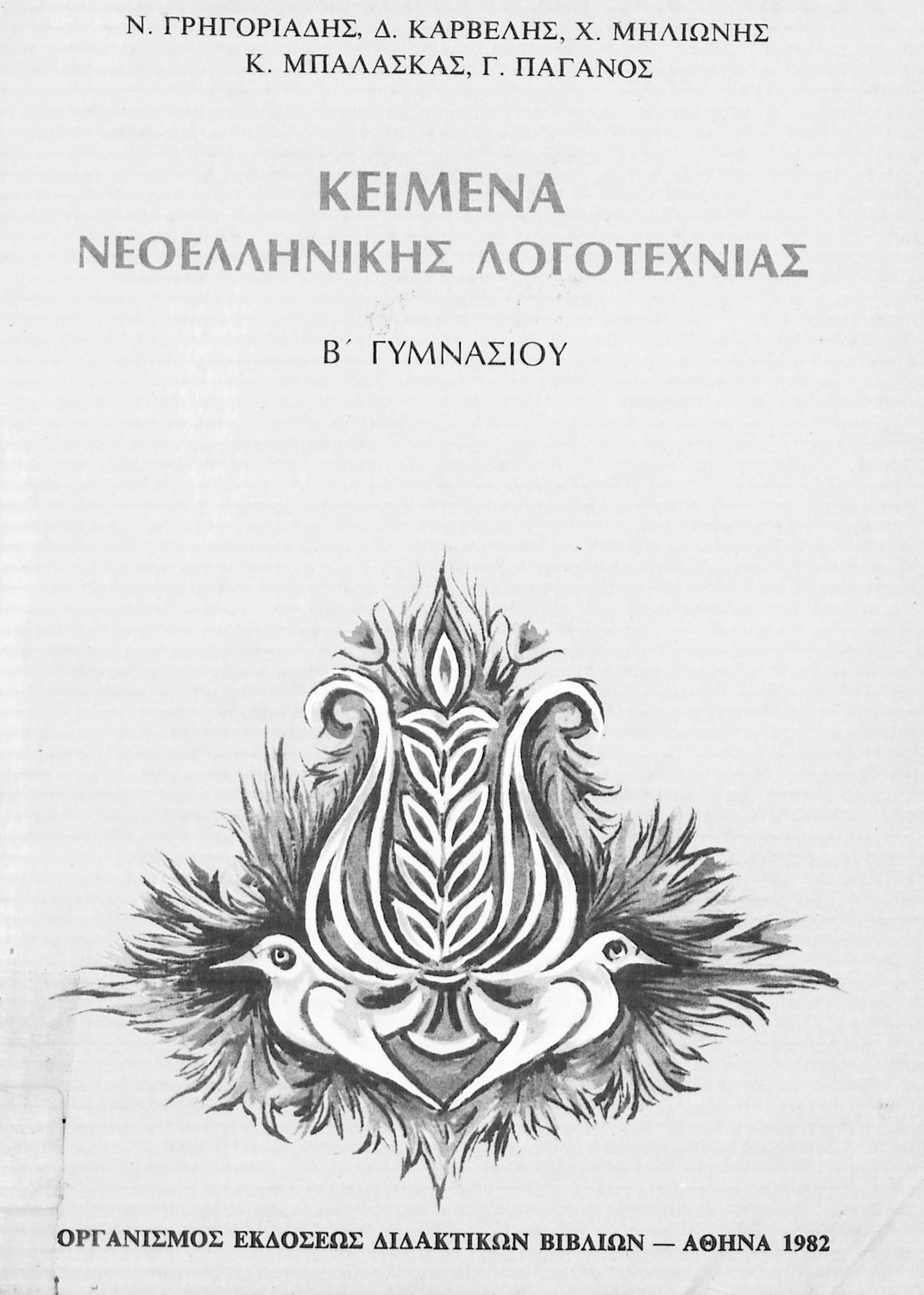 Σχολικό εγχειρίδιο Νέων Ελληνικών Β' Γυμνασίου που περιέχει δημοτικά τραγούδια, πεζά, δοκίμια και ποιήματα σύγχρονων Ελλήνων συγγραφέων και είναι χωρισμένο σε θεματικές ενότητες όπως η πόλη και η ύπαιθρος, η εποχή του 40' και η κατοχή, η θρησκευτική ζωή, ο καημός της ξενιτιάς, ο ελληνισμός έξω από τα σύνορα, οι αγώνες Ακριτών-Κλεφτών κ.α. Περιλαμβάνει και έργα ευρωπαίων λογοτεχνών.