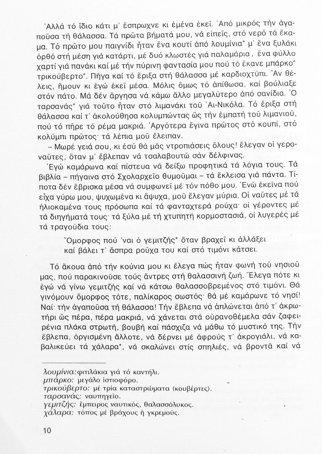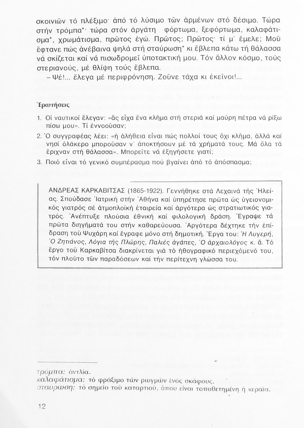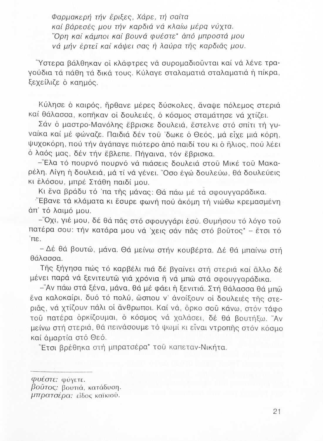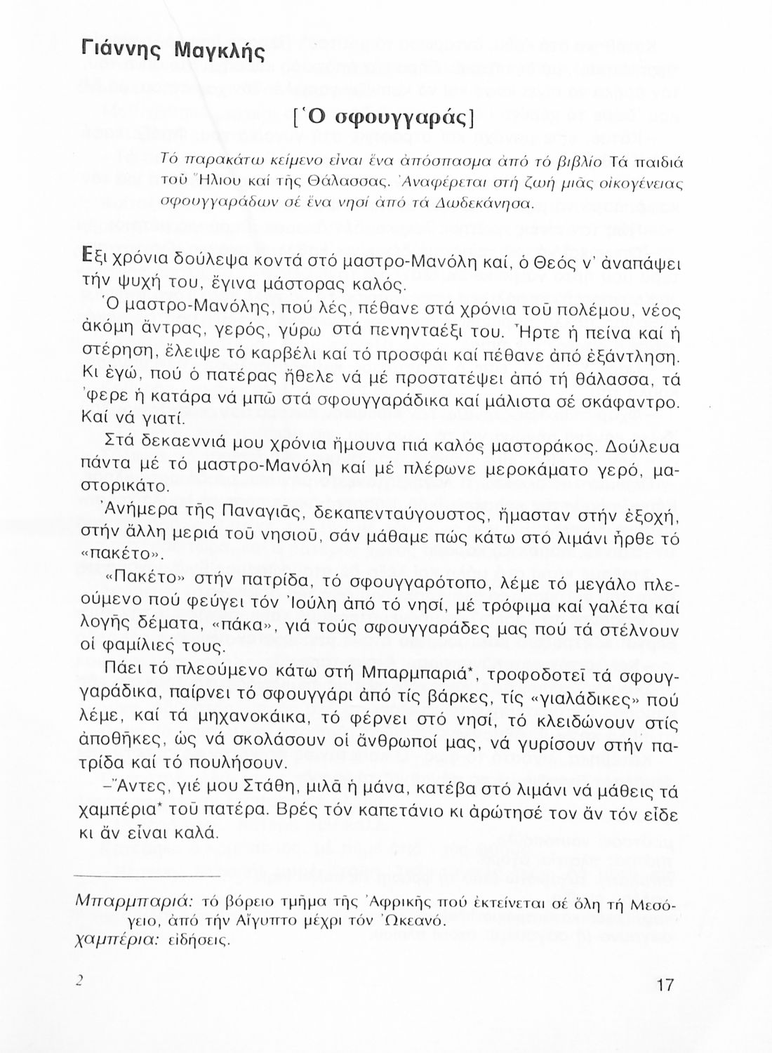 Σχολικό εγχειρίδιο Νέων Ελληνικών Β' Γυμνασίου που περιέχει δημοτικά τραγούδια, πεζά, δοκίμια και ποιήματα σύγχρονων Ελλήνων συγγραφέων και είναι χωρισμένο σε θεματικές ενότητες όπως η πόλη και η ύπαιθρος, η εποχή του 40' και η κατοχή, η θρησκευτική ζωή, ο καημός της ξενιτιάς, ο ελληνισμός έξω από τα σύνορα, οι αγώνες Ακριτών-Κλεφτών κ.α. Περιλαμβάνει και έργα ευρωπαίων λογοτεχνών.