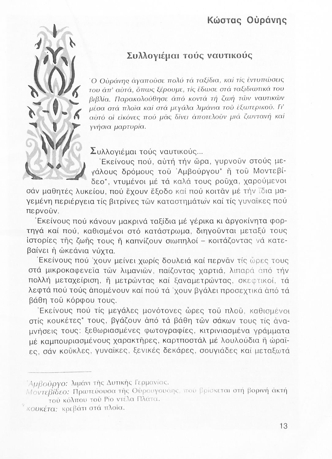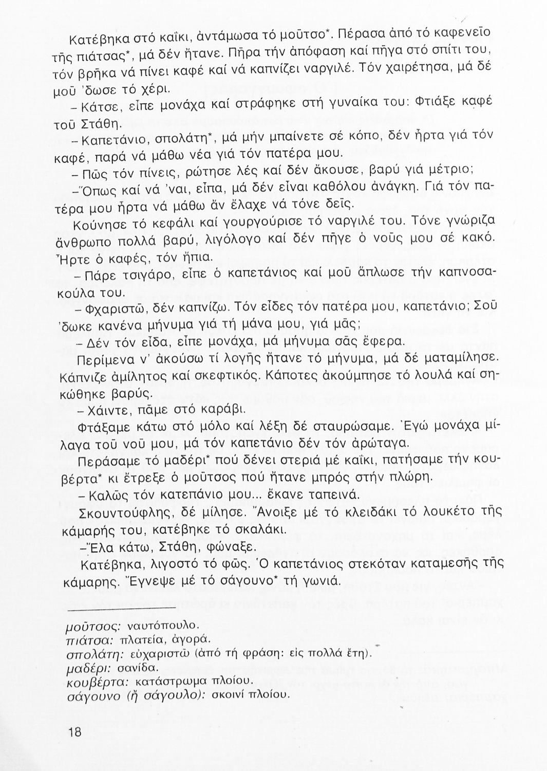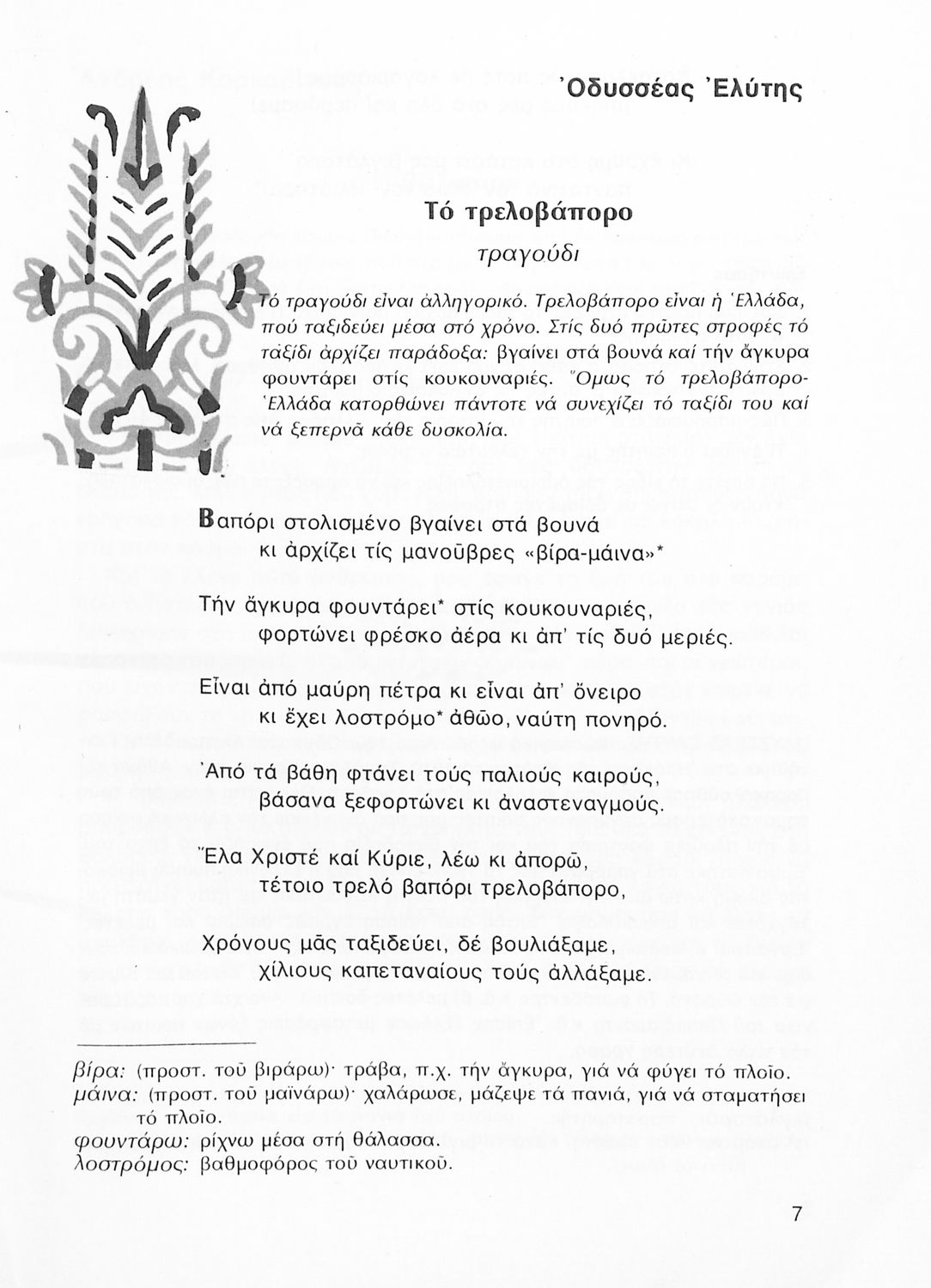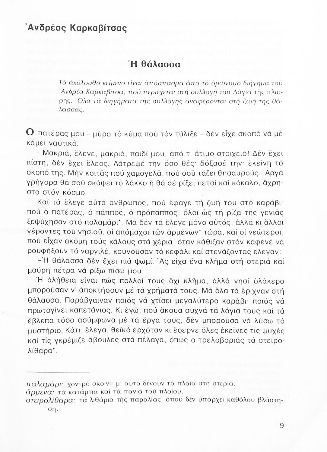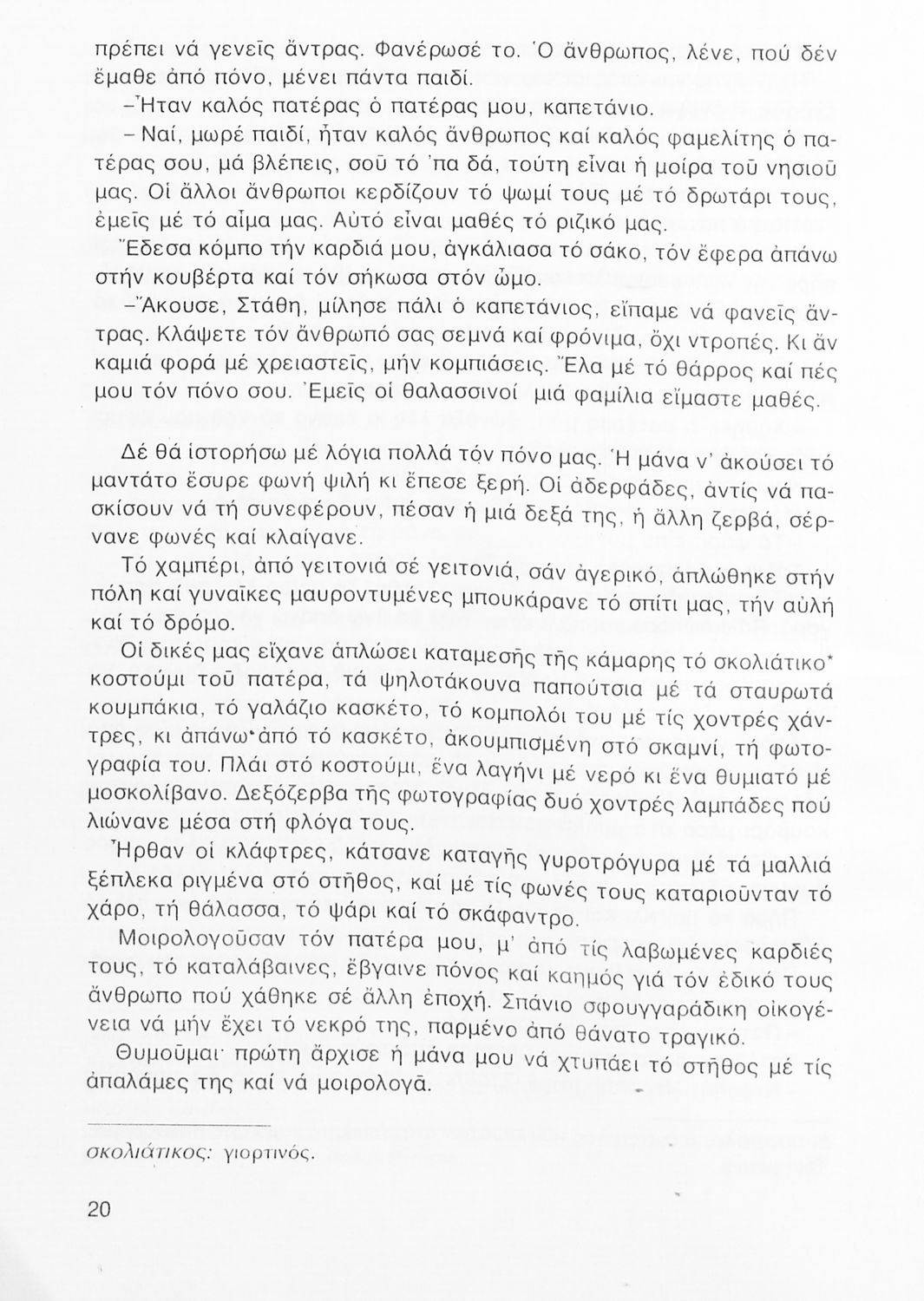 Σχολικό εγχειρίδιο Νέων Ελληνικών Β' Γυμνασίου που περιέχει δημοτικά τραγούδια, πεζά, δοκίμια και ποιήματα σύγχρονων Ελλήνων συγγραφέων και είναι χωρισμένο σε θεματικές ενότητες όπως η πόλη και η ύπαιθρος, η εποχή του 40' και η κατοχή, η θρησκευτική ζωή, ο καημός της ξενιτιάς, ο ελληνισμός έξω από τα σύνορα, οι αγώνες Ακριτών-Κλεφτών κ.α. Περιλαμβάνει και έργα ευρωπαίων λογοτεχνών.