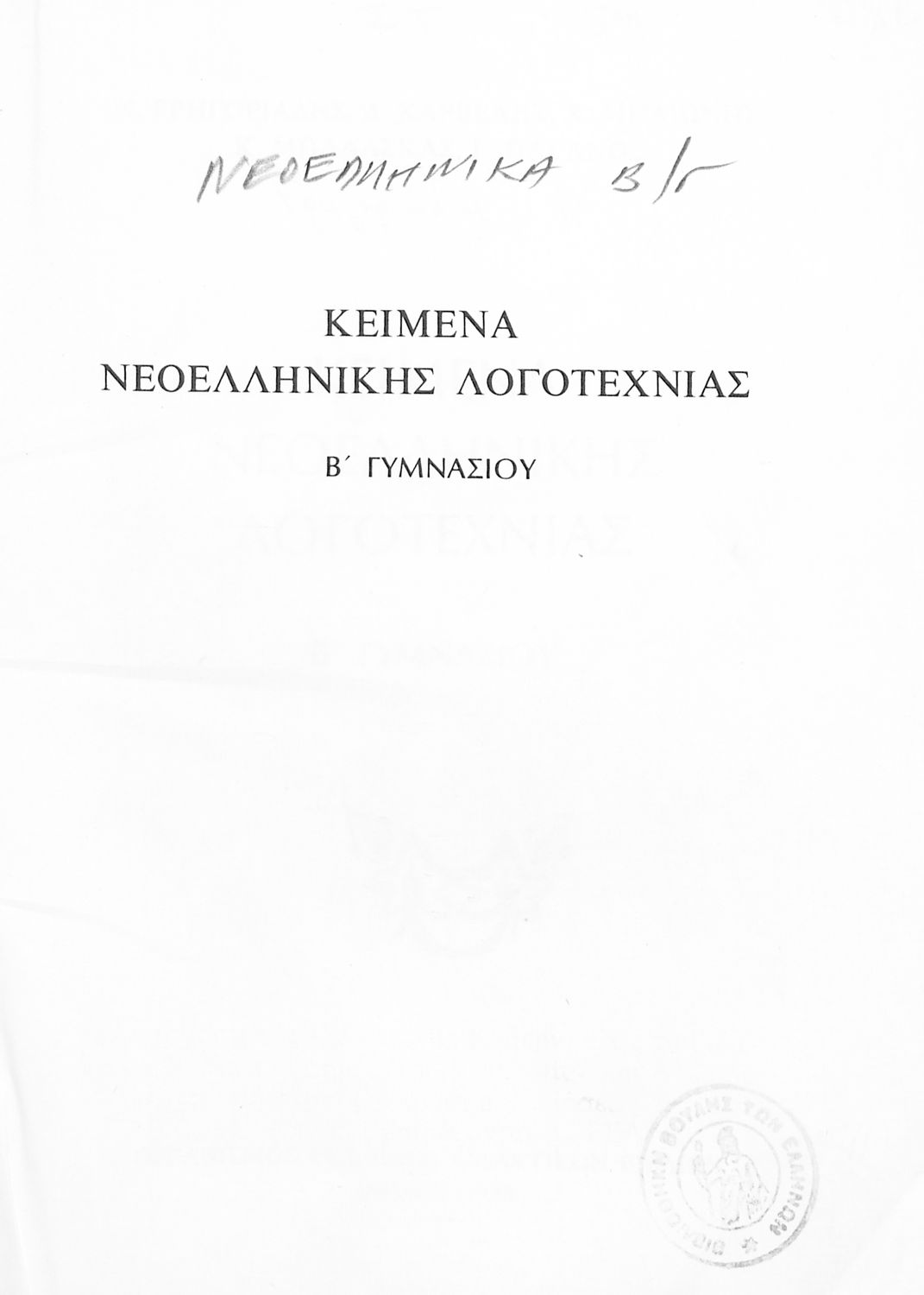 Βαθμίδα εκπαίδευσης: Δευτεροβάθμια Τάξη: Β' Γυμνασίου Μάθημα: Νέα Ελληνικά Γλώσσα: Δημοτική Παρουσίαση περιεχομένου: Σχολικό εγχειρίδιο Νέων Ελληνικών Β' Γυμνασίου που περιέχει δημοτικά τραγούδια, πεζά, δοκίμια και ποιήματα σύγχρονων Ελλήνων συγγραφέων και είναι χωρισμένο σε θεματικές ενότητες όπως η πόλη και η ύπαιθρος, η εποχή του 40' και η κατοχή, η θρησκευτική ζωή, ο καημός της ξενιτιάς, ο ελληνισμός έξω από τα σύνορα, οι αγώνες Ακριτών-Κλεφτών κ.α. Περιλαμβάνει και έργα ευρωπαίων λογοτεχνών. |