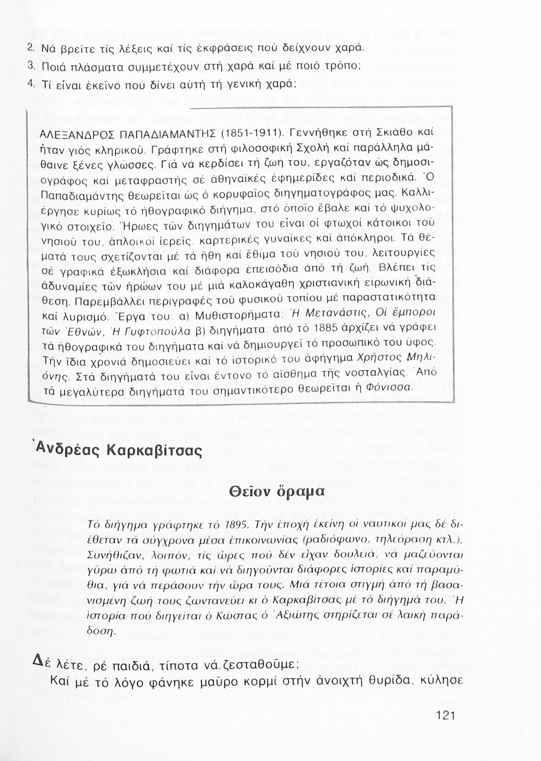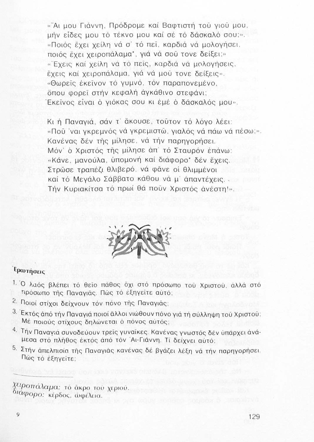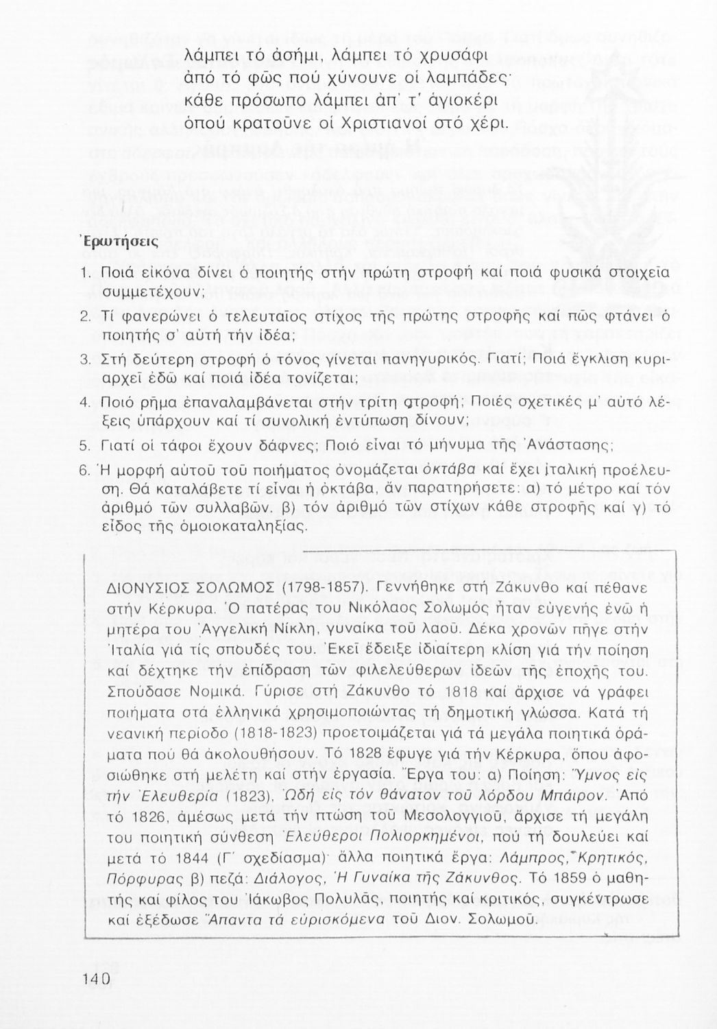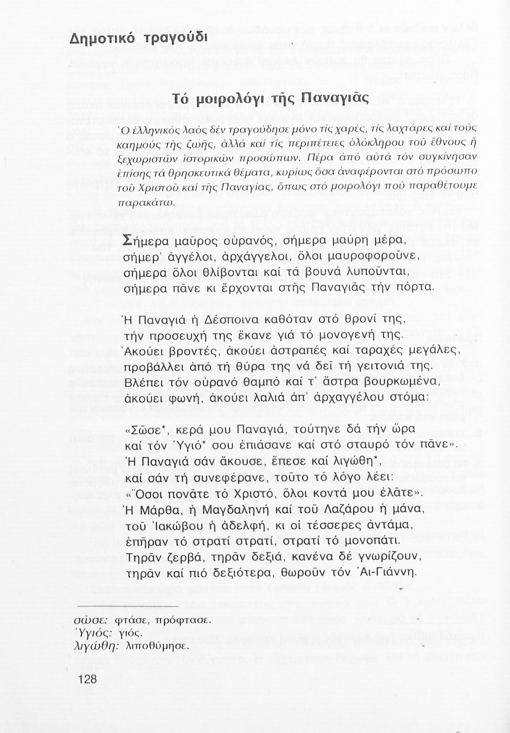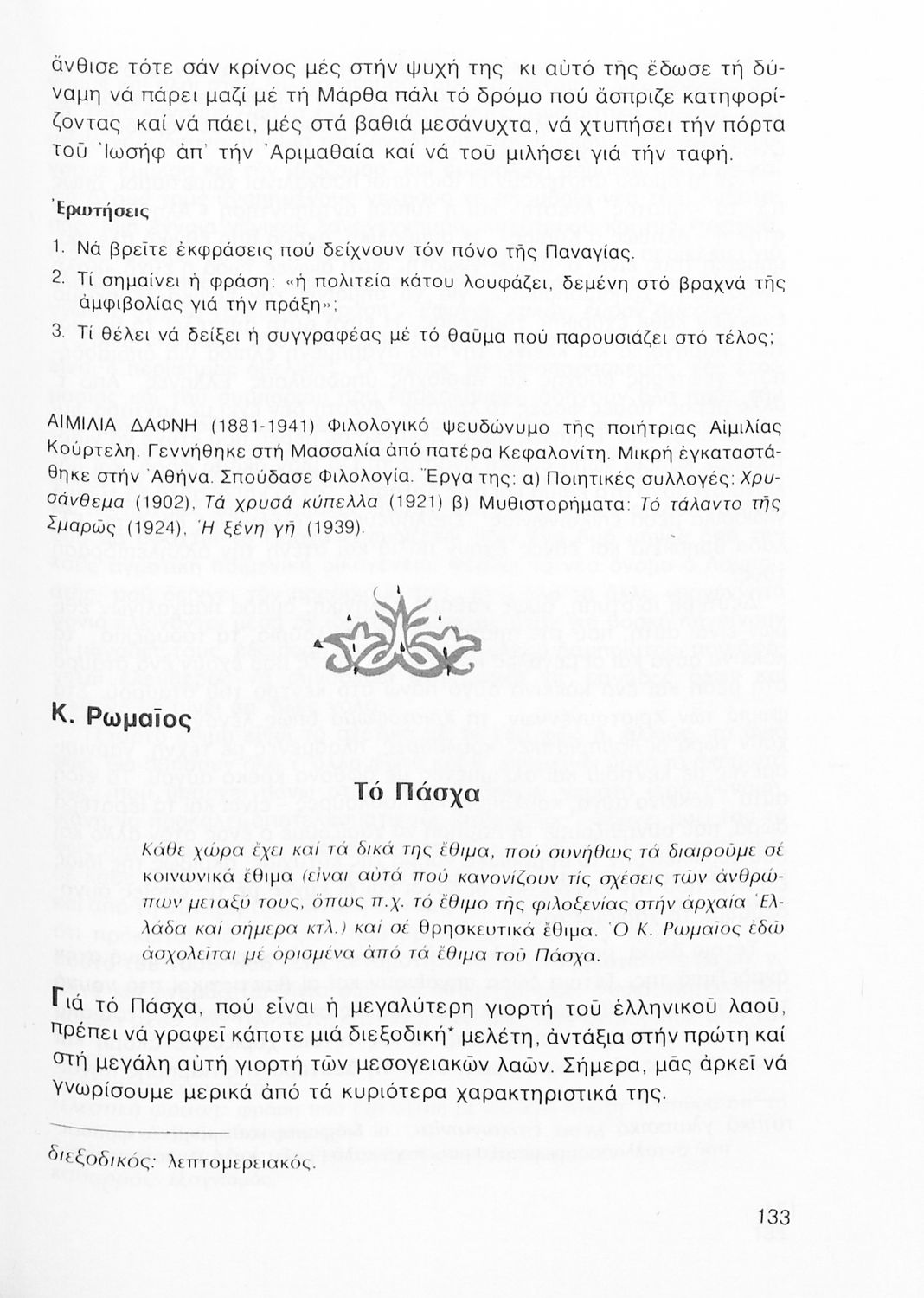 Σχολικό εγχειρίδιο Νέων Ελληνικών Β' Γυμνασίου που περιέχει δημοτικά τραγούδια, πεζά, δοκίμια και ποιήματα σύγχρονων Ελλήνων συγγραφέων και είναι χωρισμένο σε θεματικές ενότητες όπως η πόλη και η ύπαιθρος, η εποχή του 40' και η κατοχή, η θρησκευτική ζωή, ο καημός της ξενιτιάς, ο ελληνισμός έξω από τα σύνορα, οι αγώνες Ακριτών-Κλεφτών κ.α. Περιλαμβάνει και έργα ευρωπαίων λογοτεχνών.