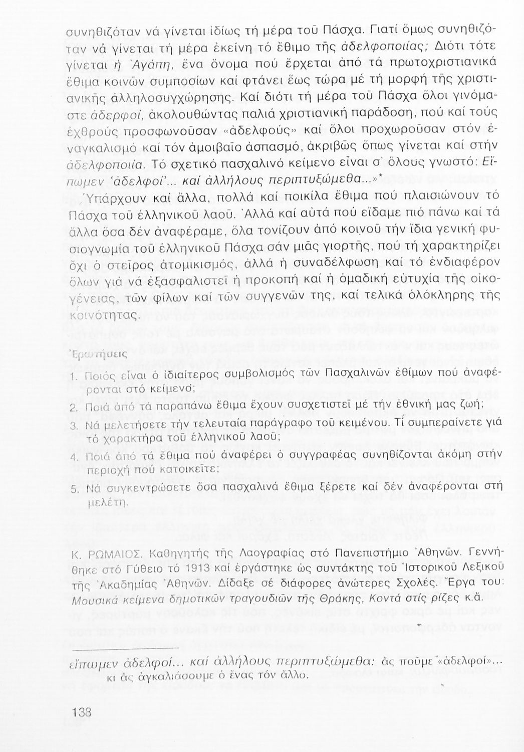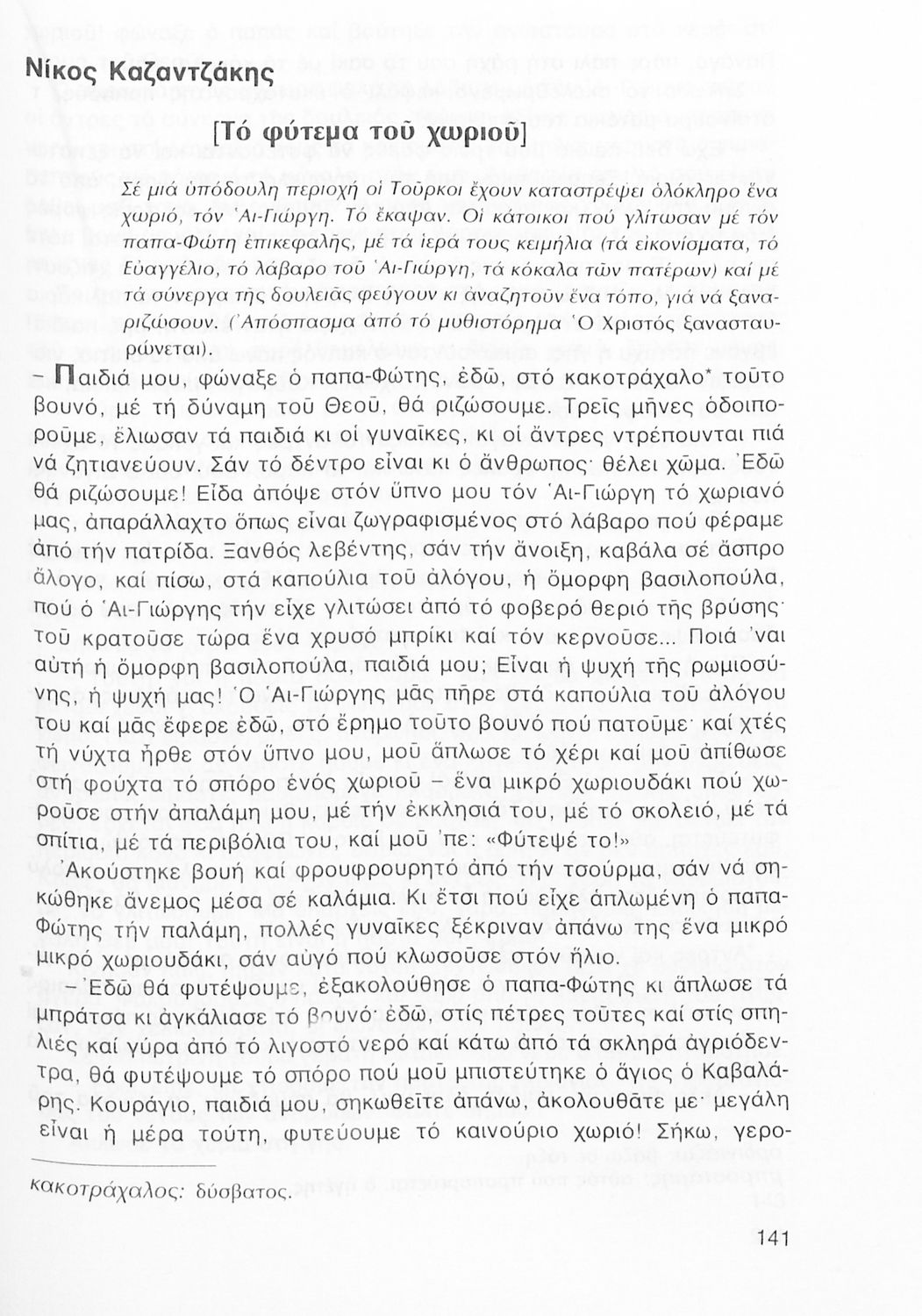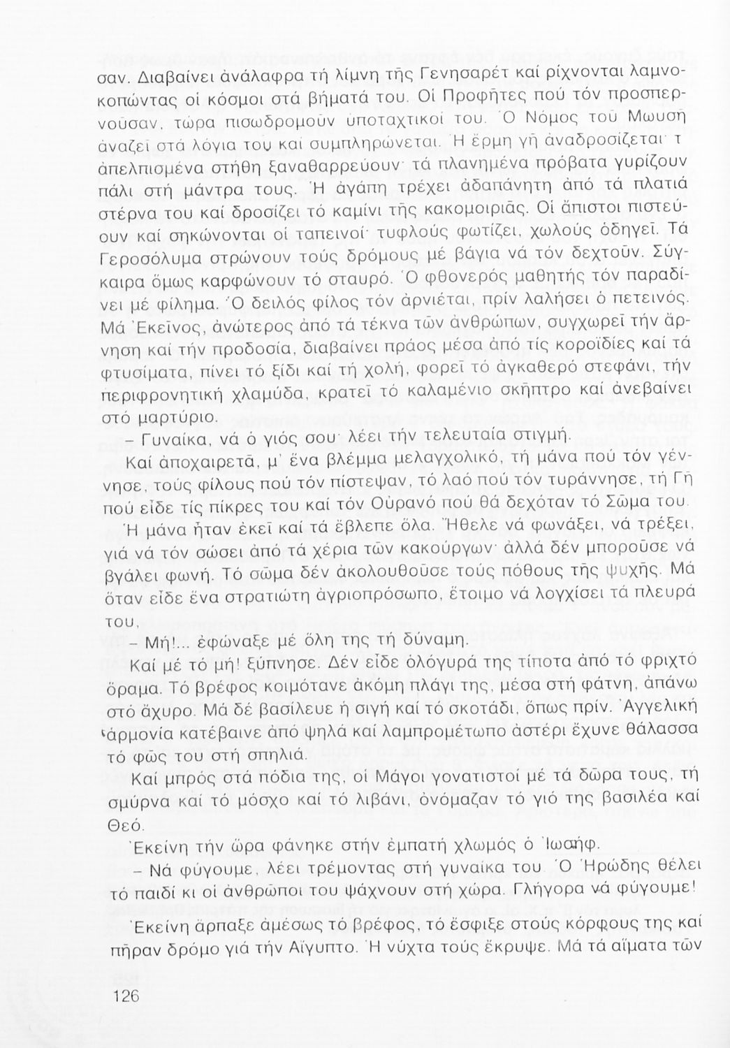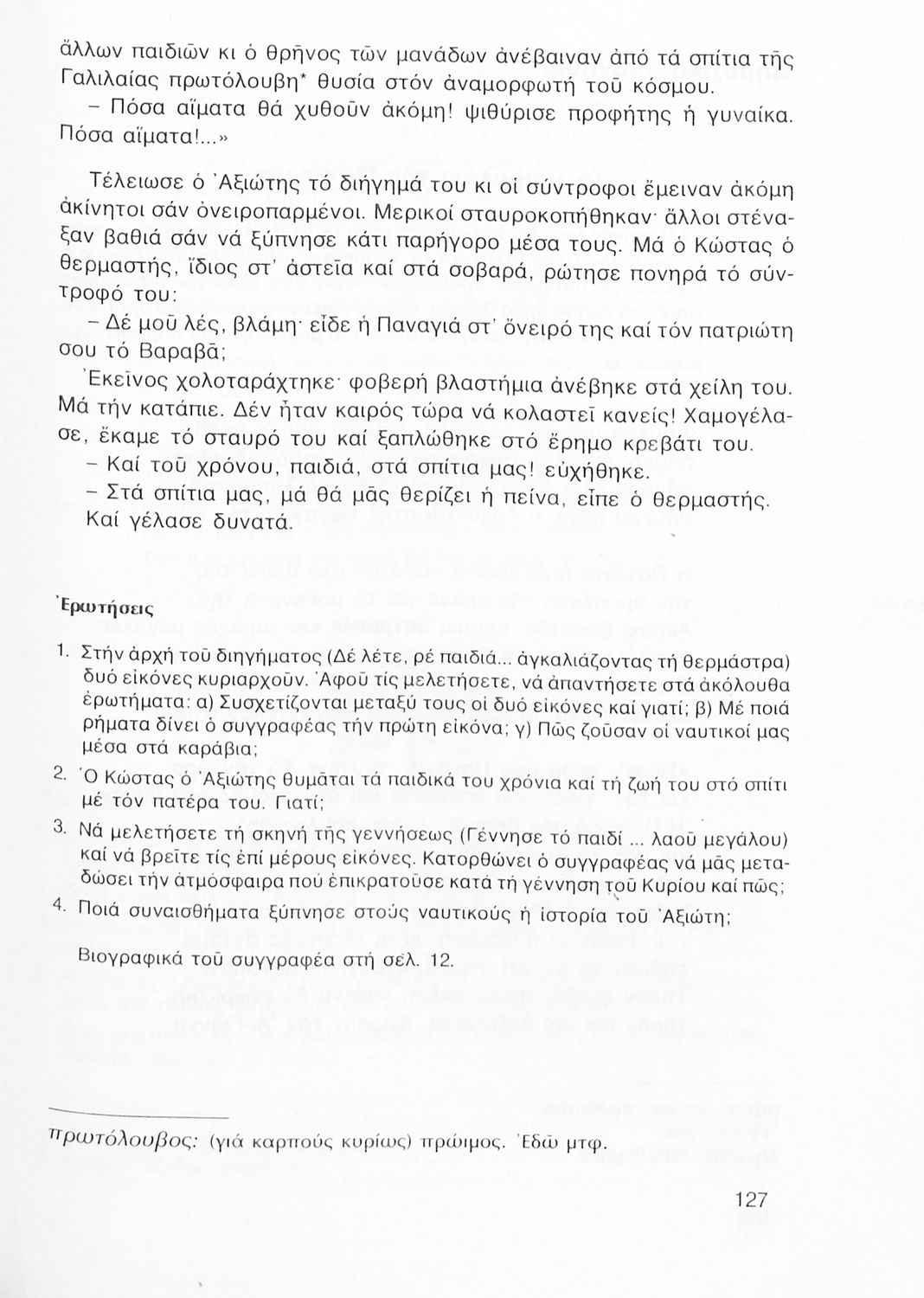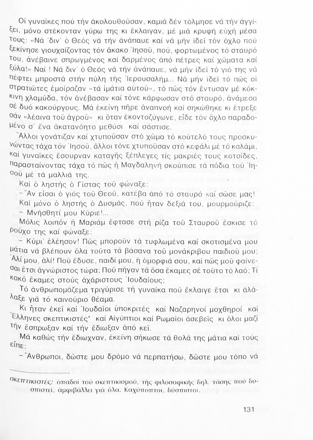 Σχολικό εγχειρίδιο Νέων Ελληνικών Β' Γυμνασίου που περιέχει δημοτικά τραγούδια, πεζά, δοκίμια και ποιήματα σύγχρονων Ελλήνων συγγραφέων και είναι χωρισμένο σε θεματικές ενότητες όπως η πόλη και η ύπαιθρος, η εποχή του 40' και η κατοχή, η θρησκευτική ζωή, ο καημός της ξενιτιάς, ο ελληνισμός έξω από τα σύνορα, οι αγώνες Ακριτών-Κλεφτών κ.α. Περιλαμβάνει και έργα ευρωπαίων λογοτεχνών.