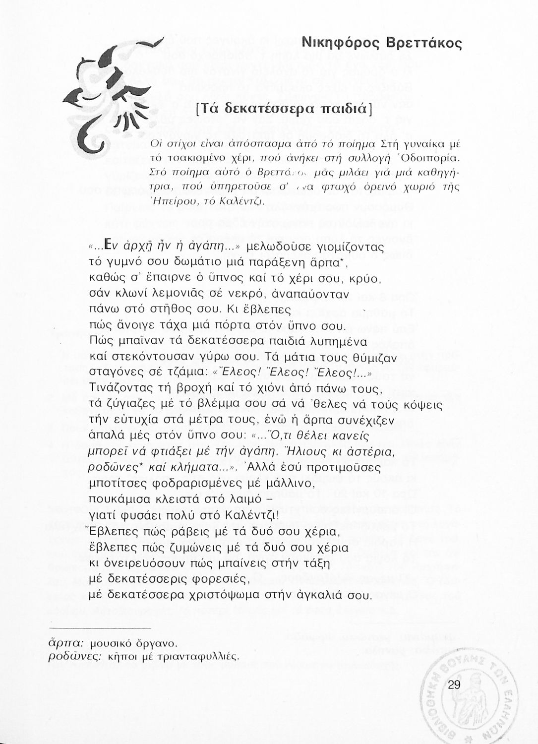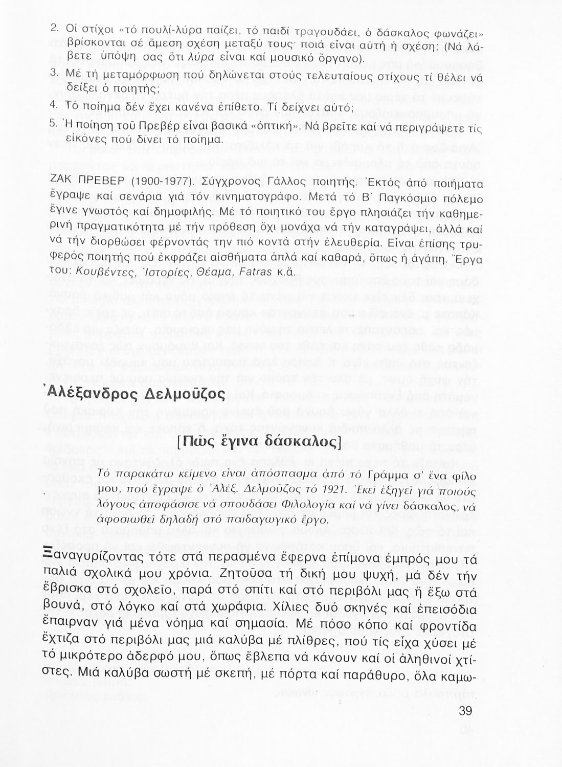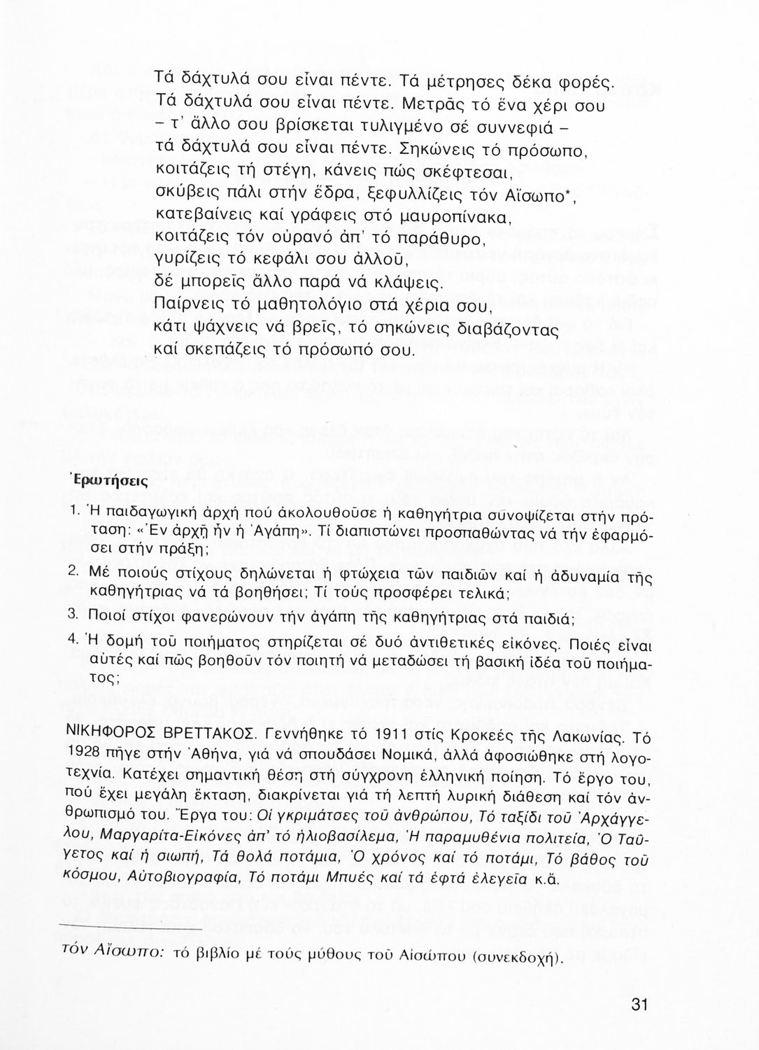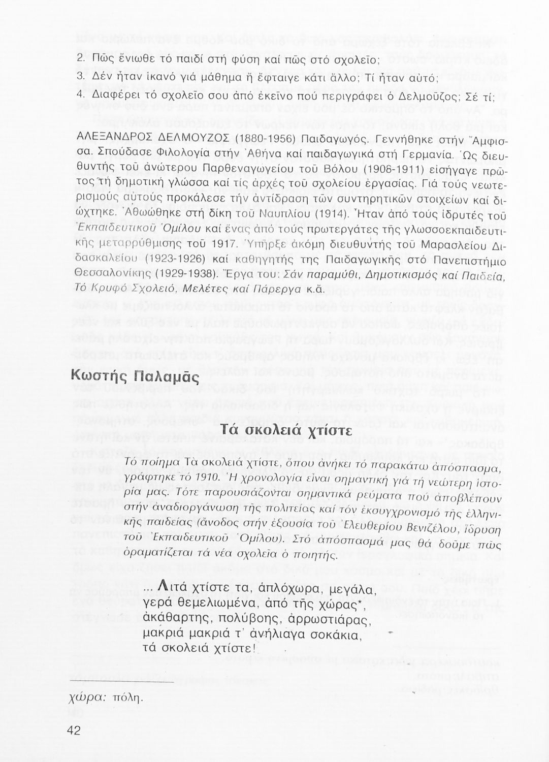 Σχολικό εγχειρίδιο Νέων Ελληνικών Β' Γυμνασίου που περιέχει δημοτικά τραγούδια, πεζά, δοκίμια και ποιήματα σύγχρονων Ελλήνων συγγραφέων και είναι χωρισμένο σε θεματικές ενότητες όπως η πόλη και η ύπαιθρος, η εποχή του 40' και η κατοχή, η θρησκευτική ζωή, ο καημός της ξενιτιάς, ο ελληνισμός έξω από τα σύνορα, οι αγώνες Ακριτών-Κλεφτών κ.α. Περιλαμβάνει και έργα ευρωπαίων λογοτεχνών.