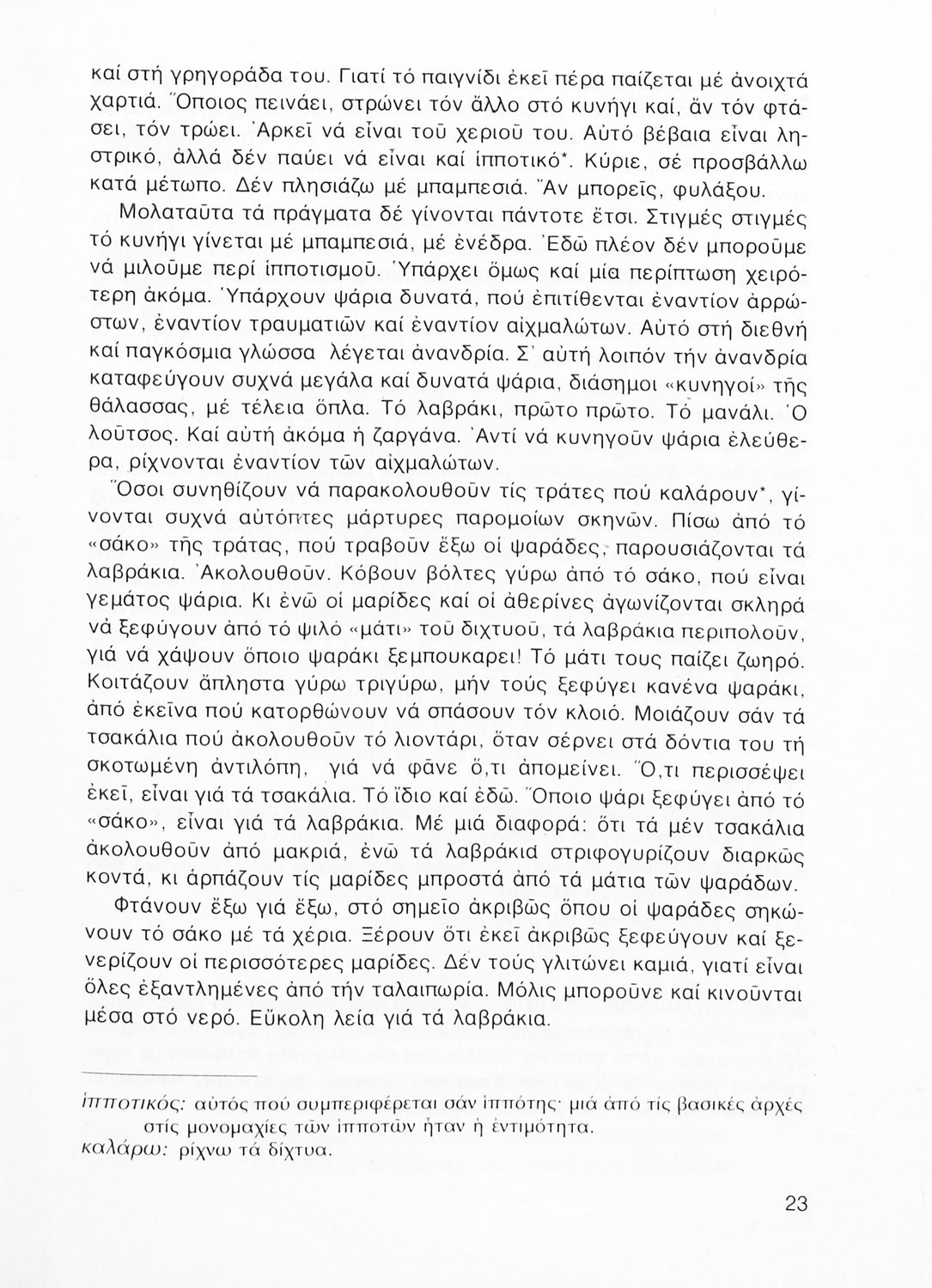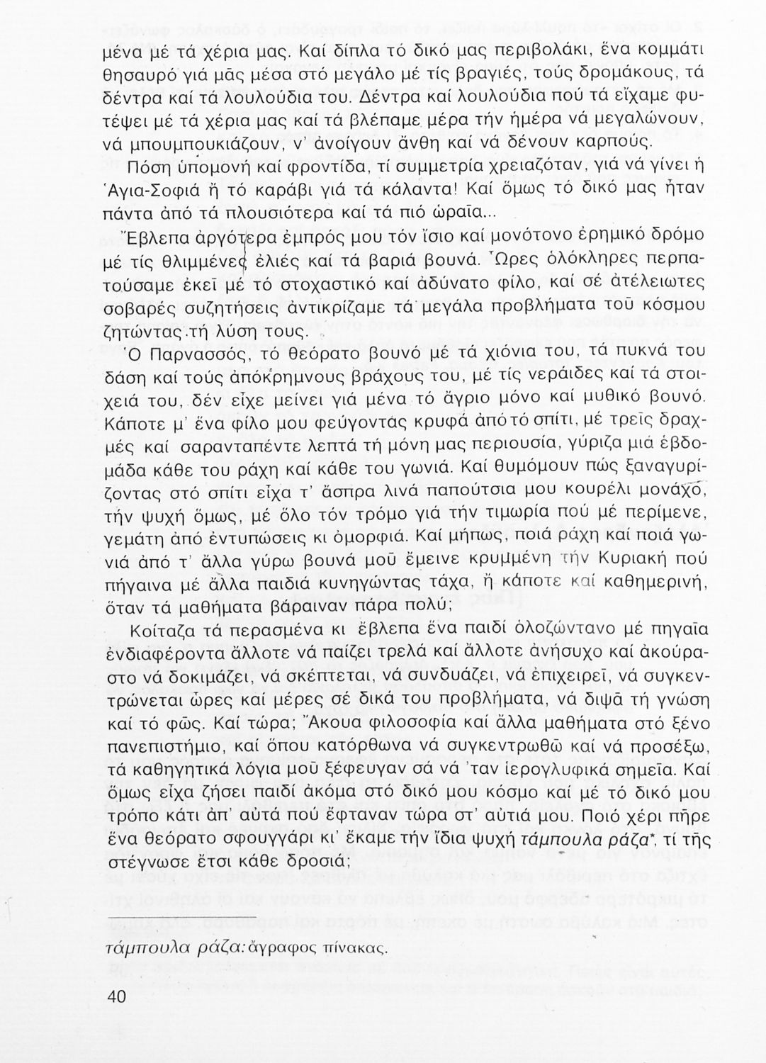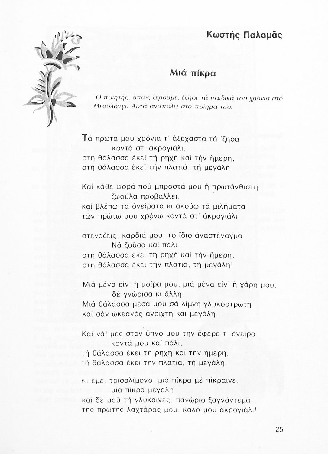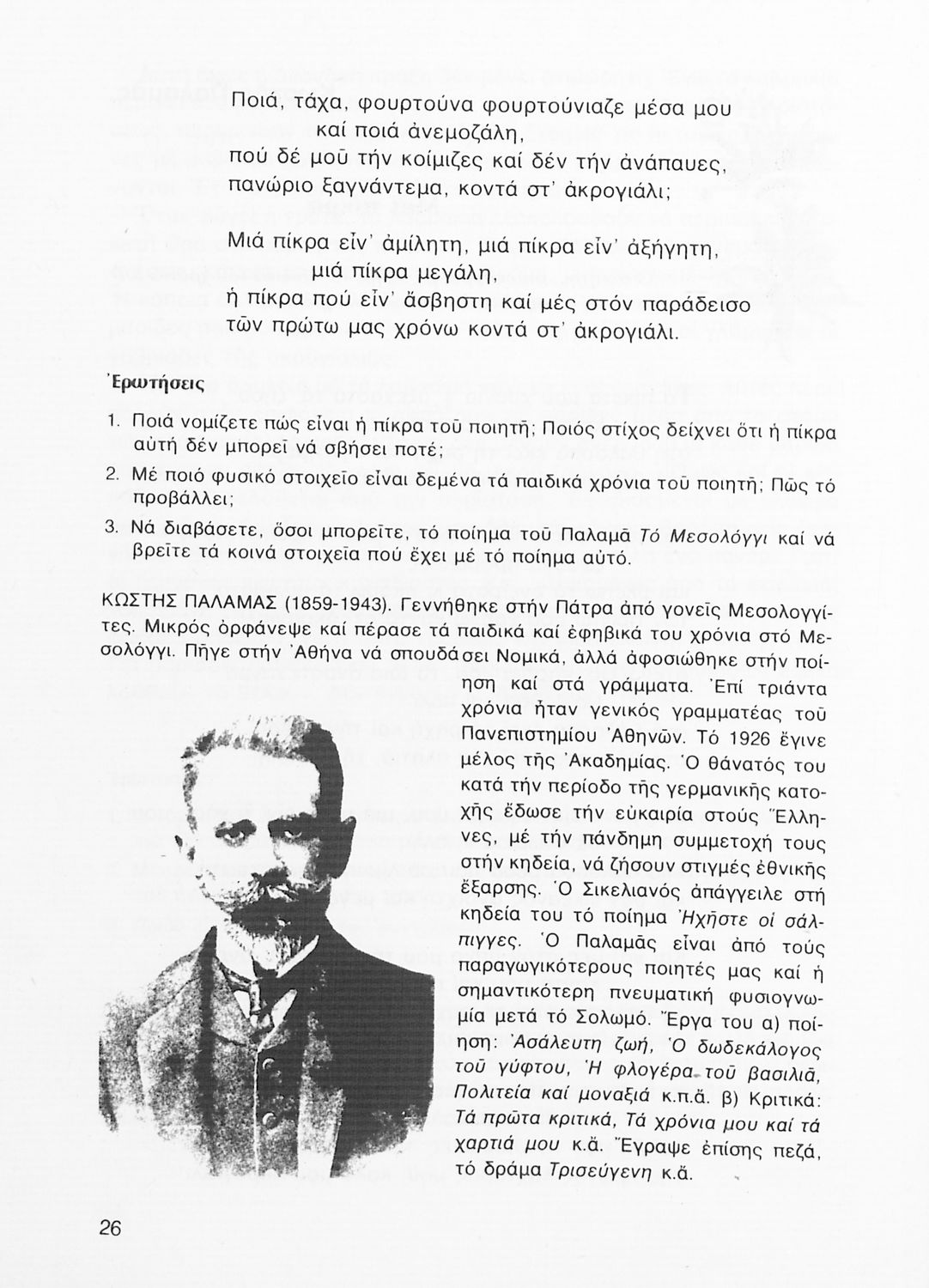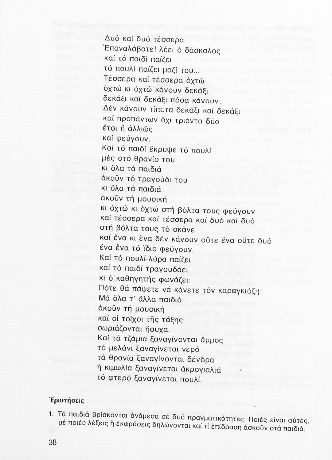 Σχολικό εγχειρίδιο Νέων Ελληνικών Β' Γυμνασίου που περιέχει δημοτικά τραγούδια, πεζά, δοκίμια και ποιήματα σύγχρονων Ελλήνων συγγραφέων και είναι χωρισμένο σε θεματικές ενότητες όπως η πόλη και η ύπαιθρος, η εποχή του 40' και η κατοχή, η θρησκευτική ζωή, ο καημός της ξενιτιάς, ο ελληνισμός έξω από τα σύνορα, οι αγώνες Ακριτών-Κλεφτών κ.α. Περιλαμβάνει και έργα ευρωπαίων λογοτεχνών.