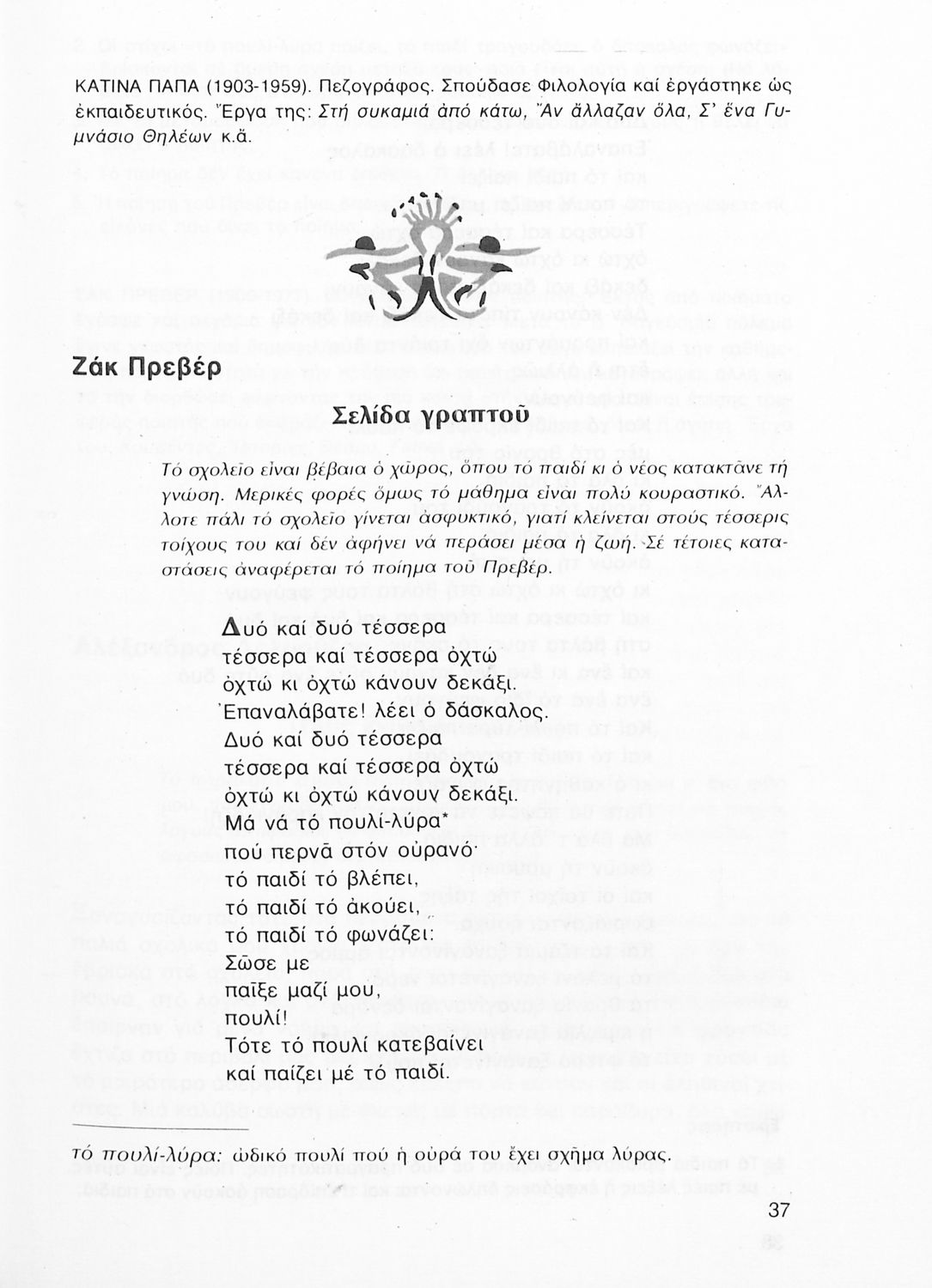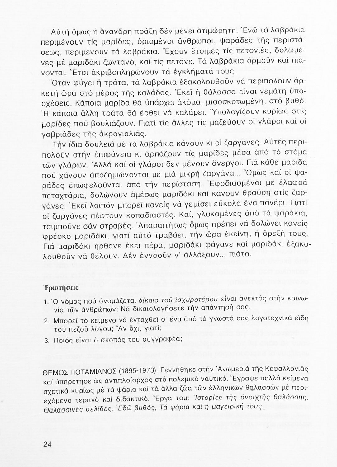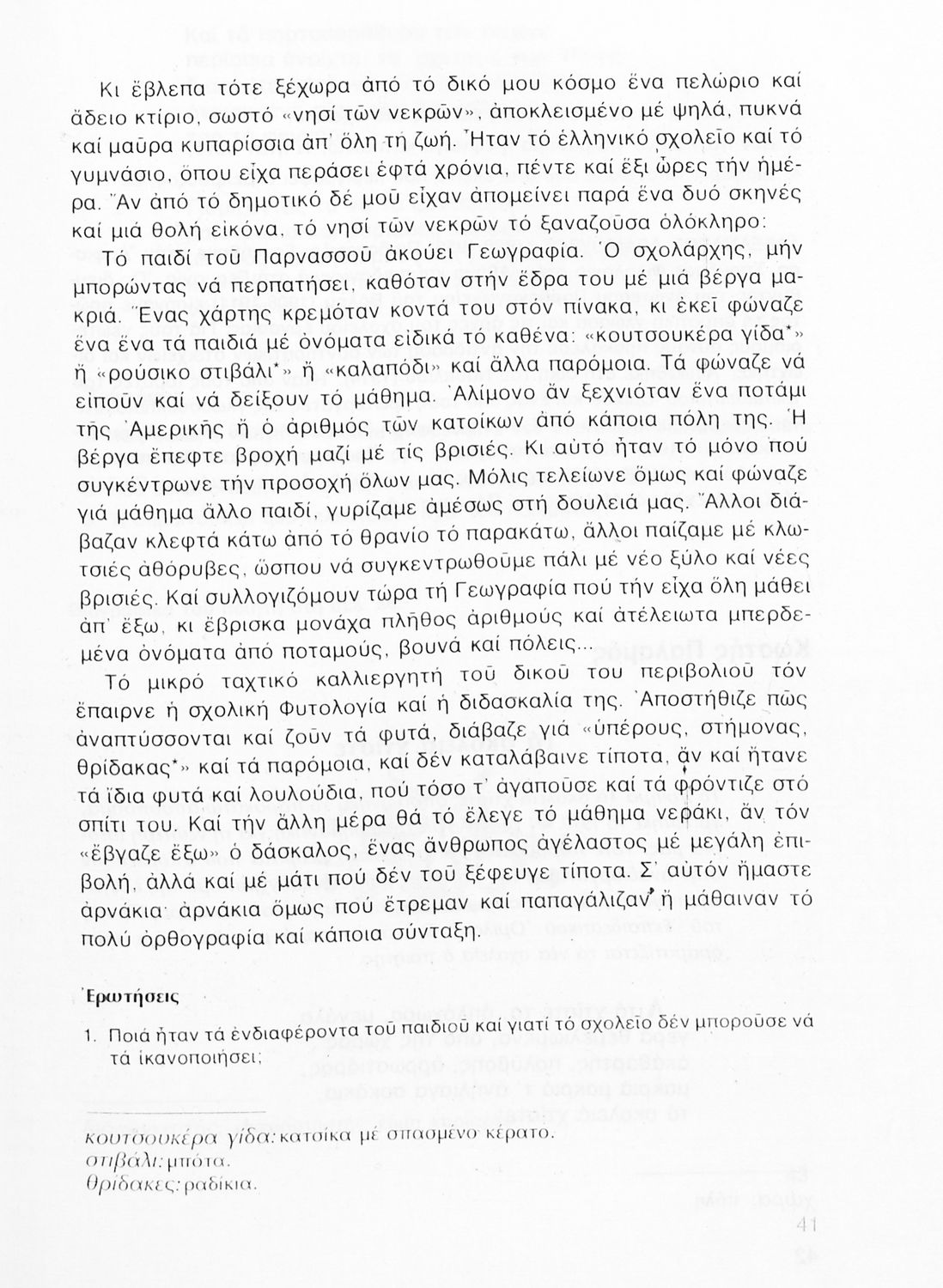 Σχολικό εγχειρίδιο Νέων Ελληνικών Α΄ Γυμνασίου που περιλαμβάνει δοκίμια, πεζά και ποιήματα Ελλήνων συγγραφέων και δημοτικά τραγούδια εμπνευσμένα από τη θρησκευτική, εθνική και κοινωνική ζωή, τη "δοκιμασία της ...