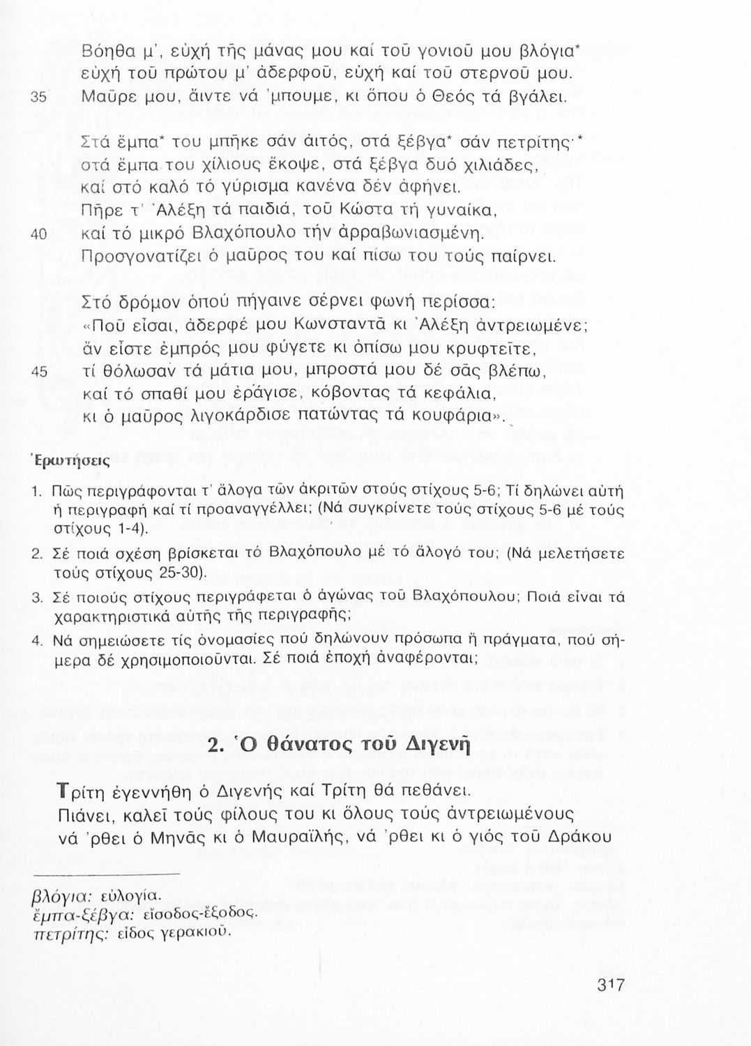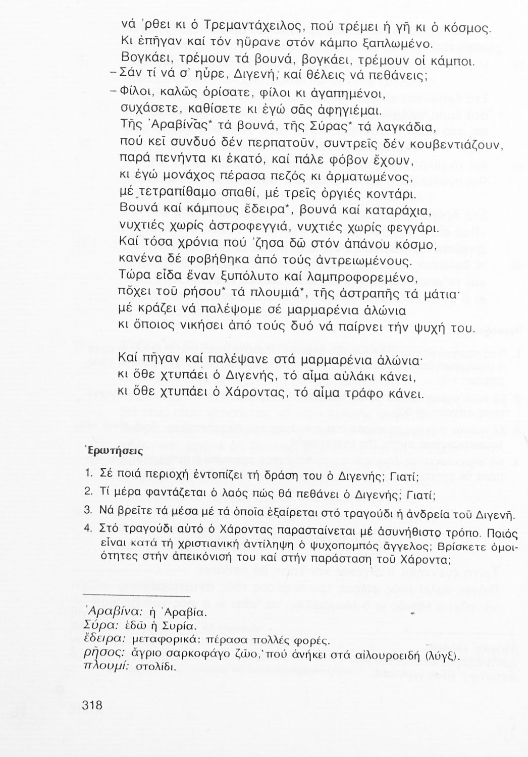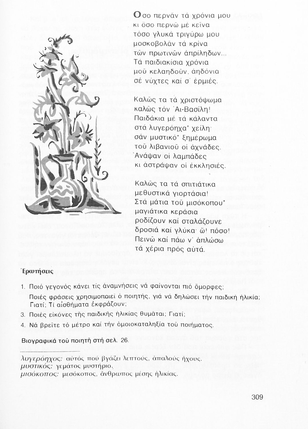 Σχολικό εγχειρίδιο Νέων Ελληνικών Β' Γυμνασίου που περιέχει δημοτικά τραγούδια, πεζά, δοκίμια και ποιήματα σύγχρονων Ελλήνων συγγραφέων και είναι χωρισμένο σε θεματικές ενότητες όπως η πόλη και η ύπαιθρος, η εποχή του 40' και η κατοχή, η θρησκευτική ζωή, ο καημός της ξενιτιάς, ο ελληνισμός έξω από τα σύνορα, οι αγώνες Ακριτών-Κλεφτών κ.α. Περιλαμβάνει και έργα ευρωπαίων λογοτεχνών.