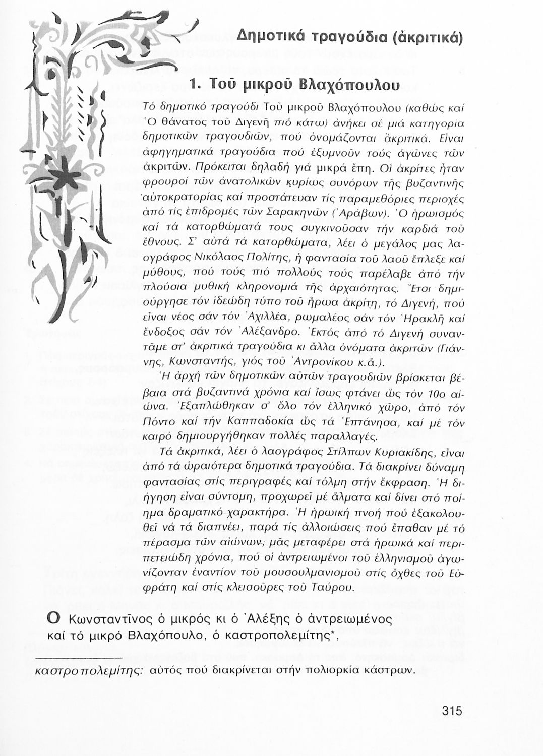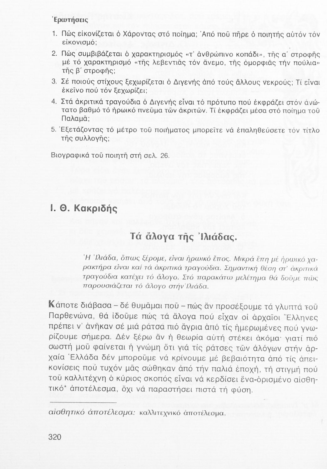 Σχολικό εγχειρίδιο Νέων Ελληνικών Α΄ Γυμνασίου που περιλαμβάνει δοκίμια, πεζά και ποιήματα Ελλήνων συγγραφέων και δημοτικά τραγούδια εμπνευσμένα από τη θρησκευτική, εθνική και κοινωνική ζωή, τη "δοκιμασία της ...