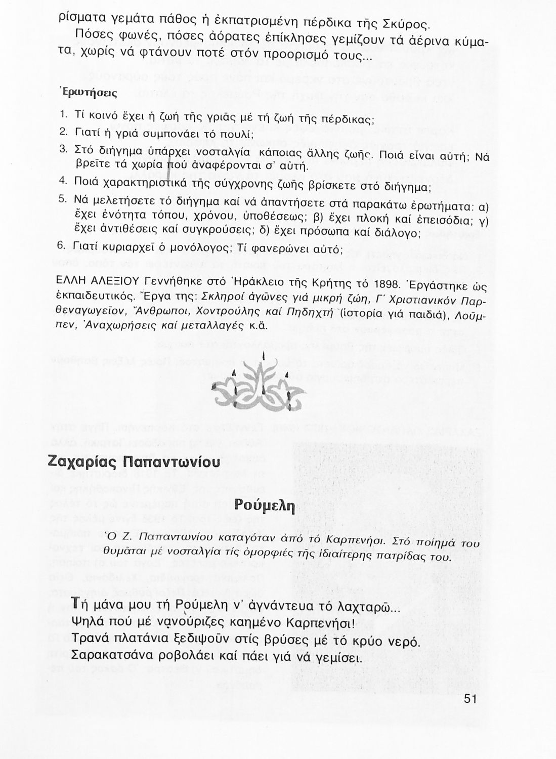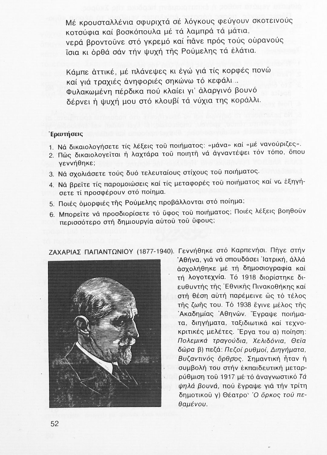 Σχολικό εγχειρίδιο Νέων Ελληνικών Β' Γυμνασίου που περιέχει δημοτικά τραγούδια, πεζά, δοκίμια και ποιήματα σύγχρονων Ελλήνων συγγραφέων και είναι χωρισμένο σε θεματικές ενότητες όπως η πόλη και η ύπαιθρος, η εποχή του 40' και η κατοχή, η θρησκευτική ζωή, ο καημός της ξενιτιάς, ο ελληνισμός έξω από τα σύνορα, οι αγώνες Ακριτών-Κλεφτών κ.α. Περιλαμβάνει και έργα ευρωπαίων λογοτεχνών.