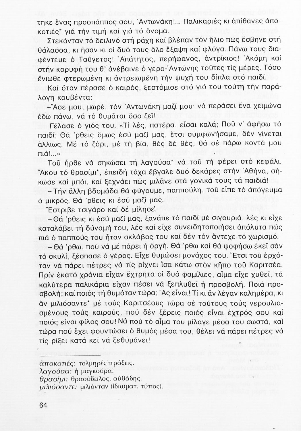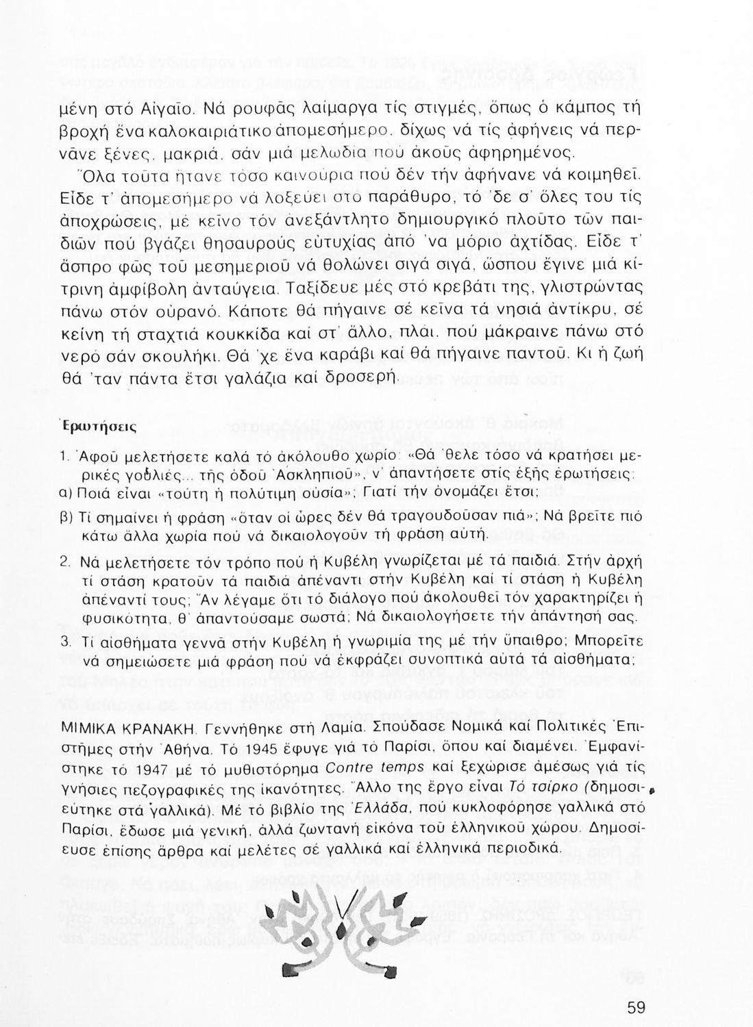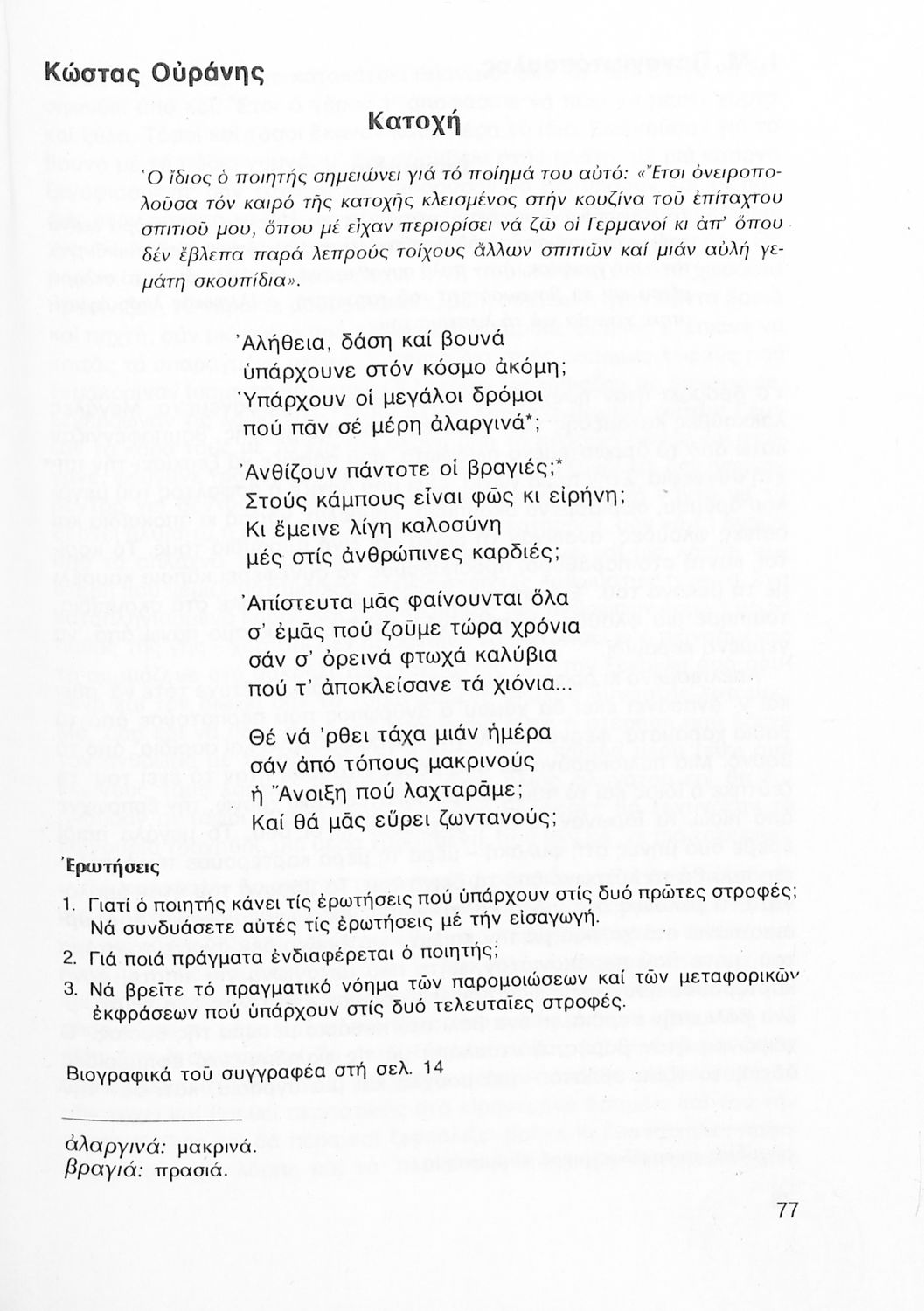 Σχολικό εγχειρίδιο Νέων Ελληνικών Β' Γυμνασίου που περιέχει δημοτικά τραγούδια, πεζά, δοκίμια και ποιήματα σύγχρονων Ελλήνων συγγραφέων και είναι χωρισμένο σε θεματικές ενότητες όπως η πόλη και η ύπαιθρος, η εποχή του 40' και η κατοχή, η θρησκευτική ζωή, ο καημός της ξενιτιάς, ο ελληνισμός έξω από τα σύνορα, οι αγώνες Ακριτών-Κλεφτών κ.α. Περιλαμβάνει και έργα ευρωπαίων λογοτεχνών.
