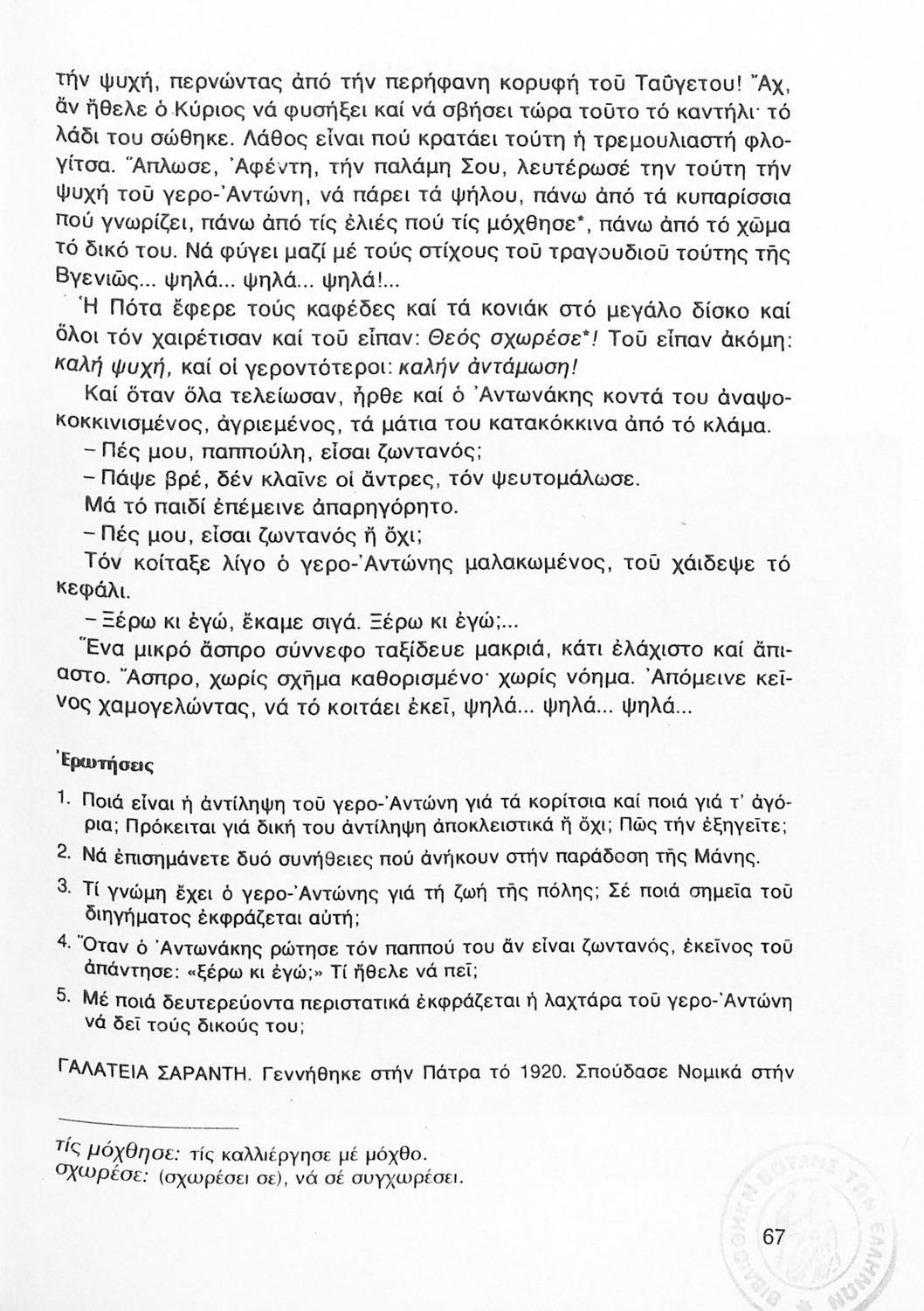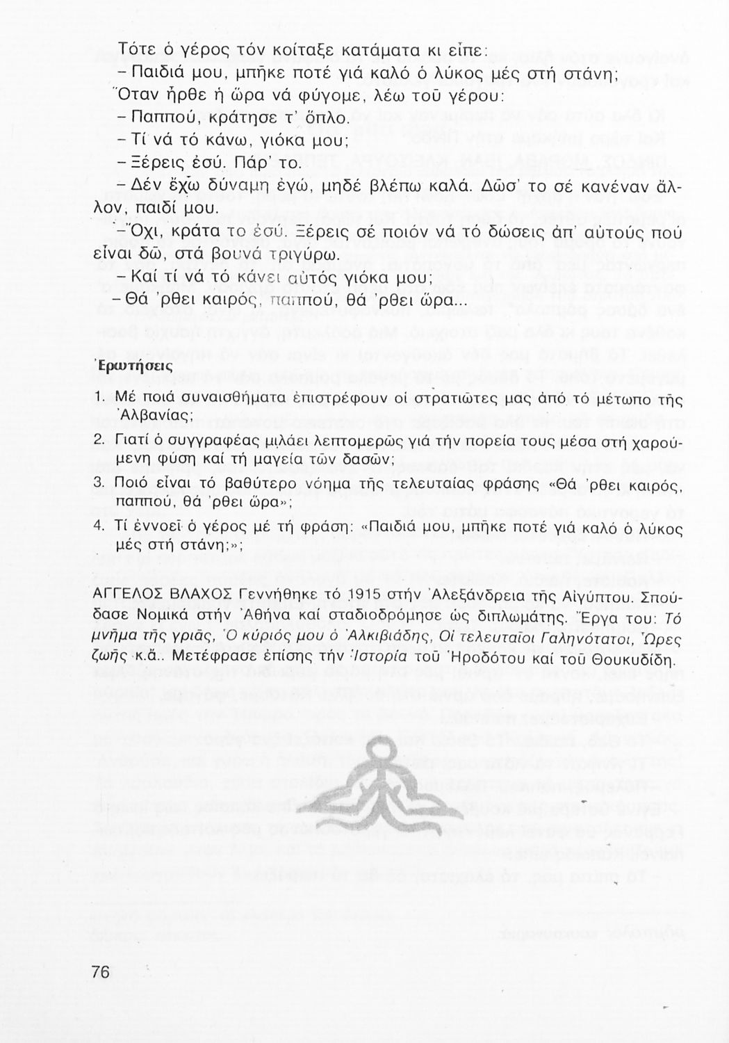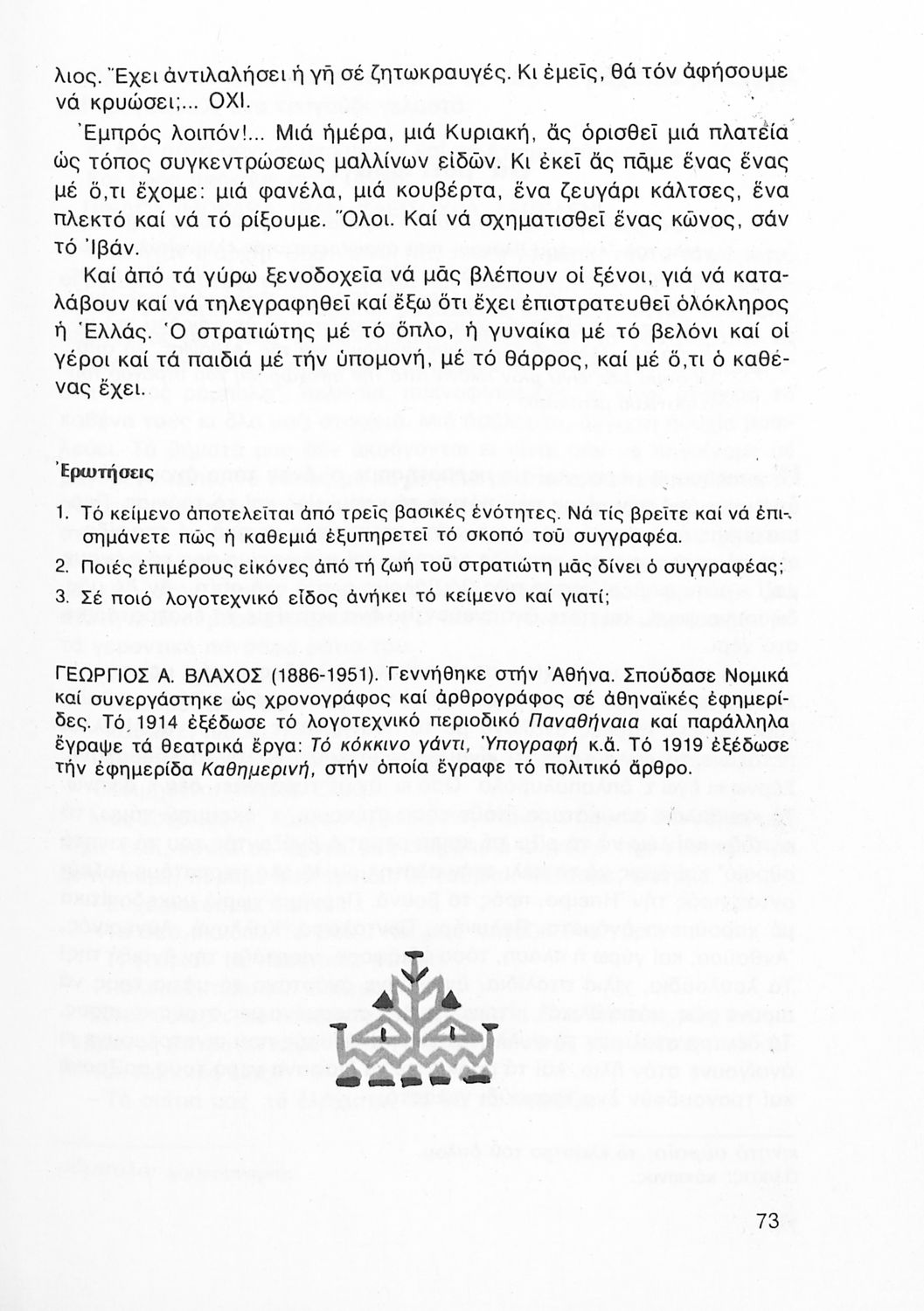 Σχολικό εγχειρίδιο Νέων Ελληνικών Α΄ Γυμνασίου που περιλαμβάνει δοκίμια, πεζά και ποιήματα Ελλήνων συγγραφέων και δημοτικά τραγούδια εμπνευσμένα από τη θρησκευτική, εθνική και κοινωνική ζωή, τη "δοκιμασία της ...