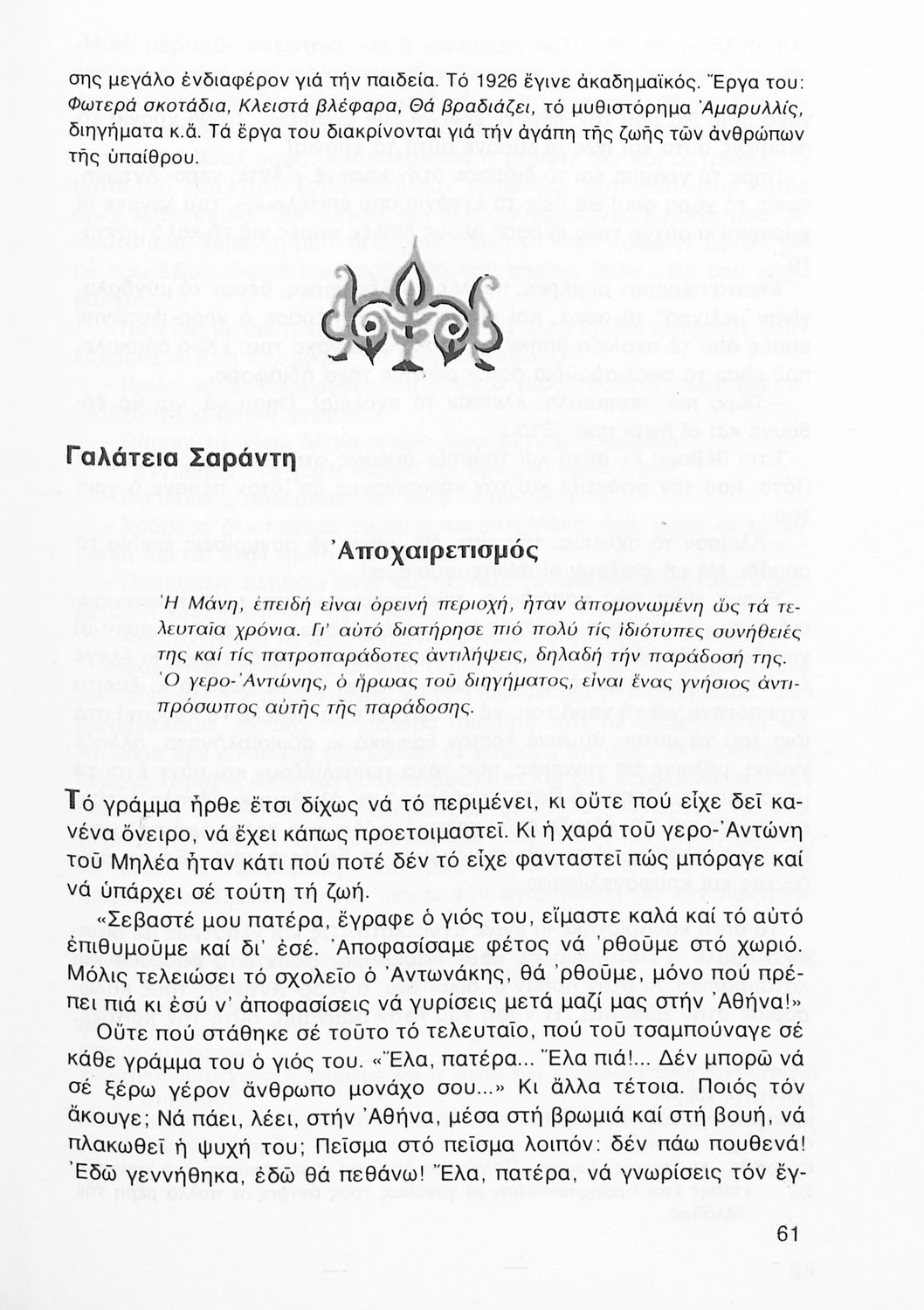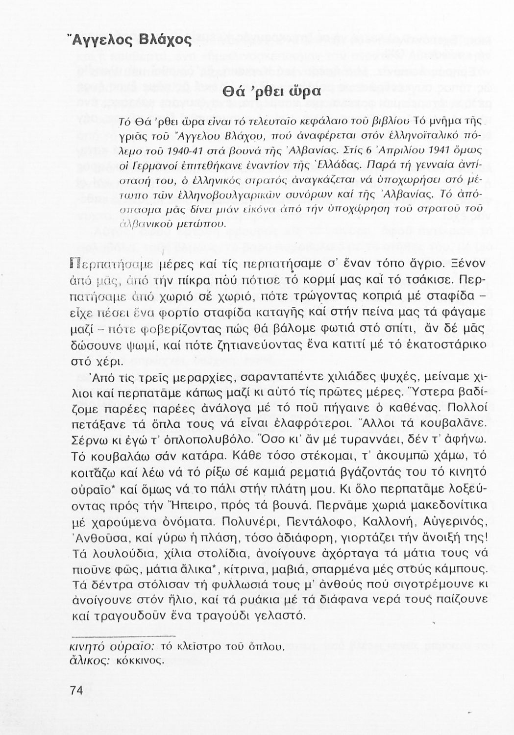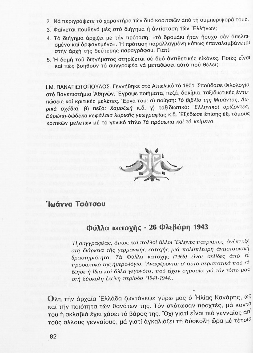 Σχολικό εγχειρίδιο Νέων Ελληνικών Α΄ Γυμνασίου που περιλαμβάνει δοκίμια, πεζά και ποιήματα Ελλήνων συγγραφέων και δημοτικά τραγούδια εμπνευσμένα από τη θρησκευτική, εθνική και κοινωνική ζωή, τη "δοκιμασία της ...