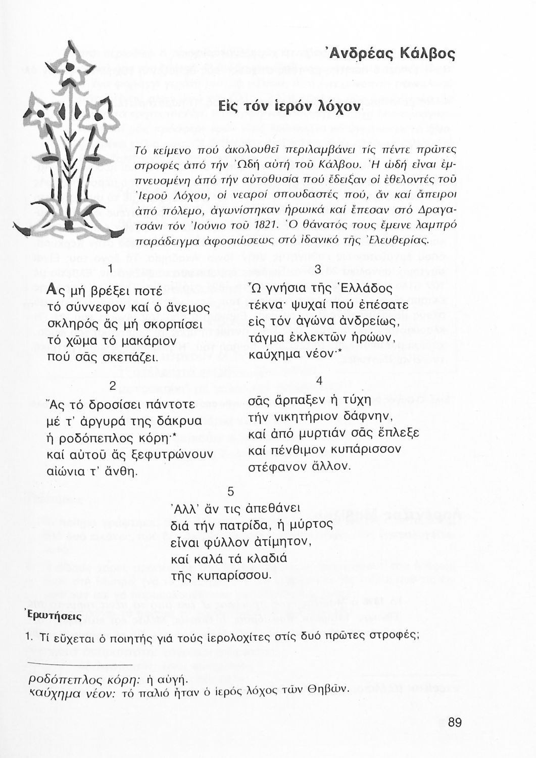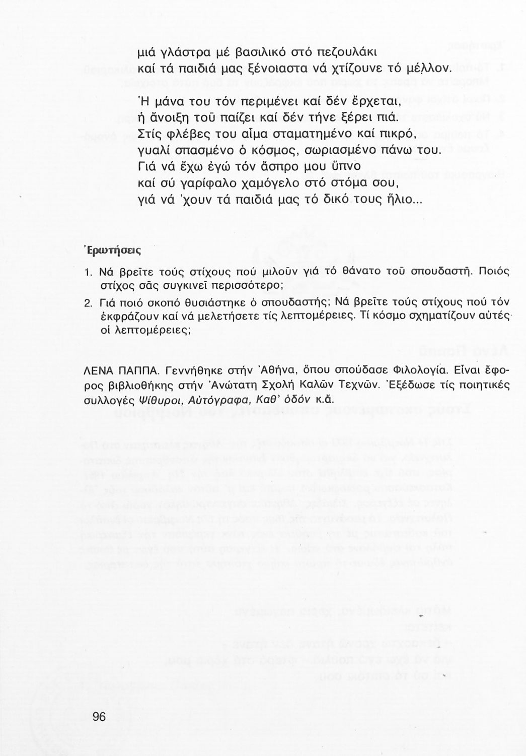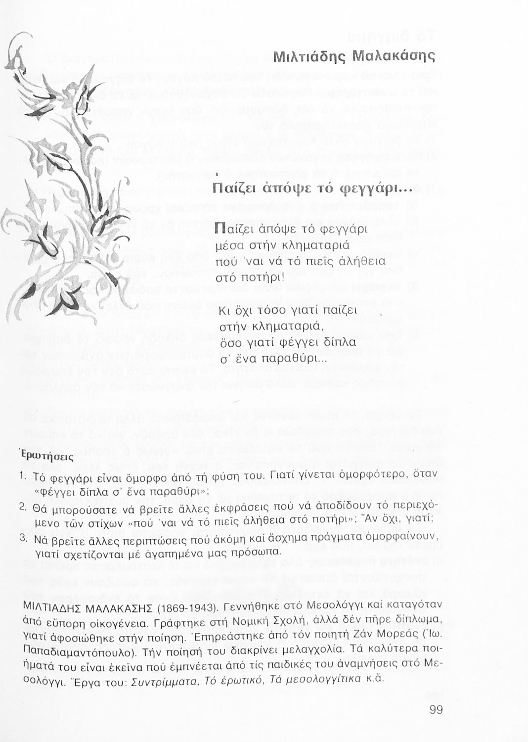 Σχολικό εγχειρίδιο Νέων Ελληνικών Β' Γυμνασίου που περιέχει δημοτικά τραγούδια, πεζά, δοκίμια και ποιήματα σύγχρονων Ελλήνων συγγραφέων και είναι χωρισμένο σε θεματικές ενότητες όπως η πόλη και η ύπαιθρος, η εποχή του 40' και η κατοχή, η θρησκευτική ζωή, ο καημός της ξενιτιάς, ο ελληνισμός έξω από τα σύνορα, οι αγώνες Ακριτών-Κλεφτών κ.α. Περιλαμβάνει και έργα ευρωπαίων λογοτεχνών.